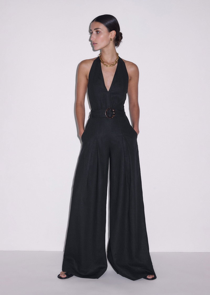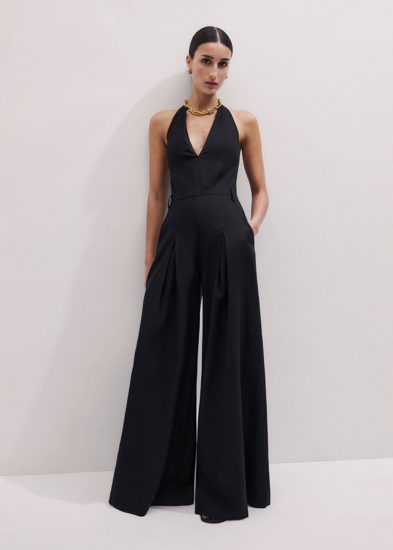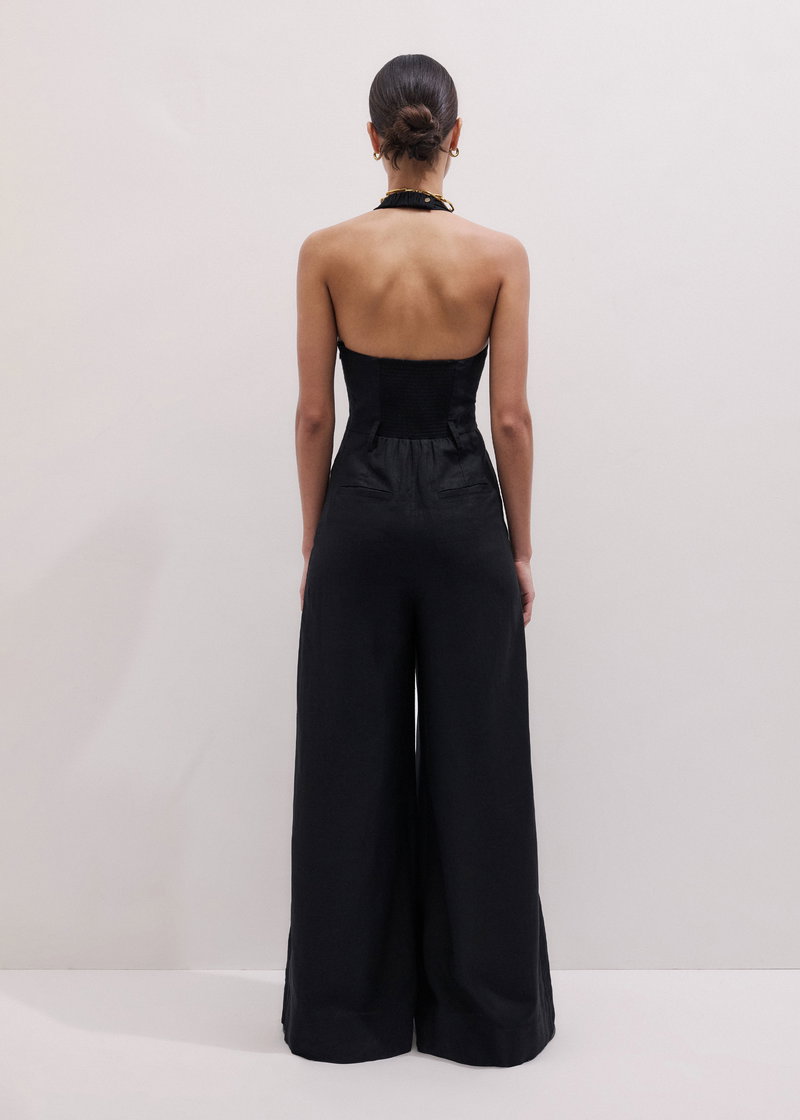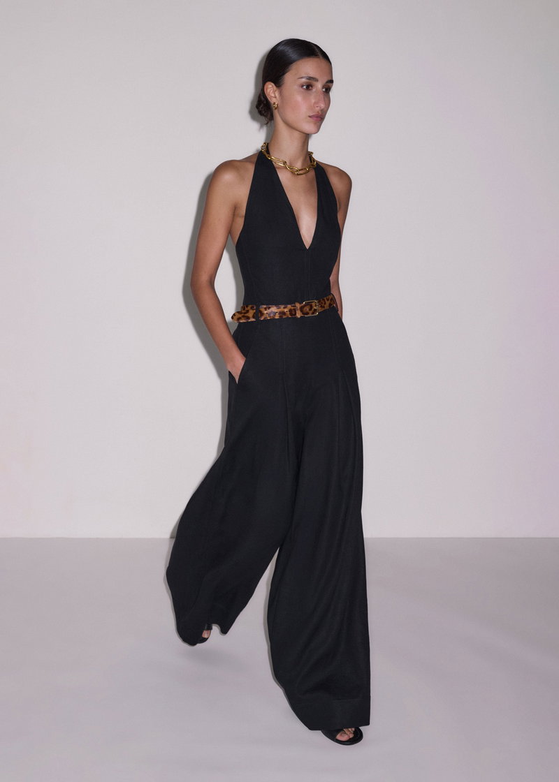 ME+EM's Black Crease-Less Linen Halterneck Wide Jumpsuit proves the importance of considered proportions through a smooth fit at the hips and a wide, fluid cut through the legs.