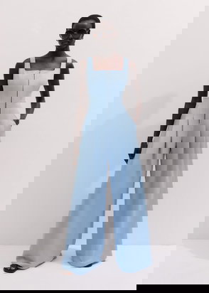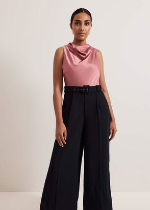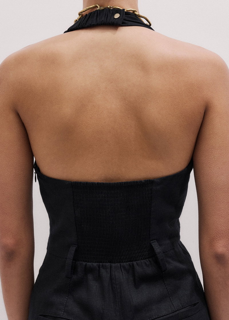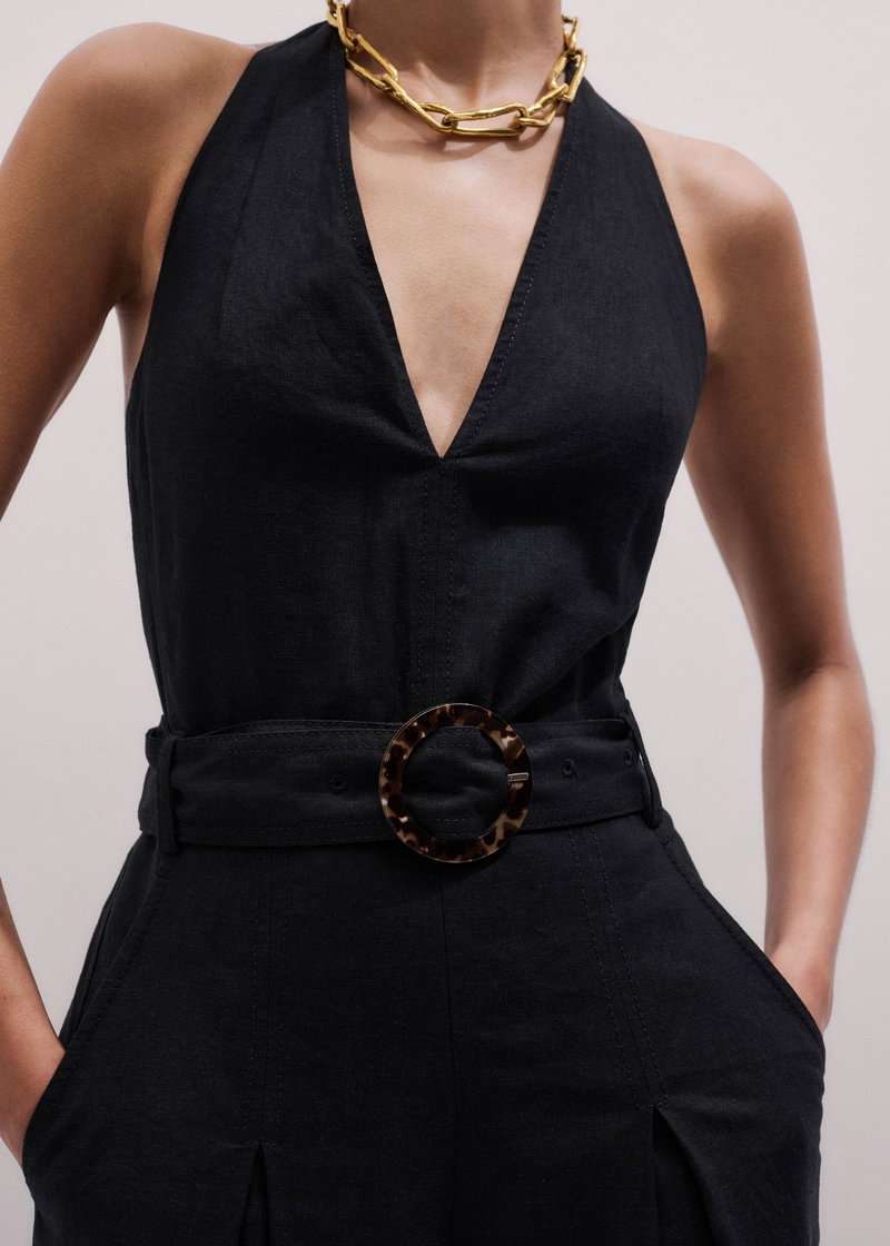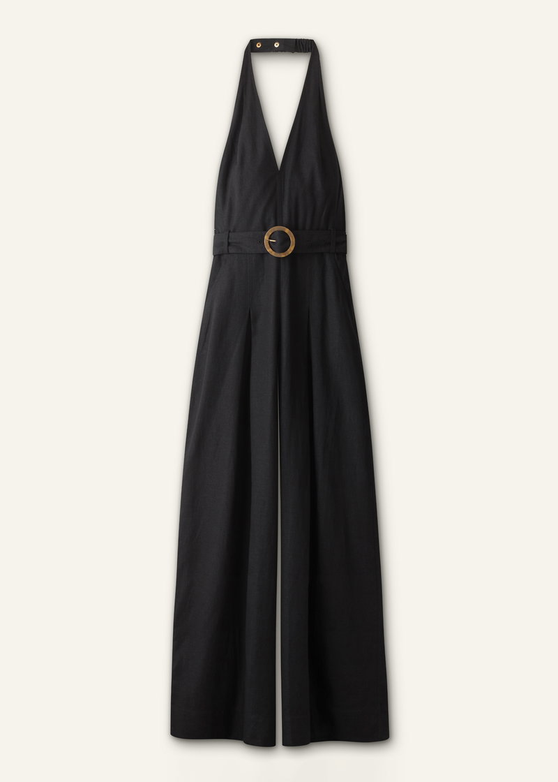 ME+EM's Black Crease-Less Linen Halterneck Wide Jumpsuit proves the importance of considered proportions through a smooth fit at the hips and a wide, fluid cut through the legs.