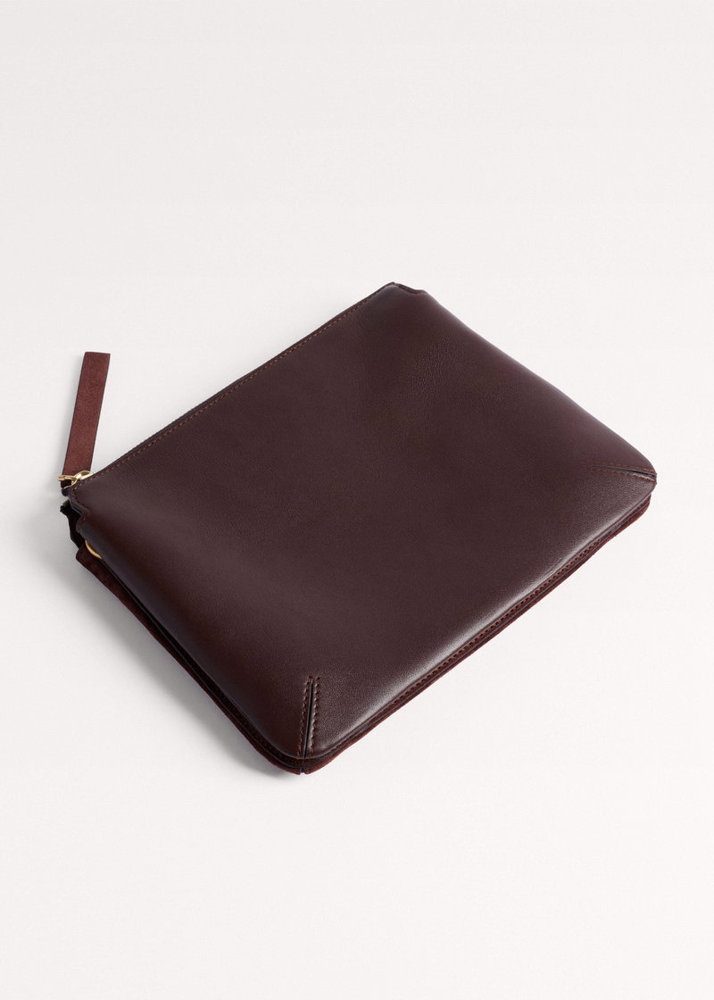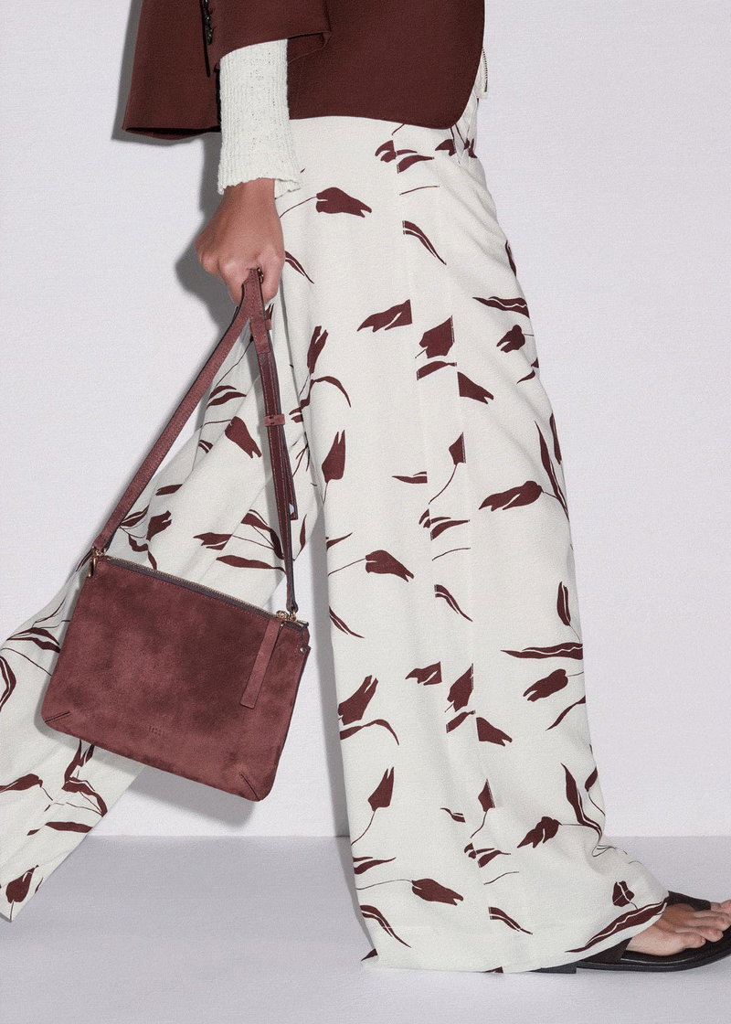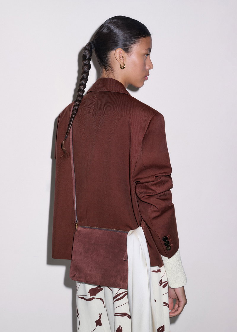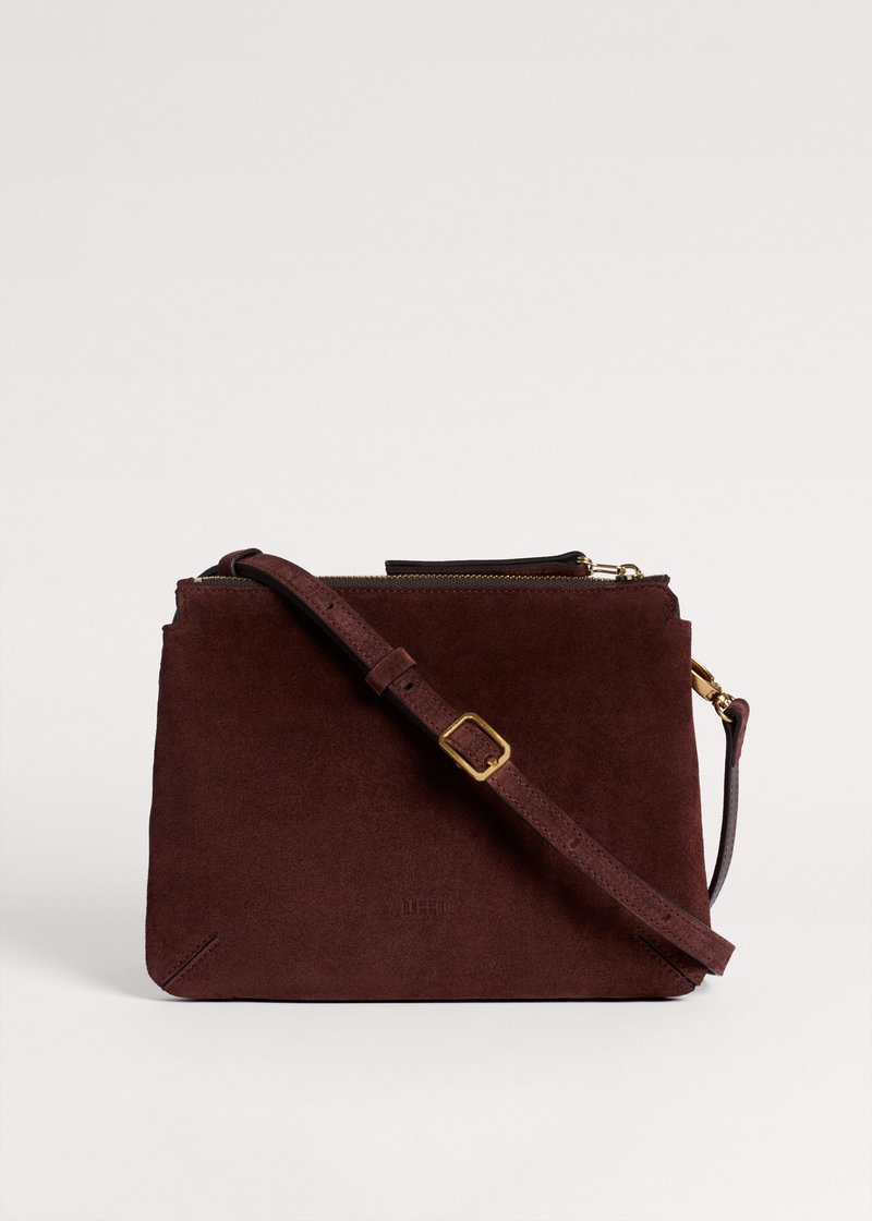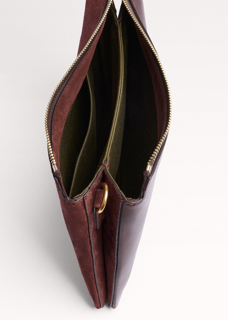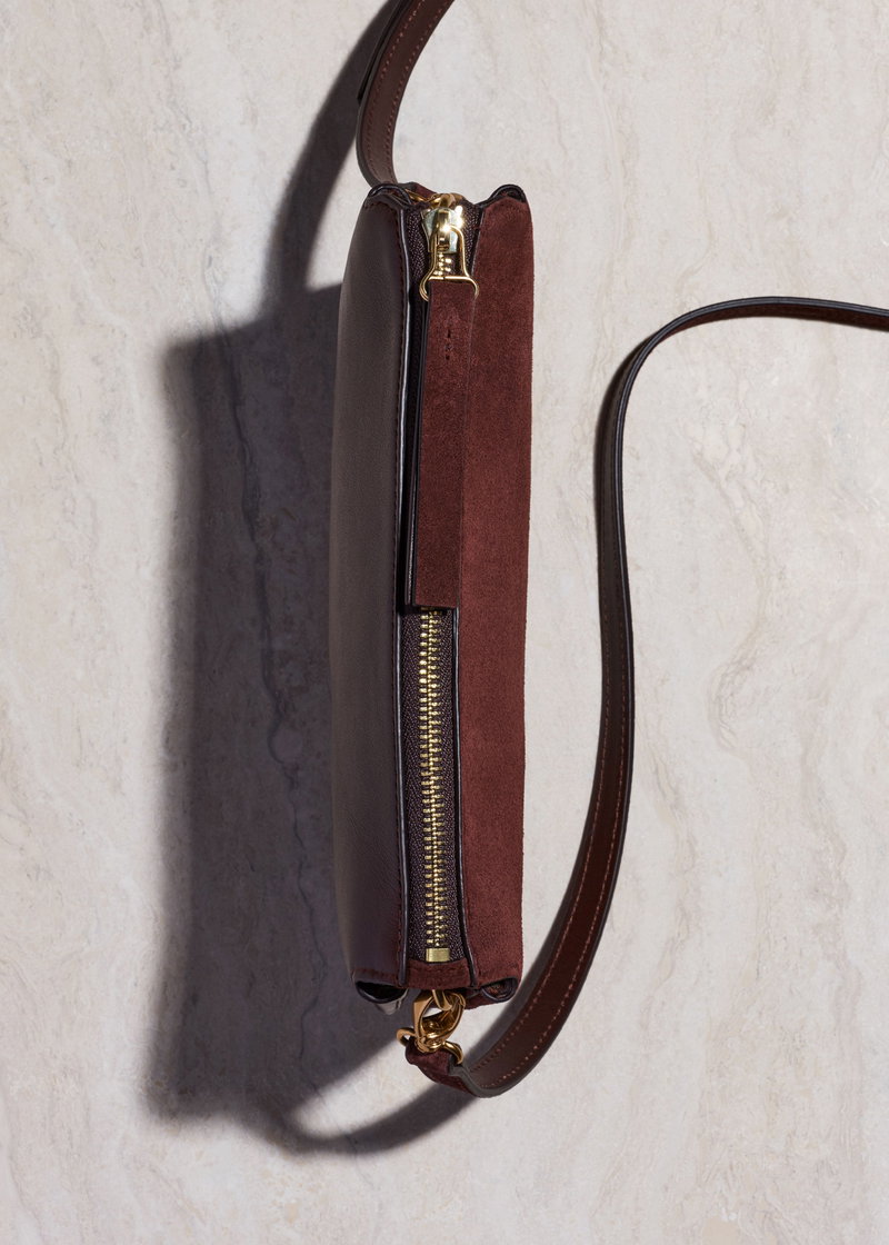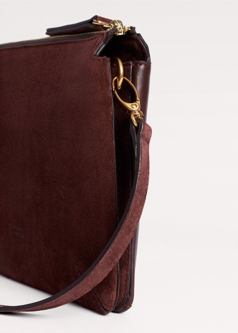 ME+EM's Dark Cinnamon Double Pouch Crossbody Bag is crafted with Italian suede on the front and contrasting leather on the back to avoid any colour transfer onto clothing.
