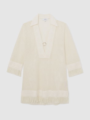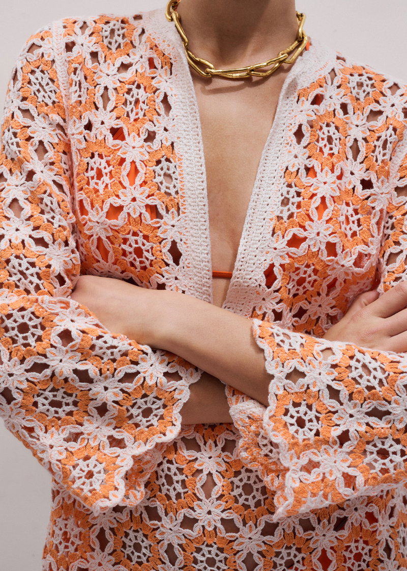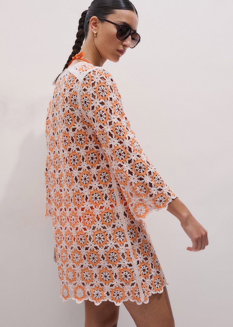 ME+EM's Orange Floral Crochet Mini Beach Dress can be layered over swimwear as a contemporary beach cover-up.