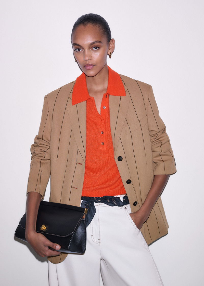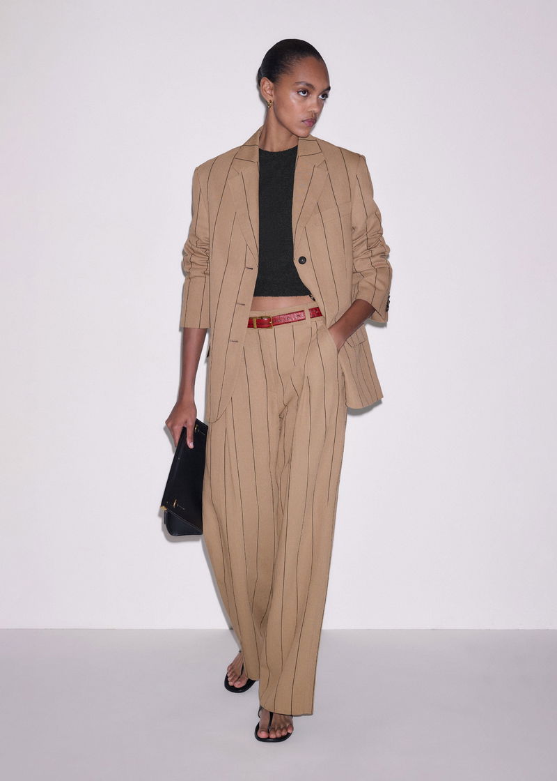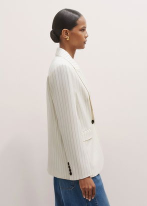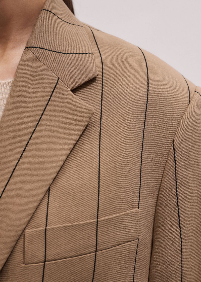 ME+EM's Tan Intelligently Oversized Pinstripe Blazer is intelligently scaled for an oversized fit that doesn’t overwhelm the figure.