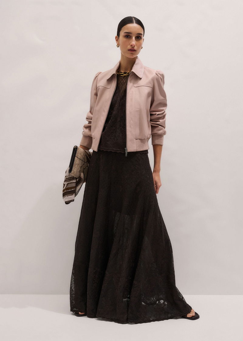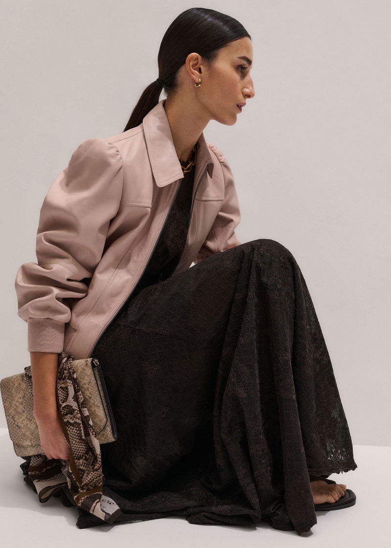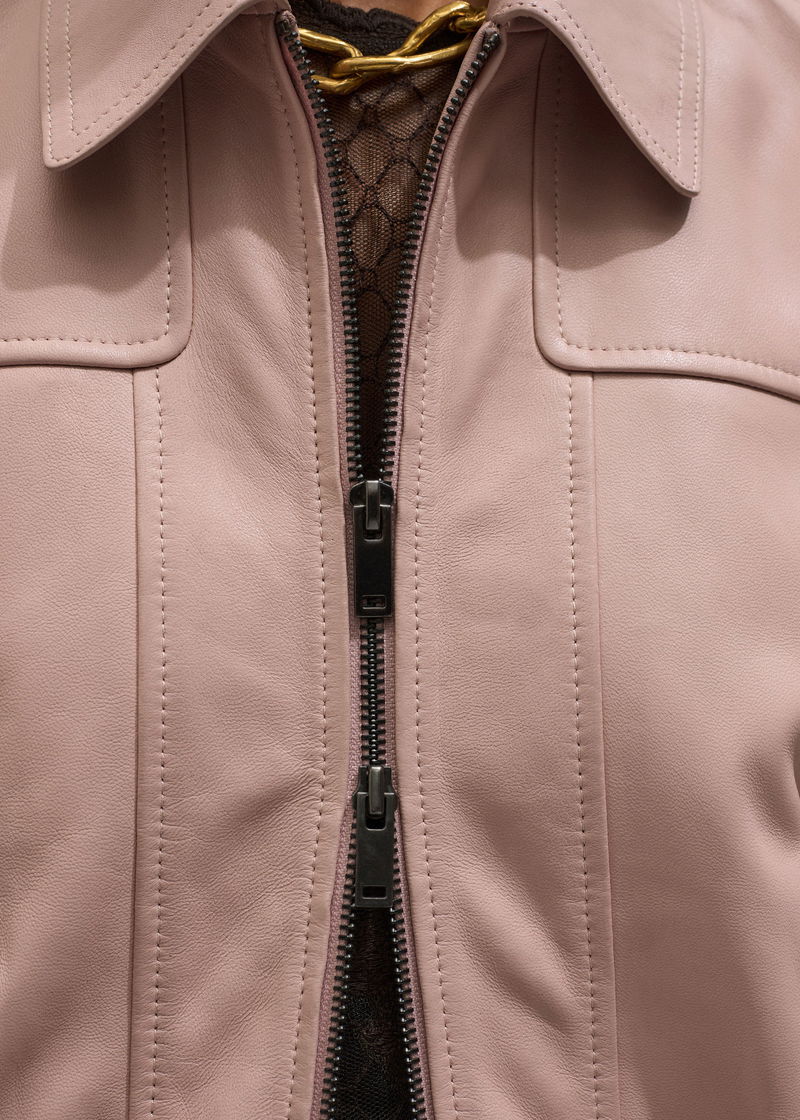 ME+EM's Pink Luxe Feminine Bomber Jacket is crafted from tactile leather in Blush Pink.