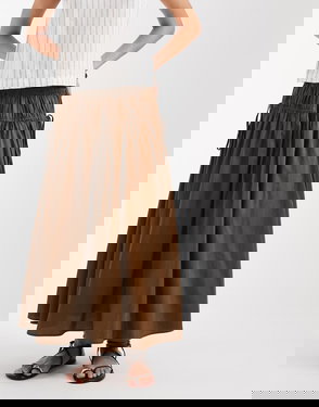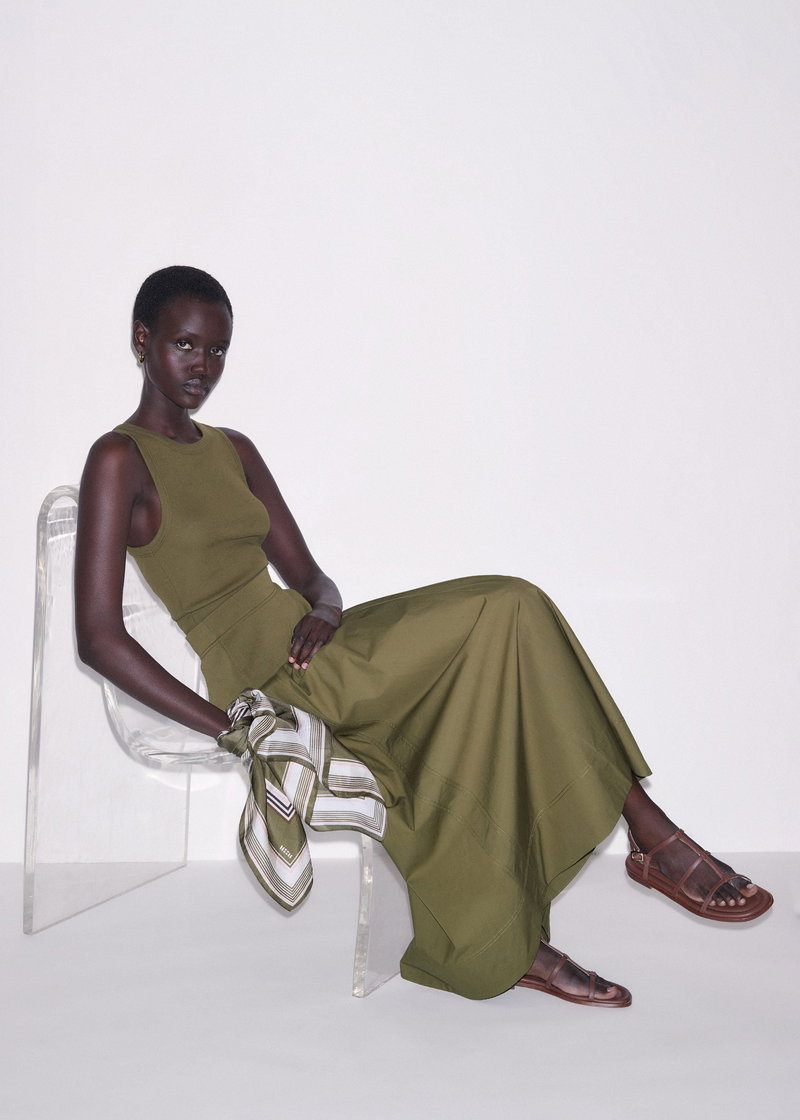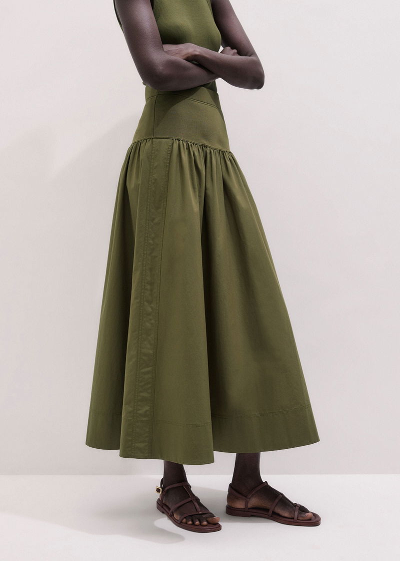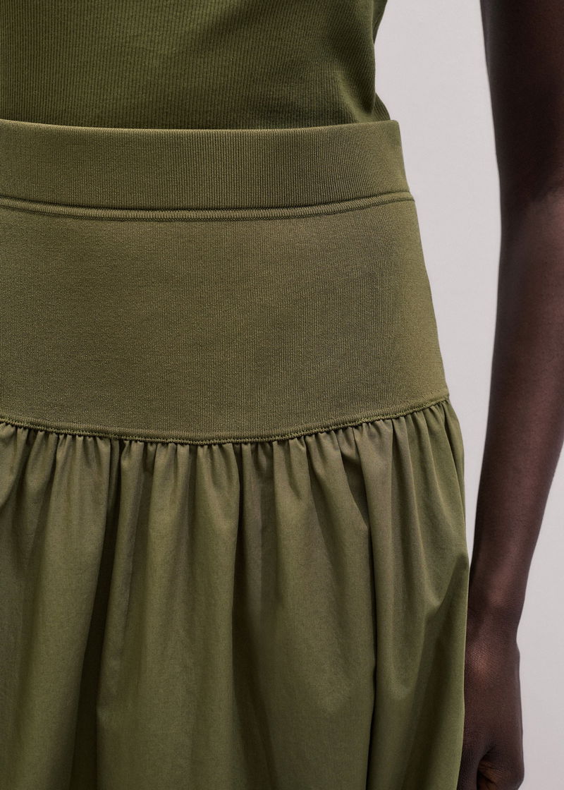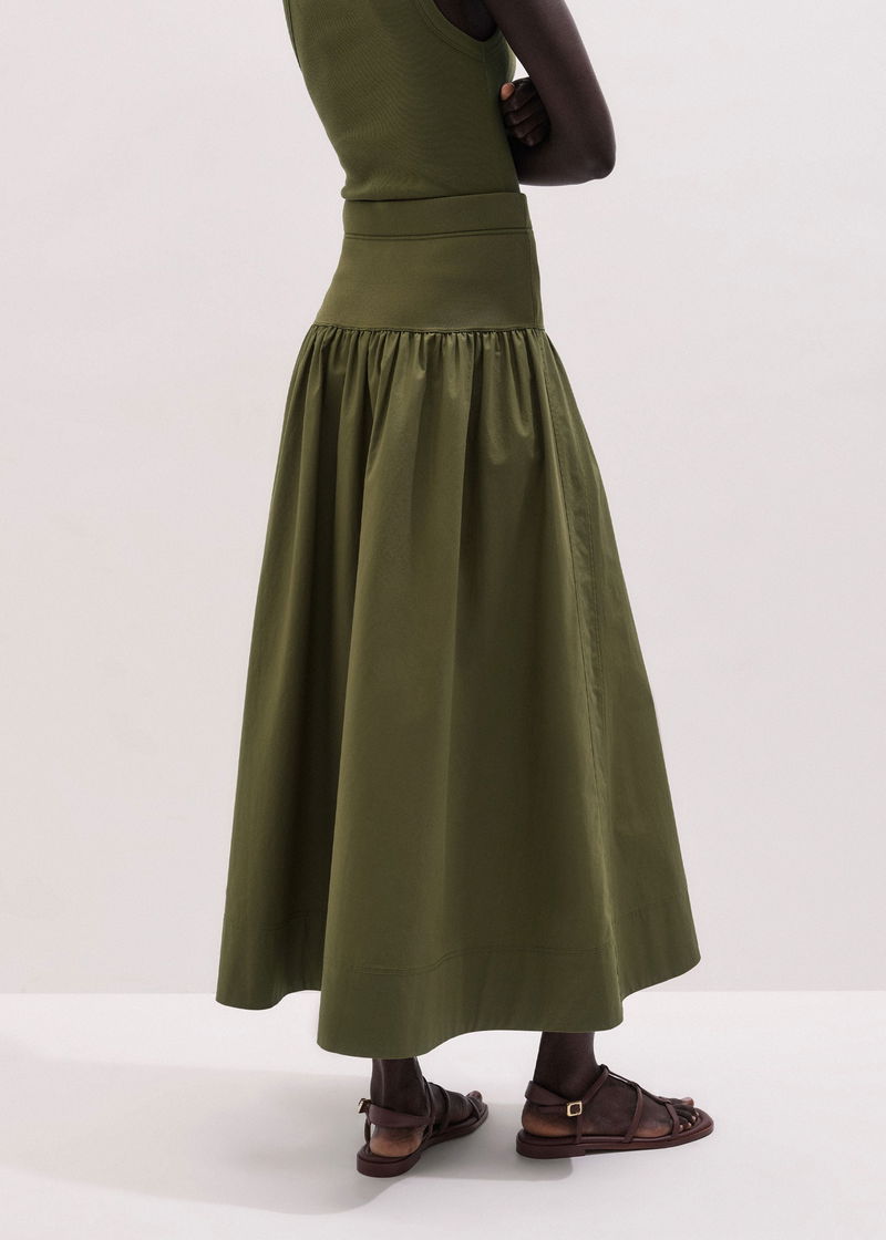 ME+EM's Olive Green Mixed Media Maxi Skirt is suspended from a soft ribbed-knit waistband, falling to a cotton poplin skirt for a flattering texture clash.