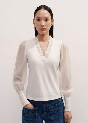 ME+EM's Cream Pointelle Sleeve Peplum Top is crafted from cotton blended with linen for a breathable finish.