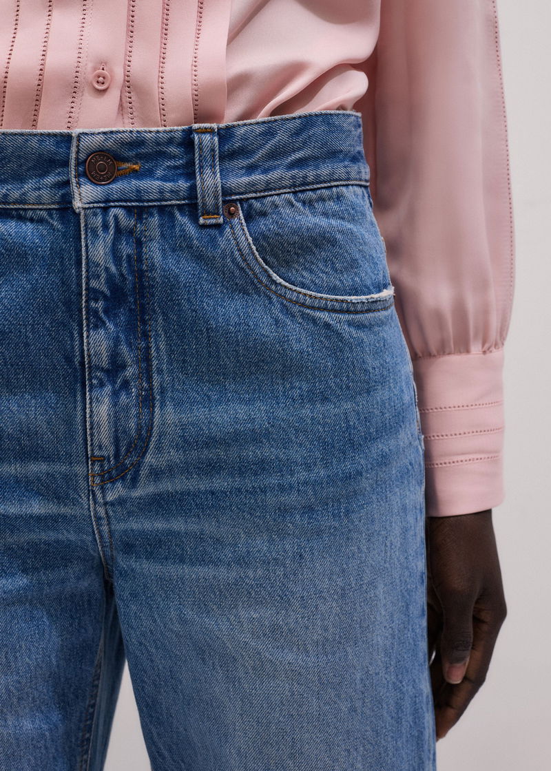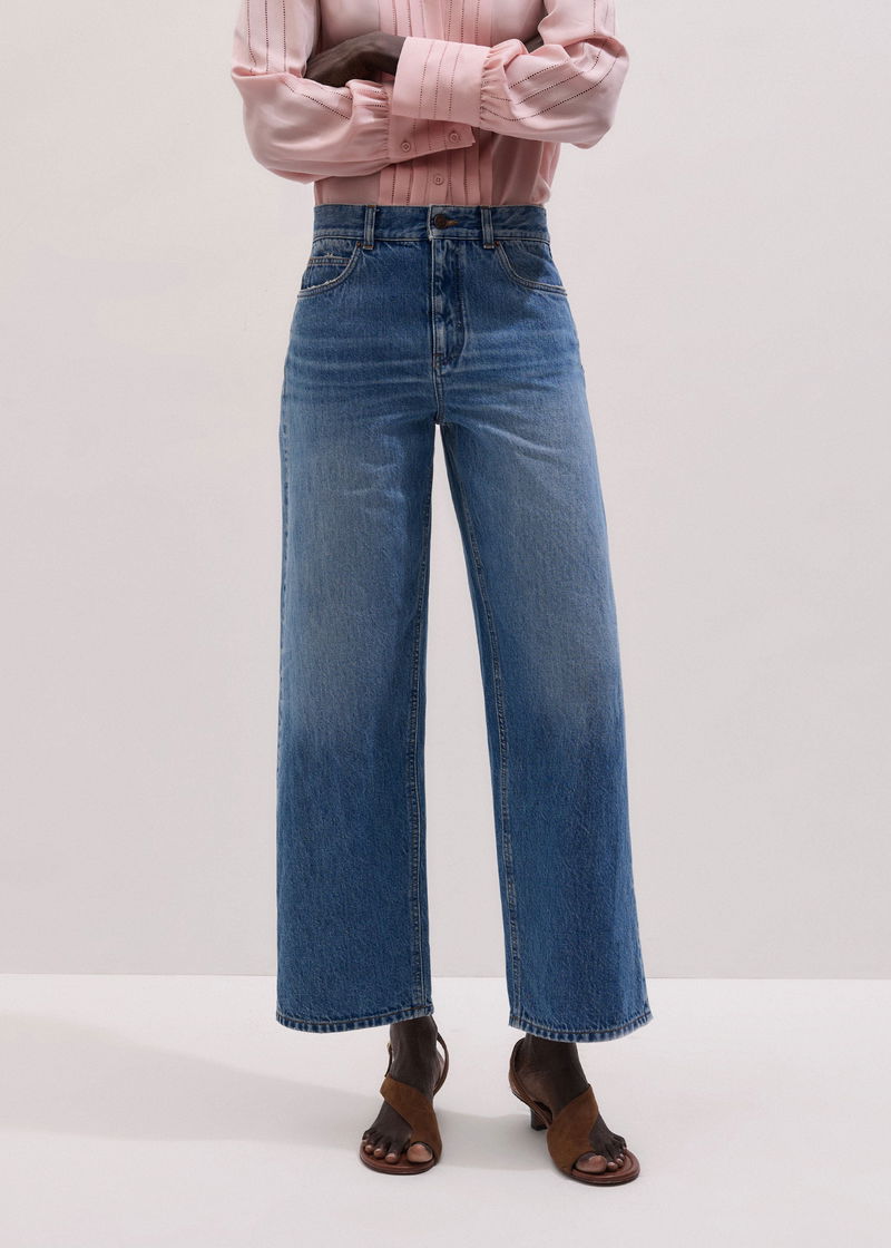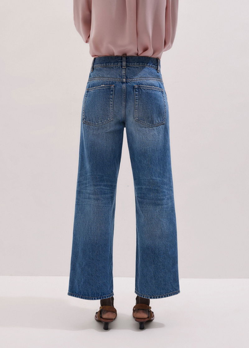 ME+EM's Light Blue Relaxed Straight Crop Jean features whiskering at the thigh and fading through the leg for an authentic, lived-in feel.