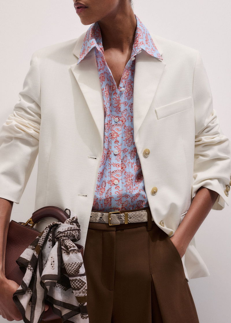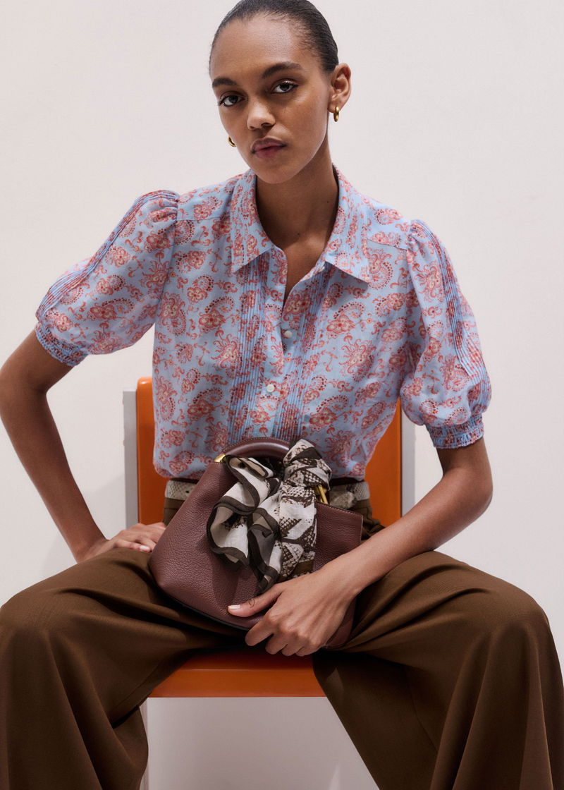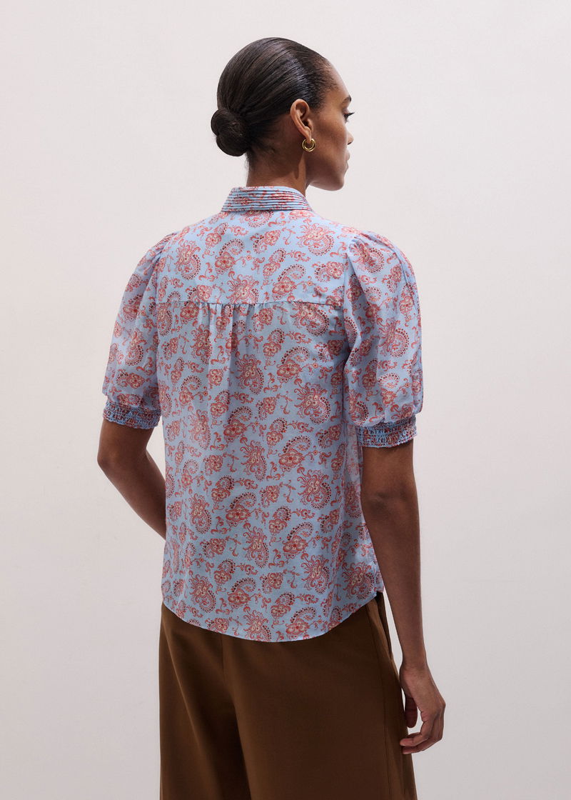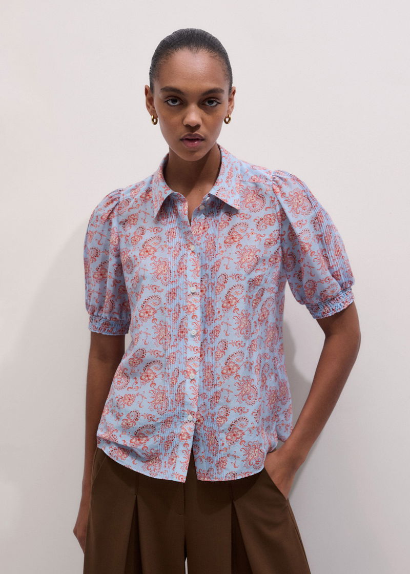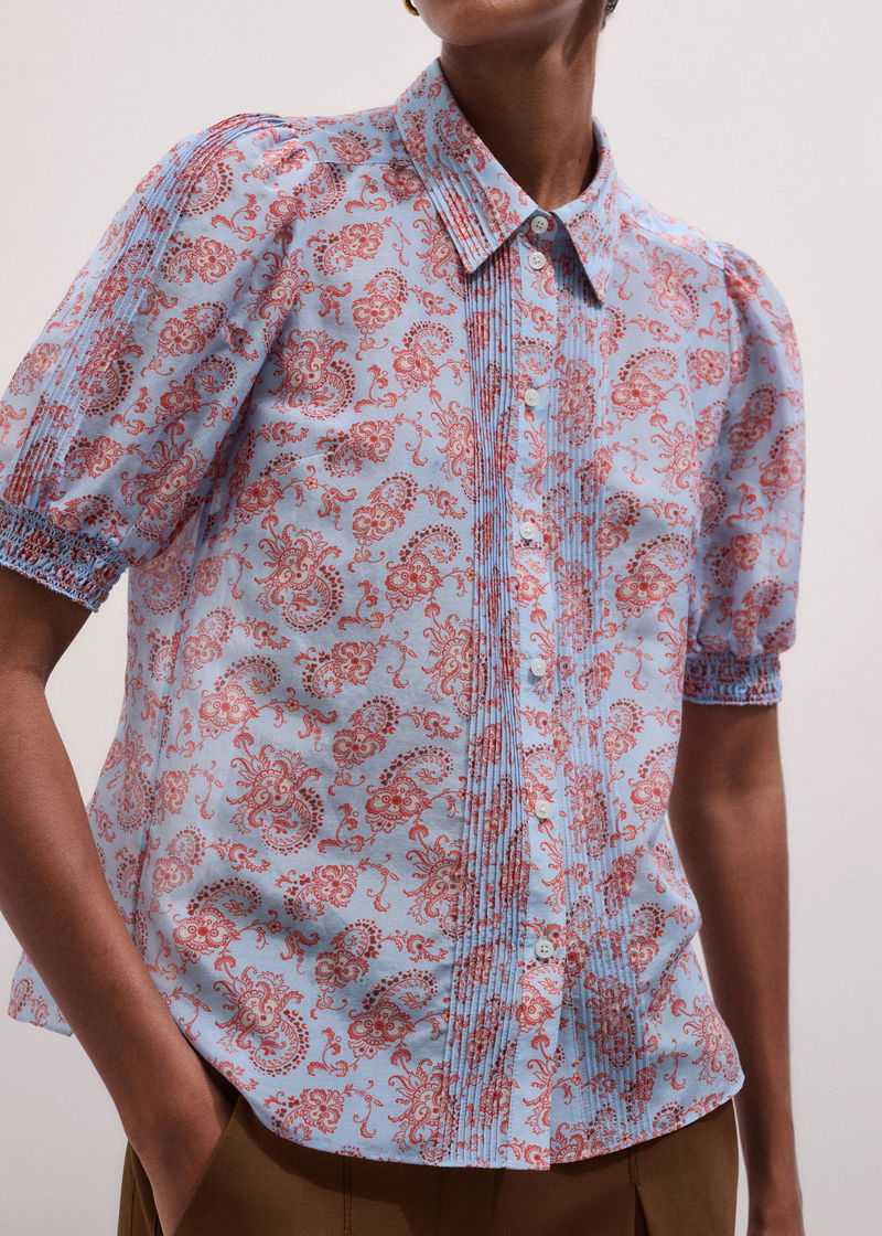 ME+EM's Blue Silk Cotton Gilded Paisley Print Straight Blouse is elevated with pintuck trims, elasticated cuffs and voluminous feminine sleeves.