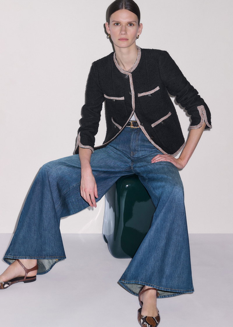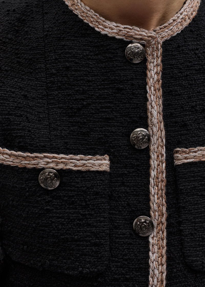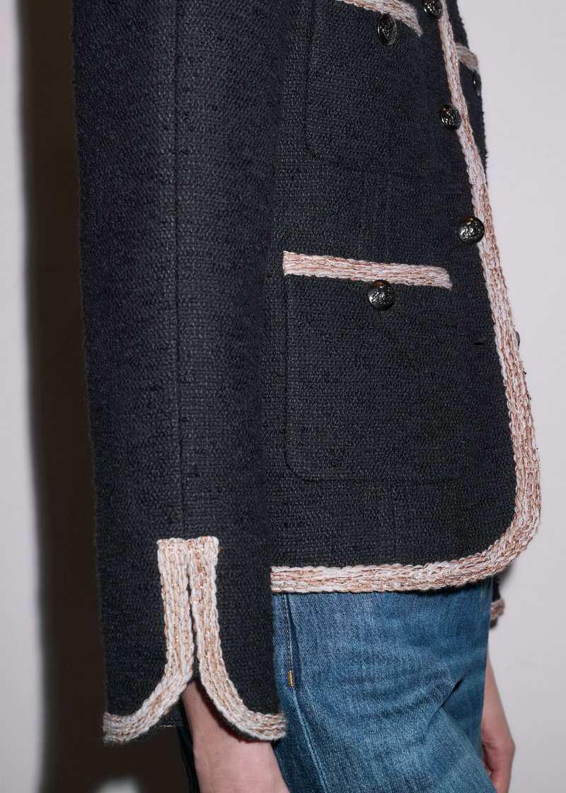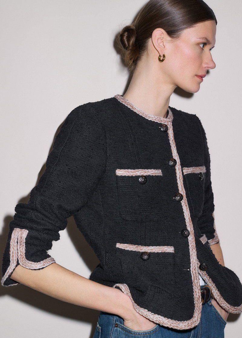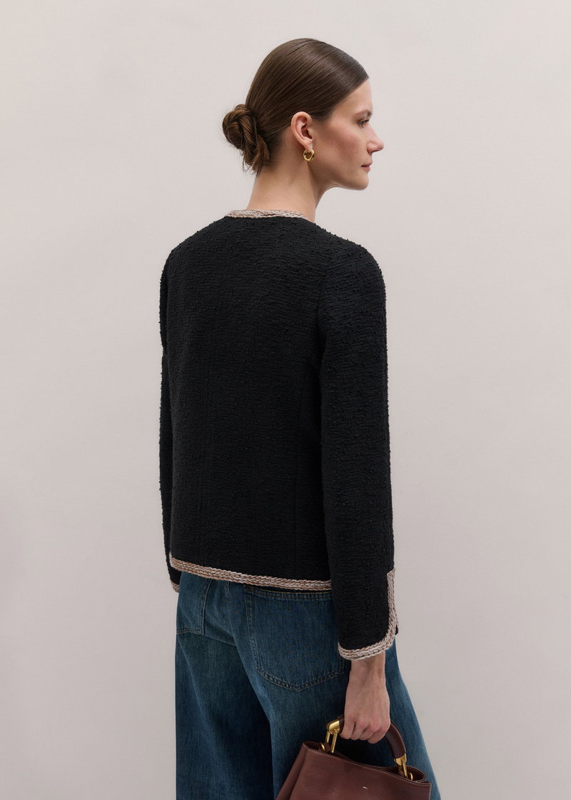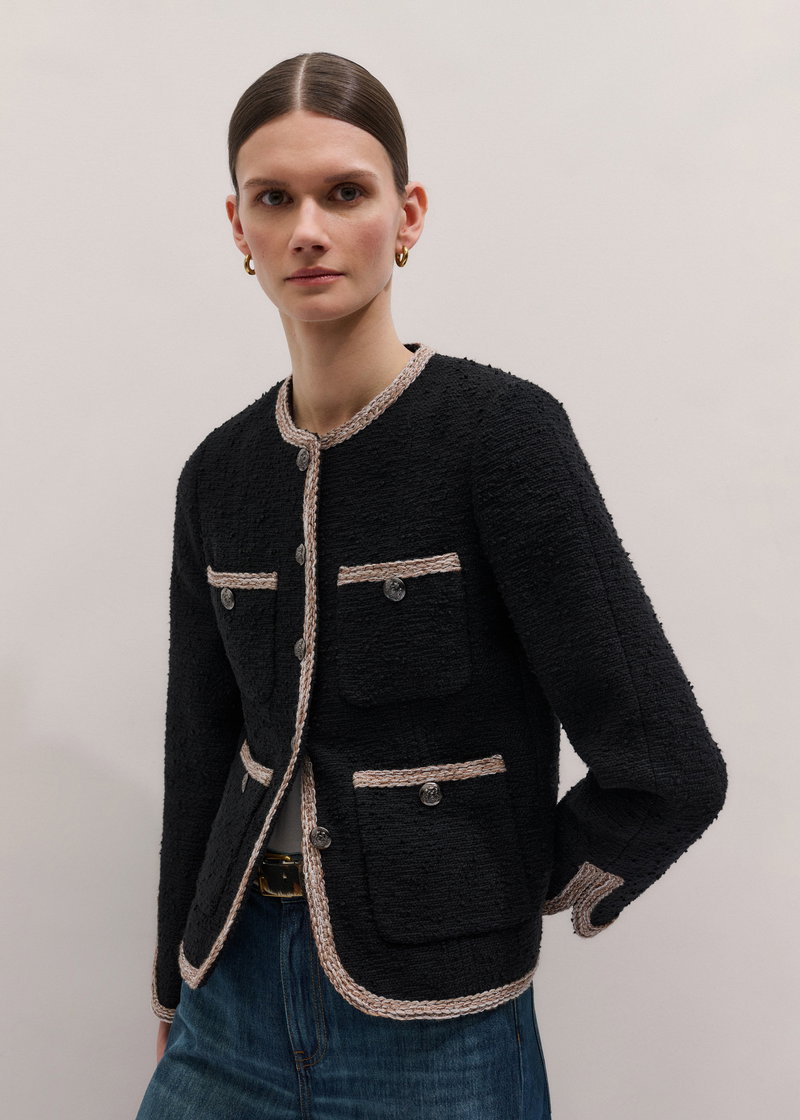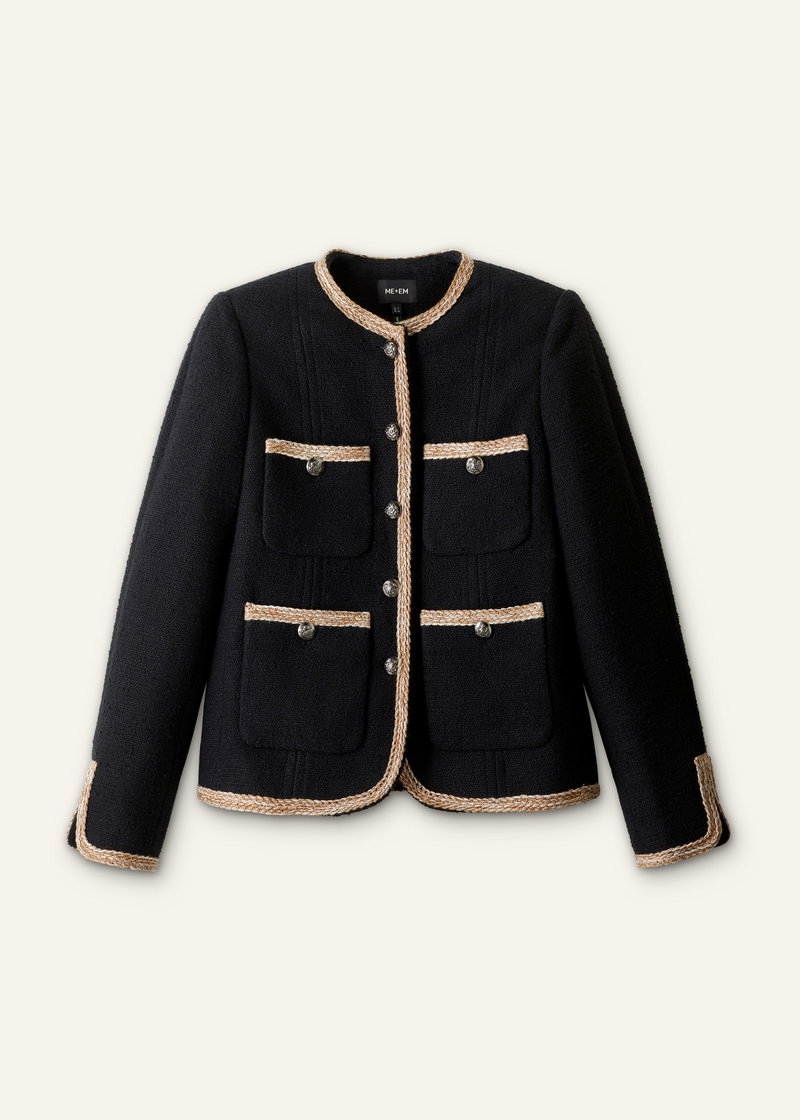 ME+EM's Black Straight Fit Jacket is crafted from Italian textured cotton tweed, which offers a soft yet structured feel.