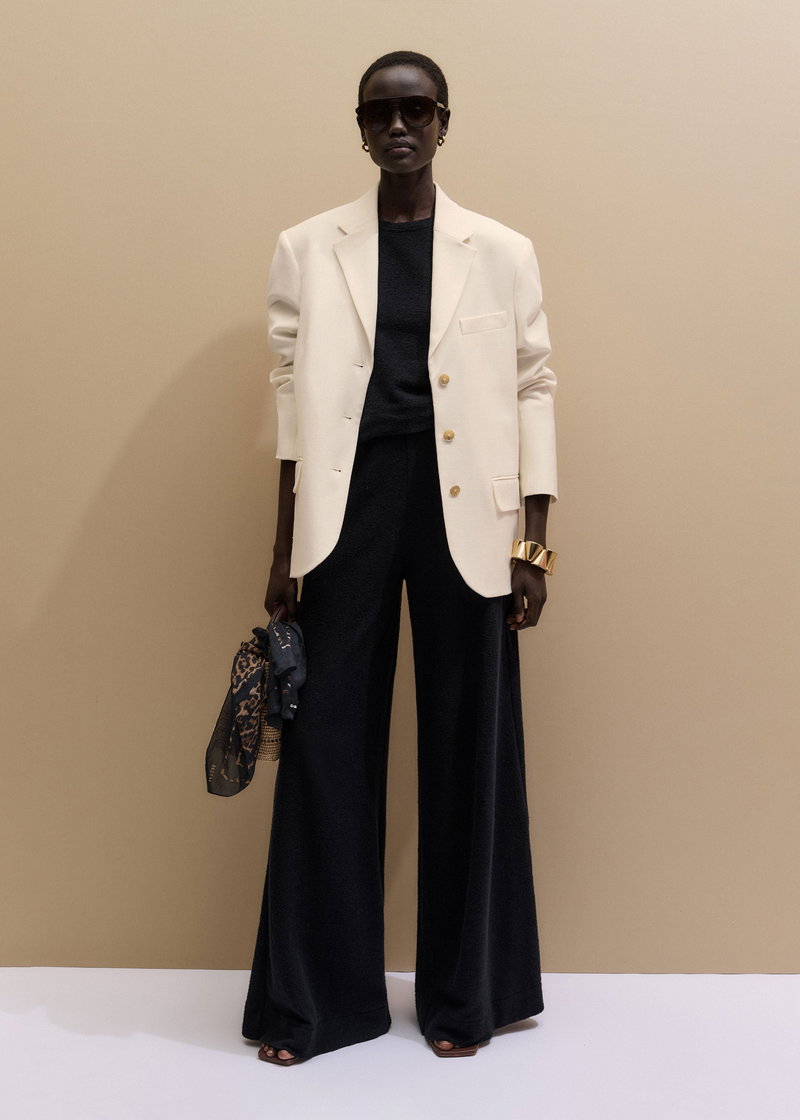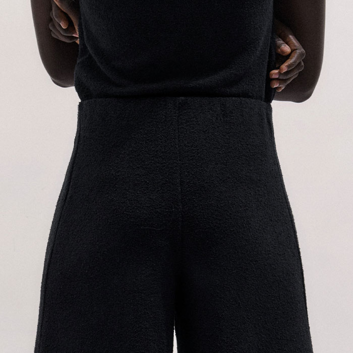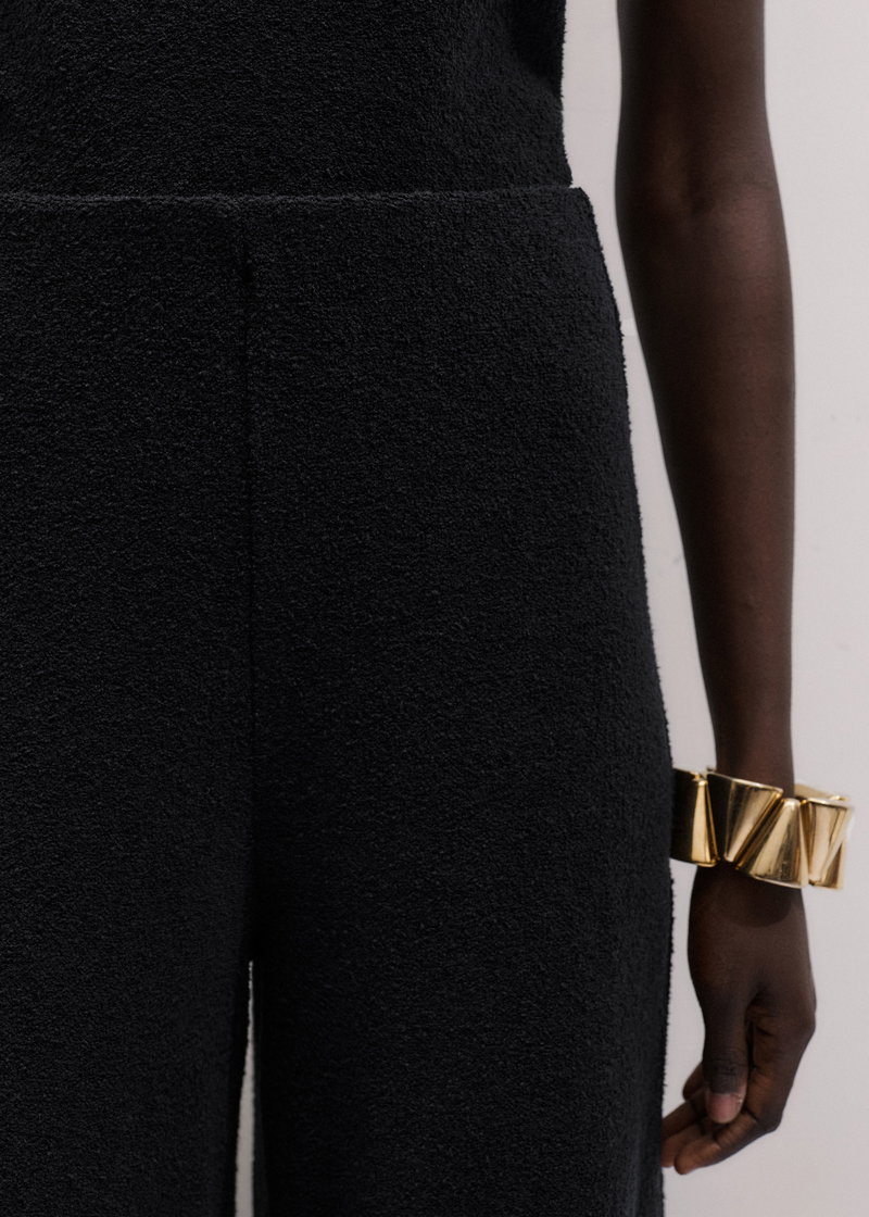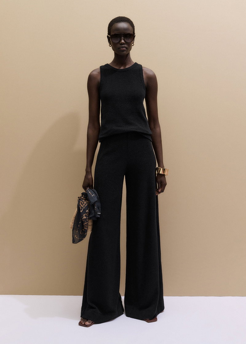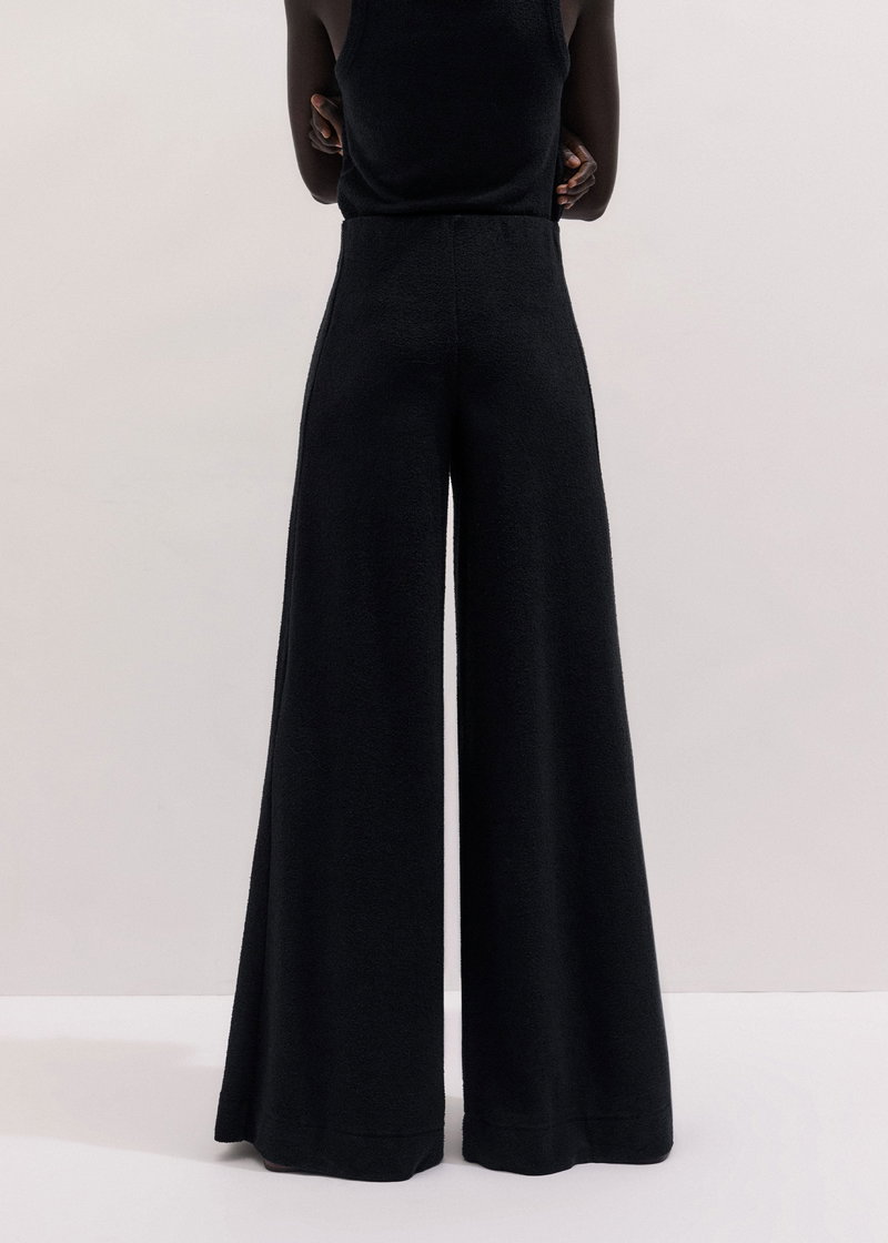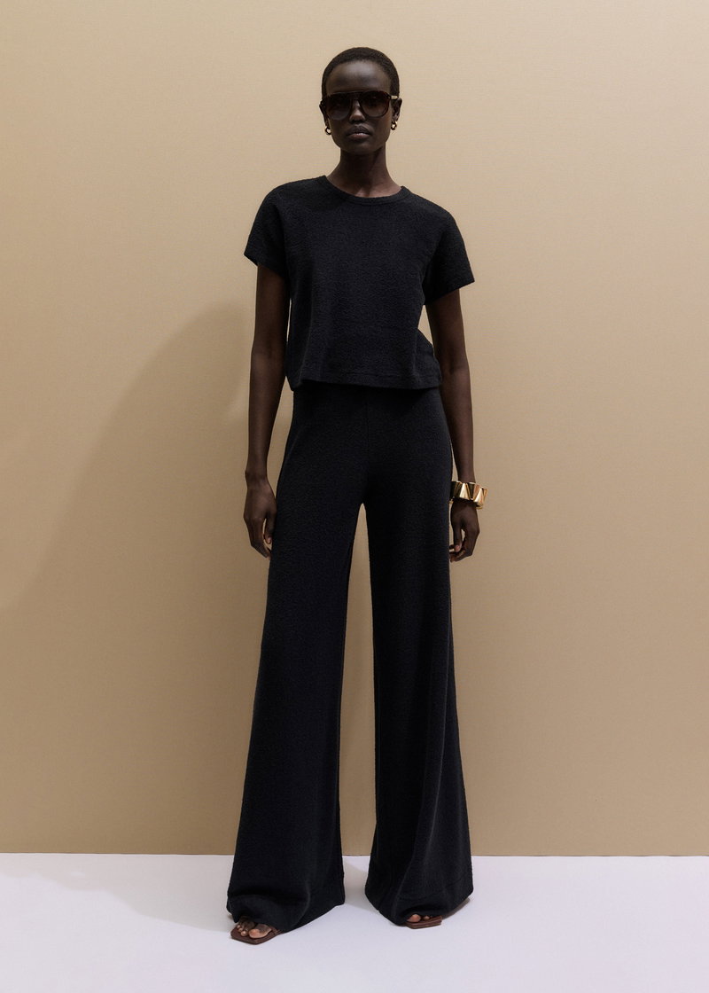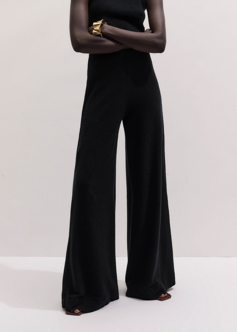 ME+EM's Black Textured Wide-Leg Palazzo Pant combines the stretch and comfort of jersey with a subtle tactile edge created by bouclé loop yarn. Crafted from midweight cotton-knit jersey with a looped, textured finish created by bouclé yarn. This fabric combines the stretch and comfort of jersey with a tactile finish.