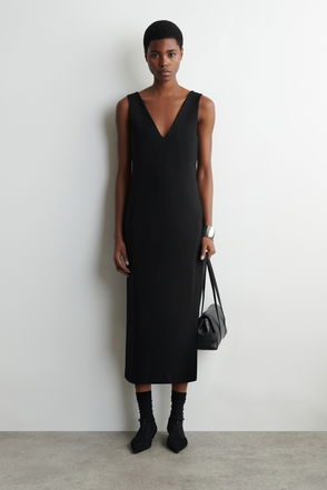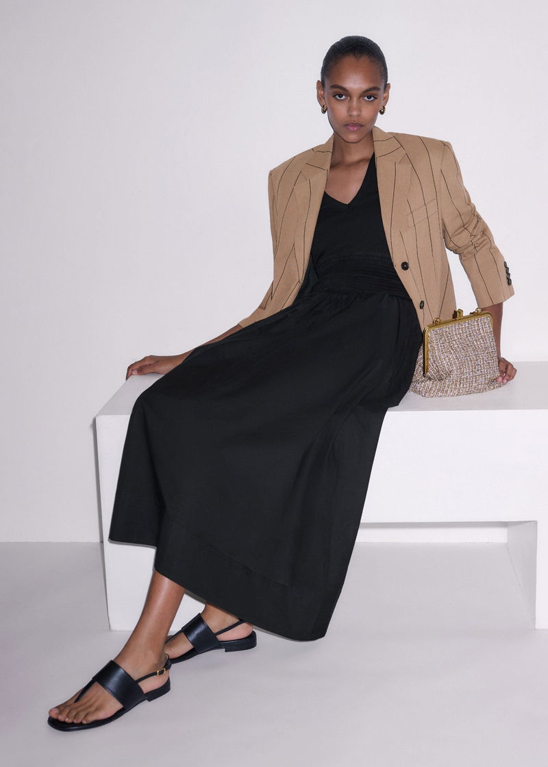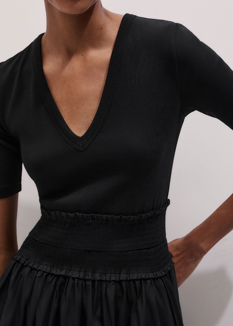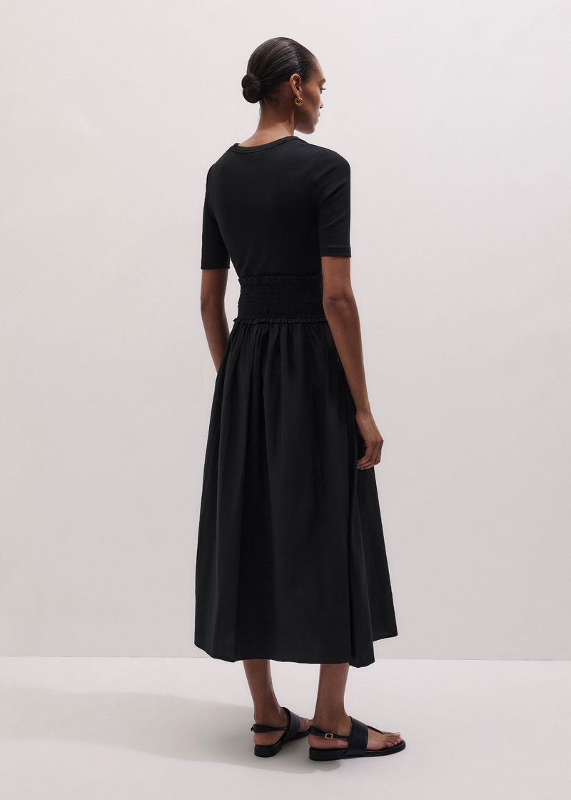 ME+EM's Black V-Neck Smocked Skirt Mixed Media Maxi Dress features a smocked waist to create the illusion of two pieces, with the ease of one.