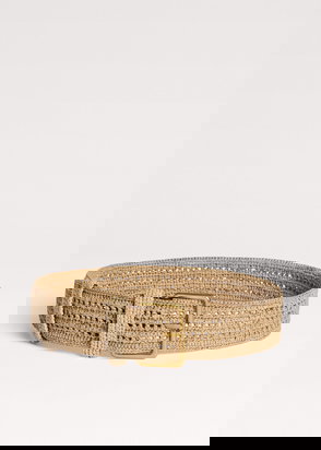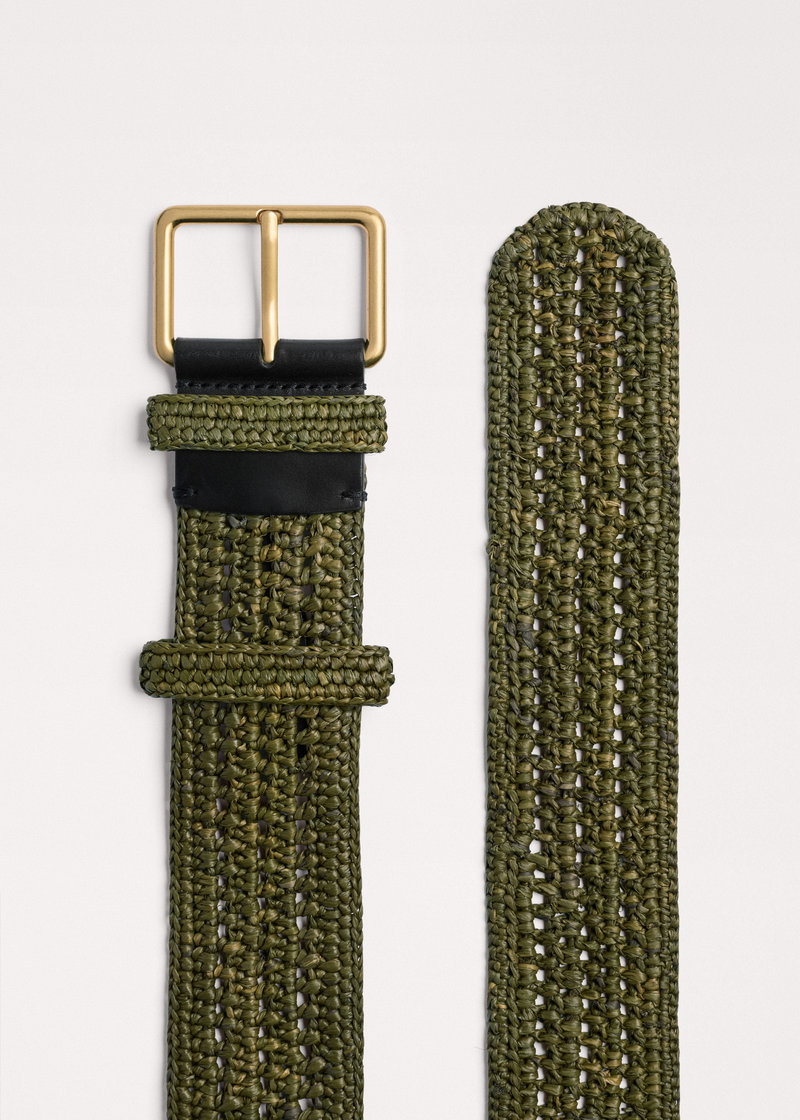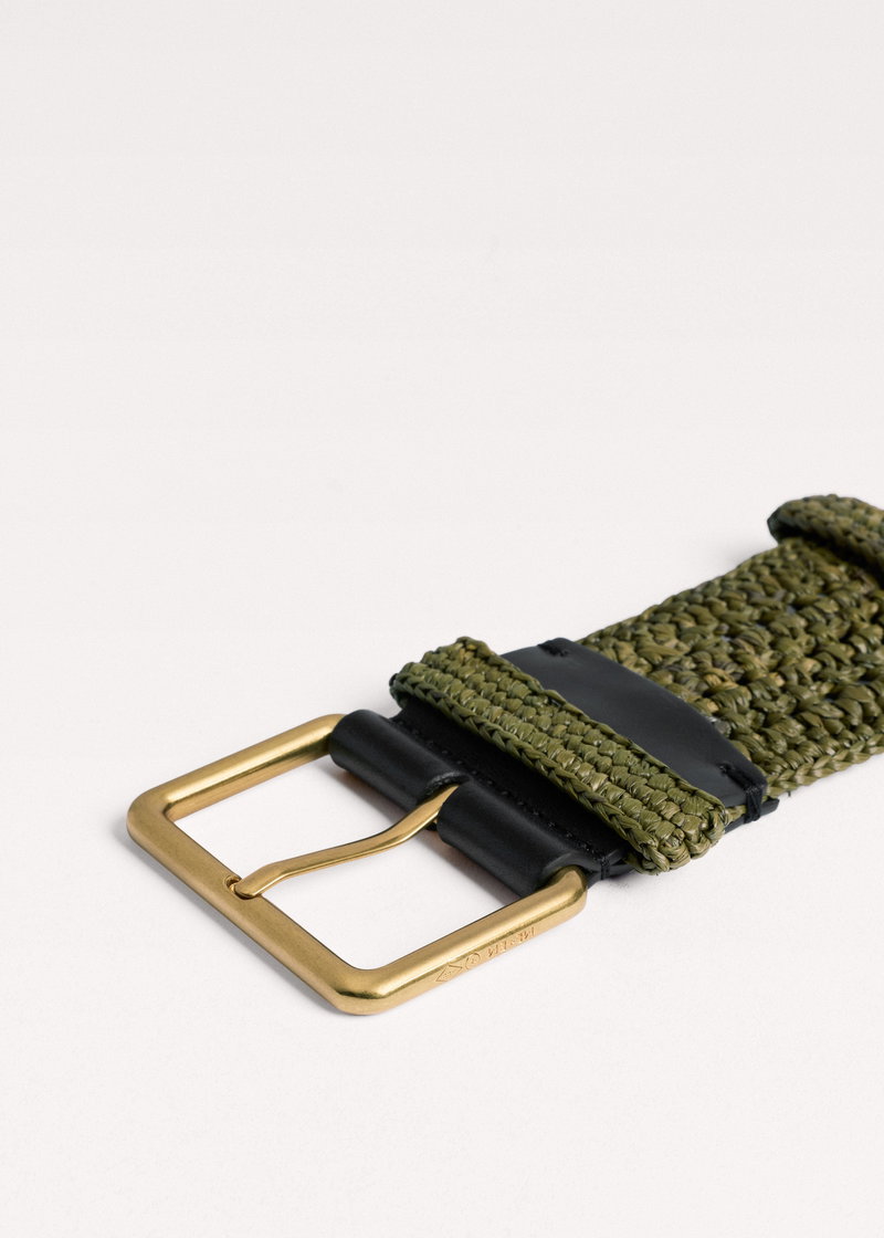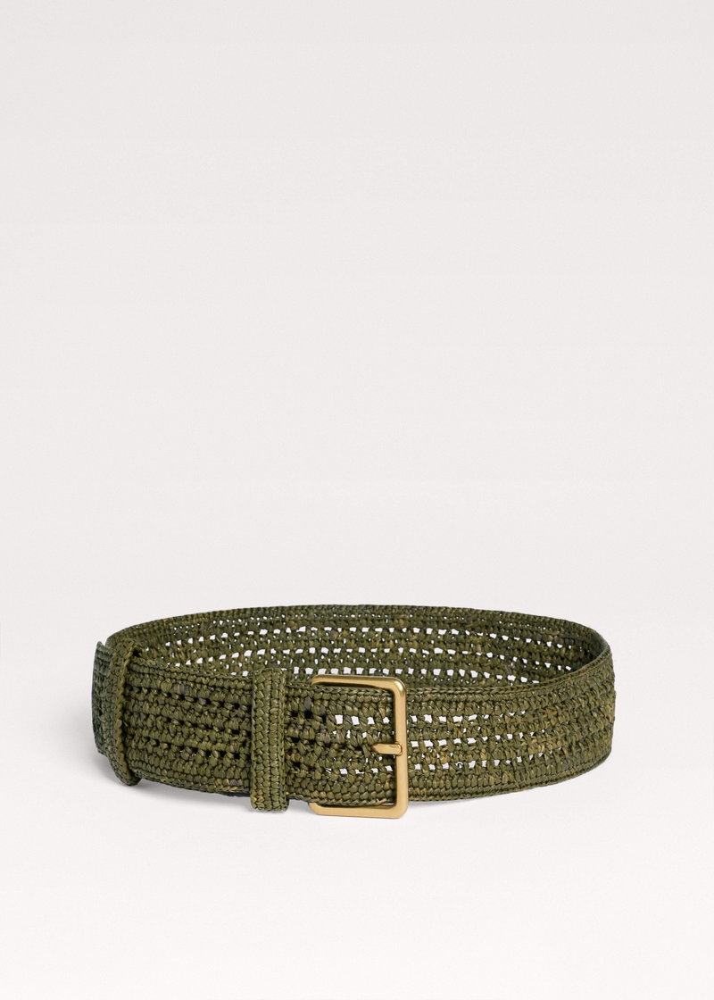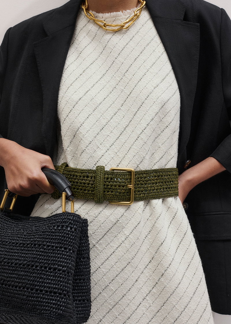 ME+EM's Olive Green Raffia Wide Summer Belt can be adjusted to be worn on your waist or hips.
