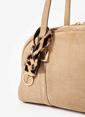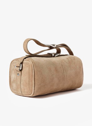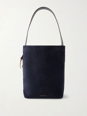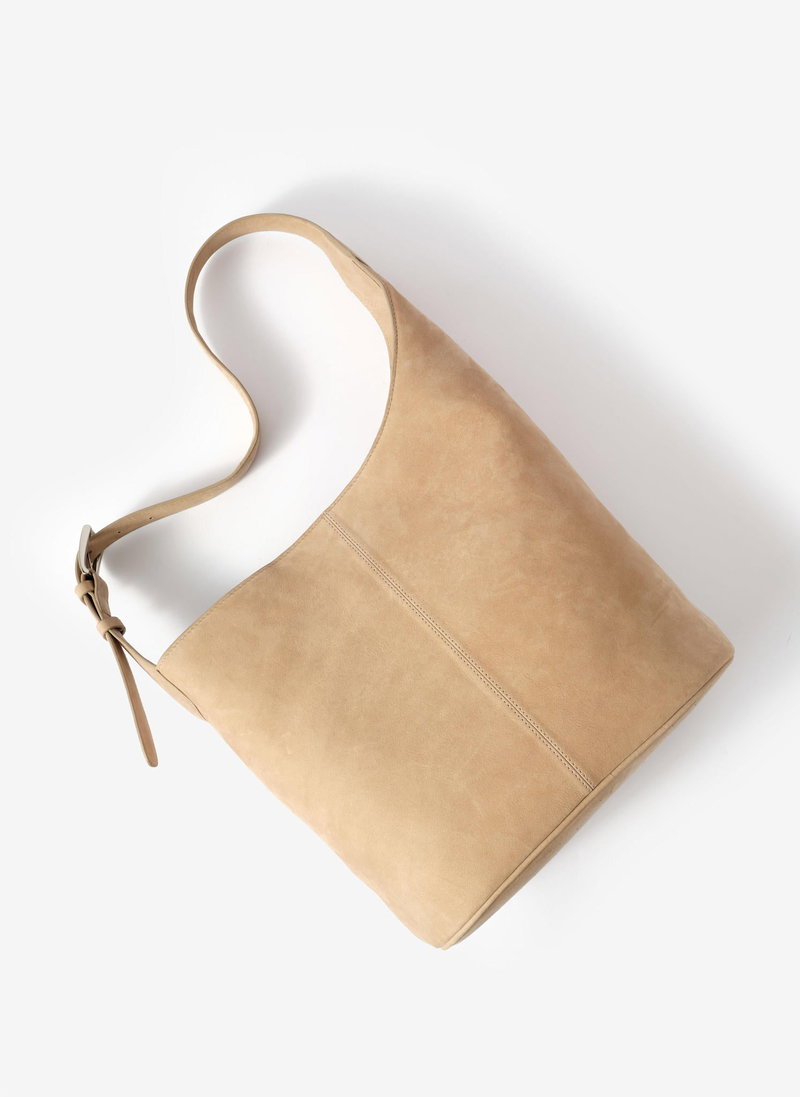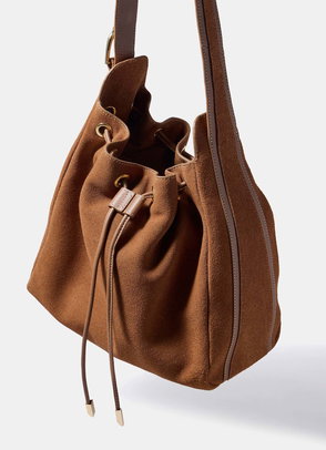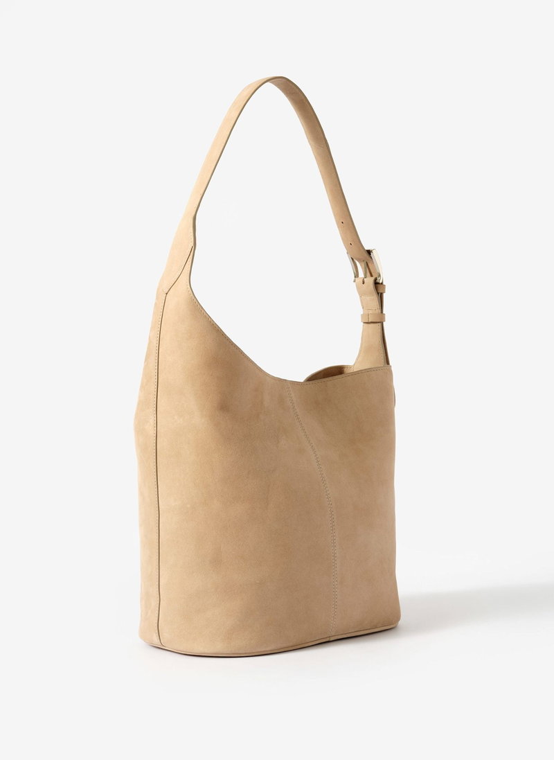 • Neutral suede bucket bag featuring an adjustable gold-tone buckle shoulder strap, inside slip pocket, zip pocket and magnetic closure fastening.