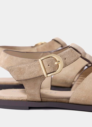 Light brown suede sandals featuring a double buckle design with gold-tone hardware, an open stitch trim and a flat sole.