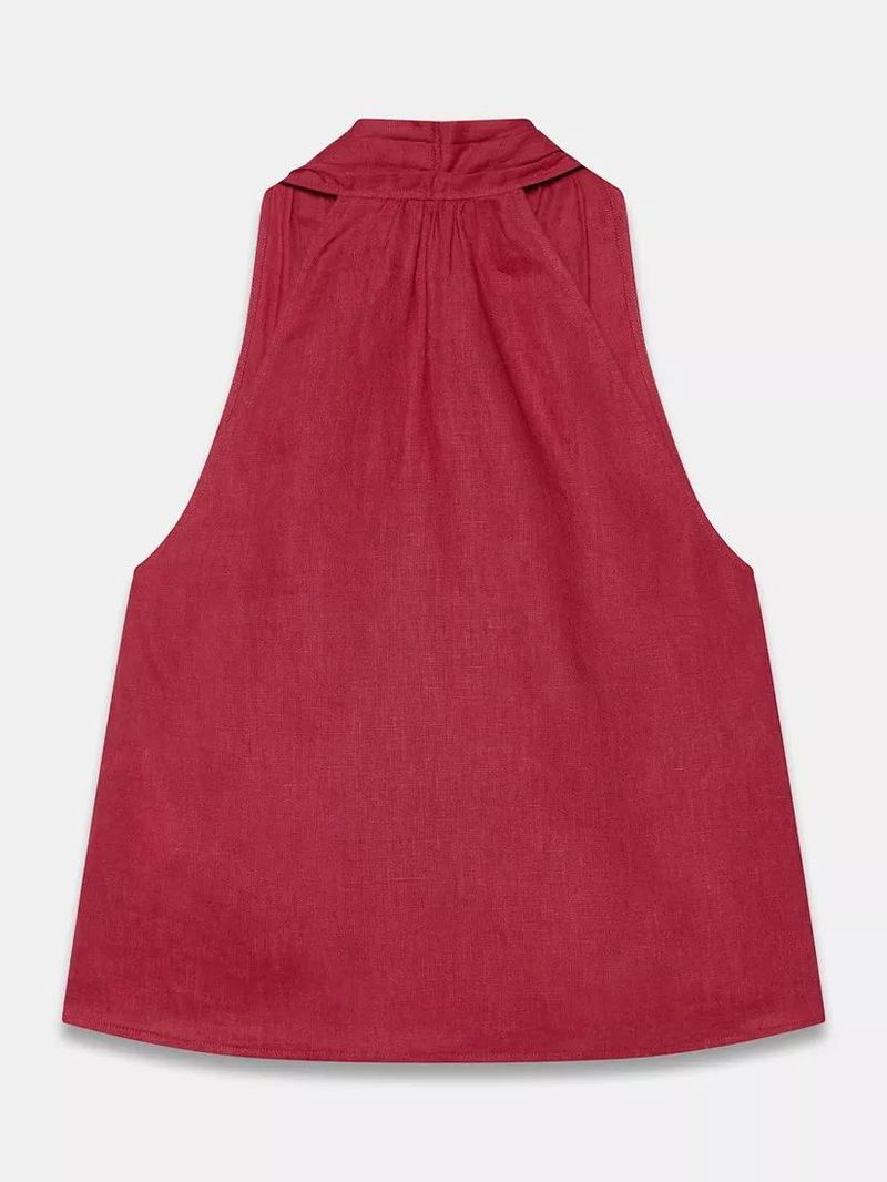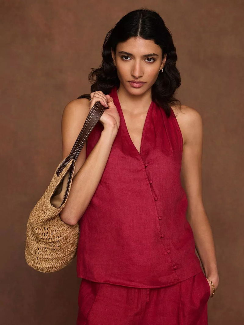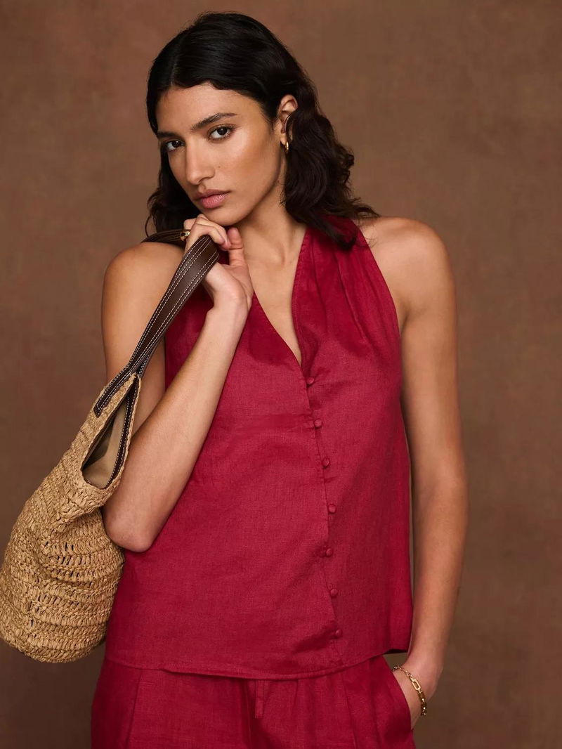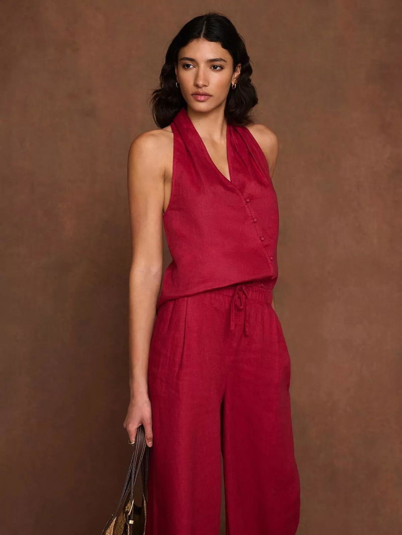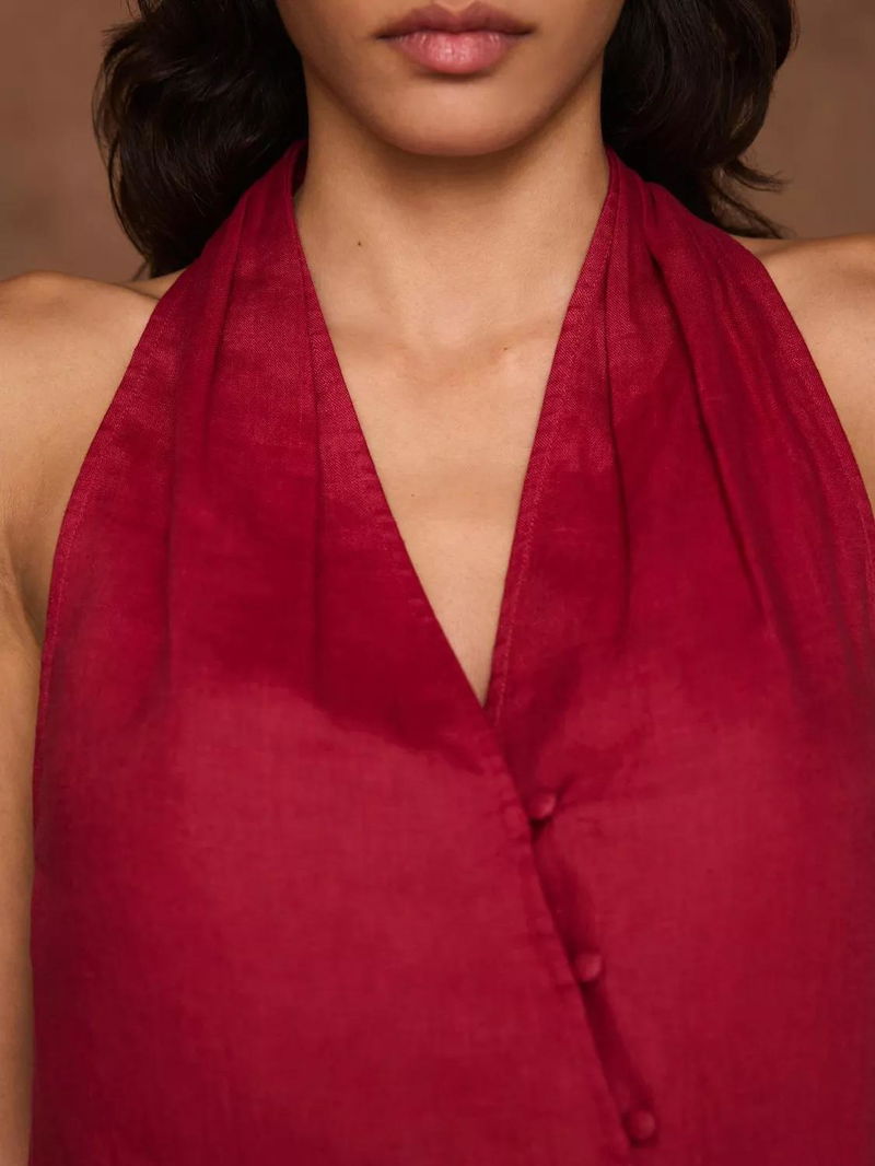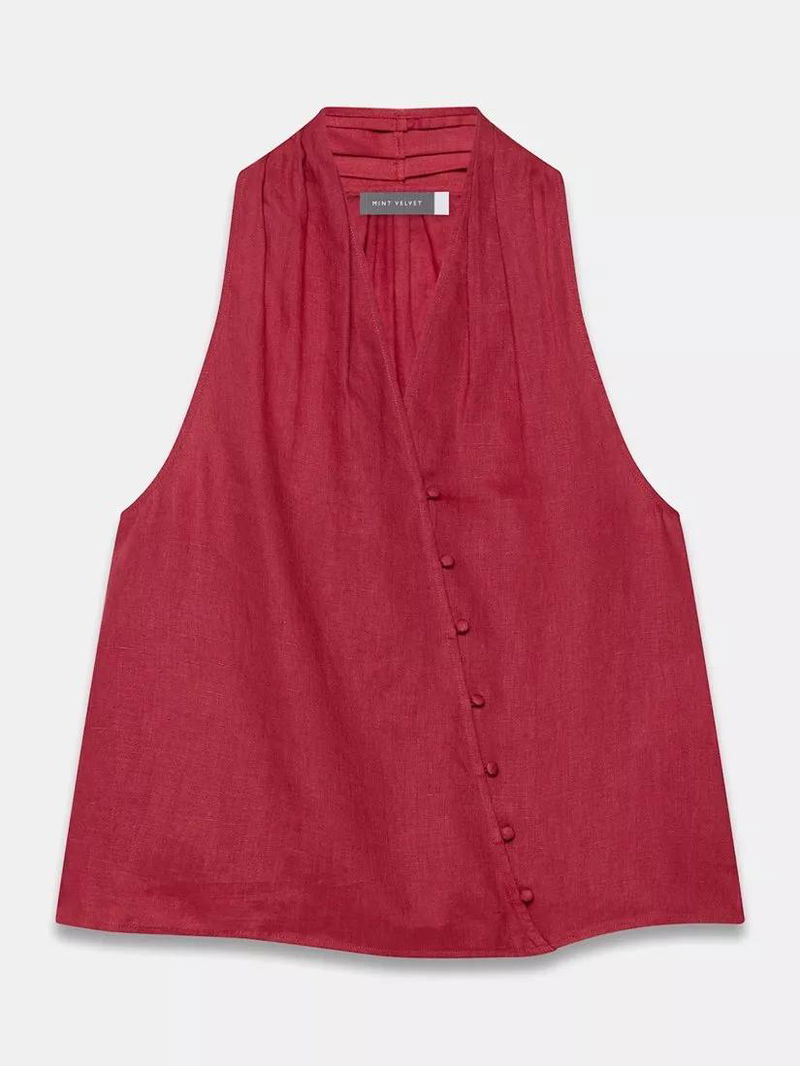 A pure linen sleeveless halter top featuring a V-neckline, gathered detail with an asymmetric button fastening through the front.