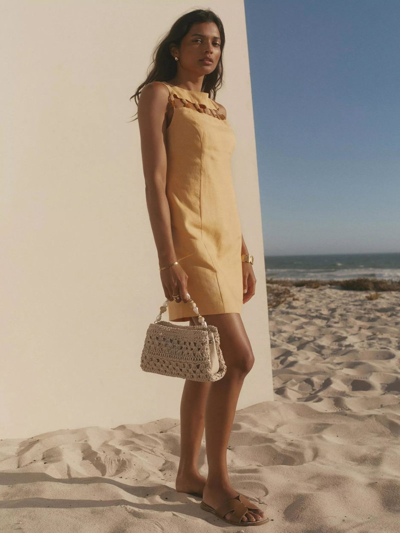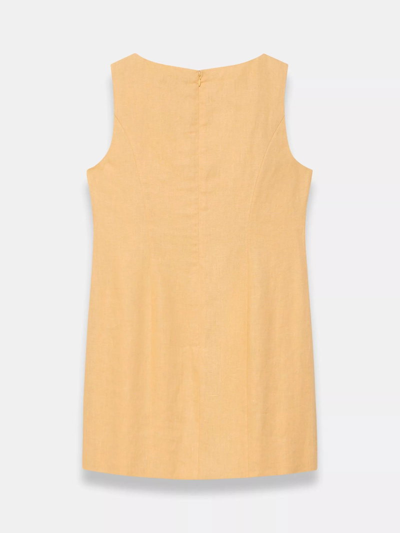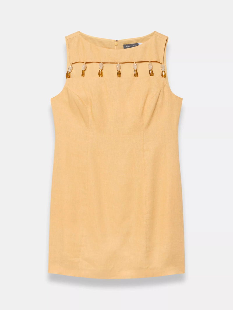 A pure linen sleeveless dress in a mini silhouette featuring a crew neckline, cut-out beaded detail with a zip fastening through the front.