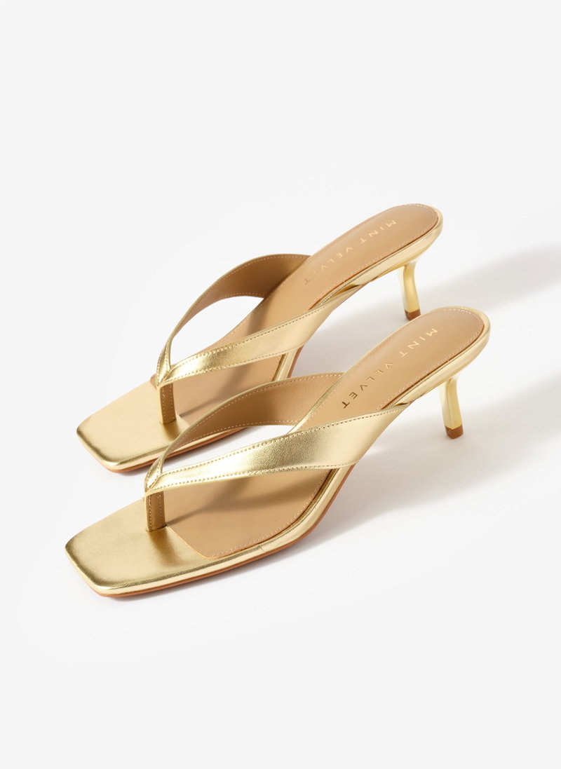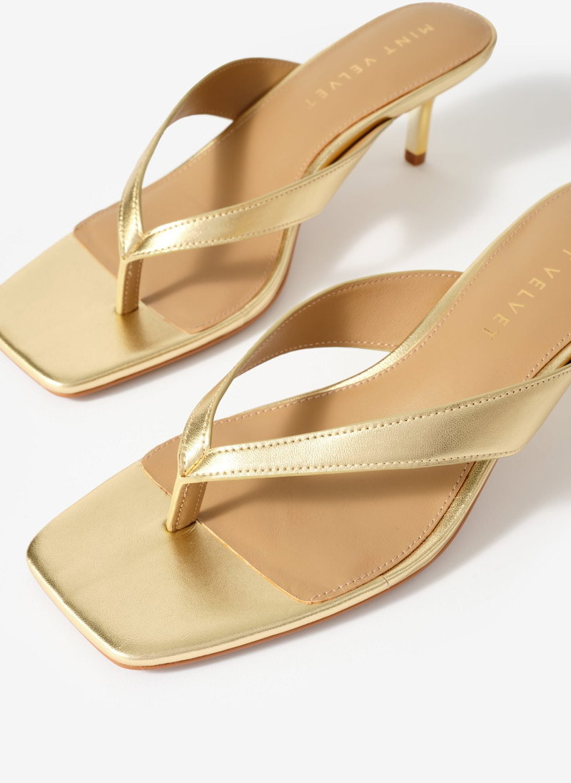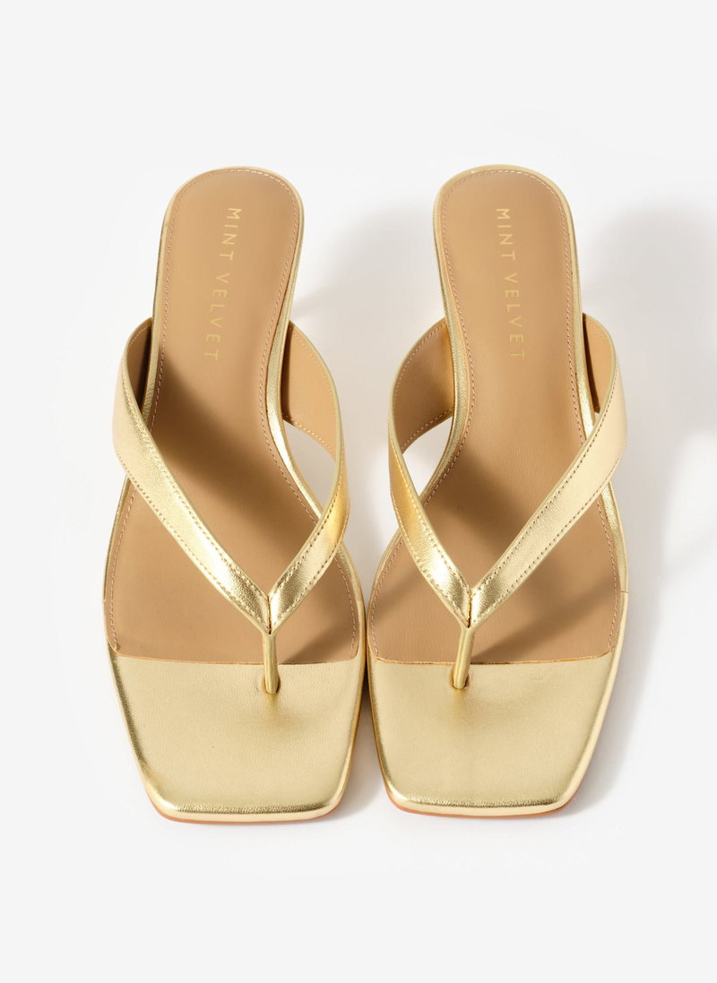 Gold flip flop sandals with a low-height heel.