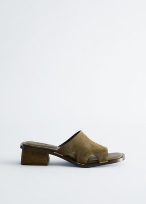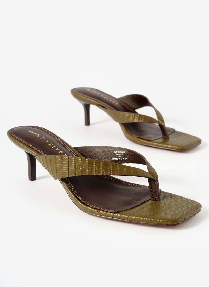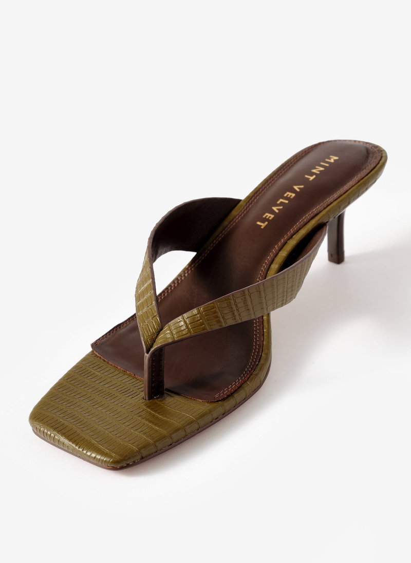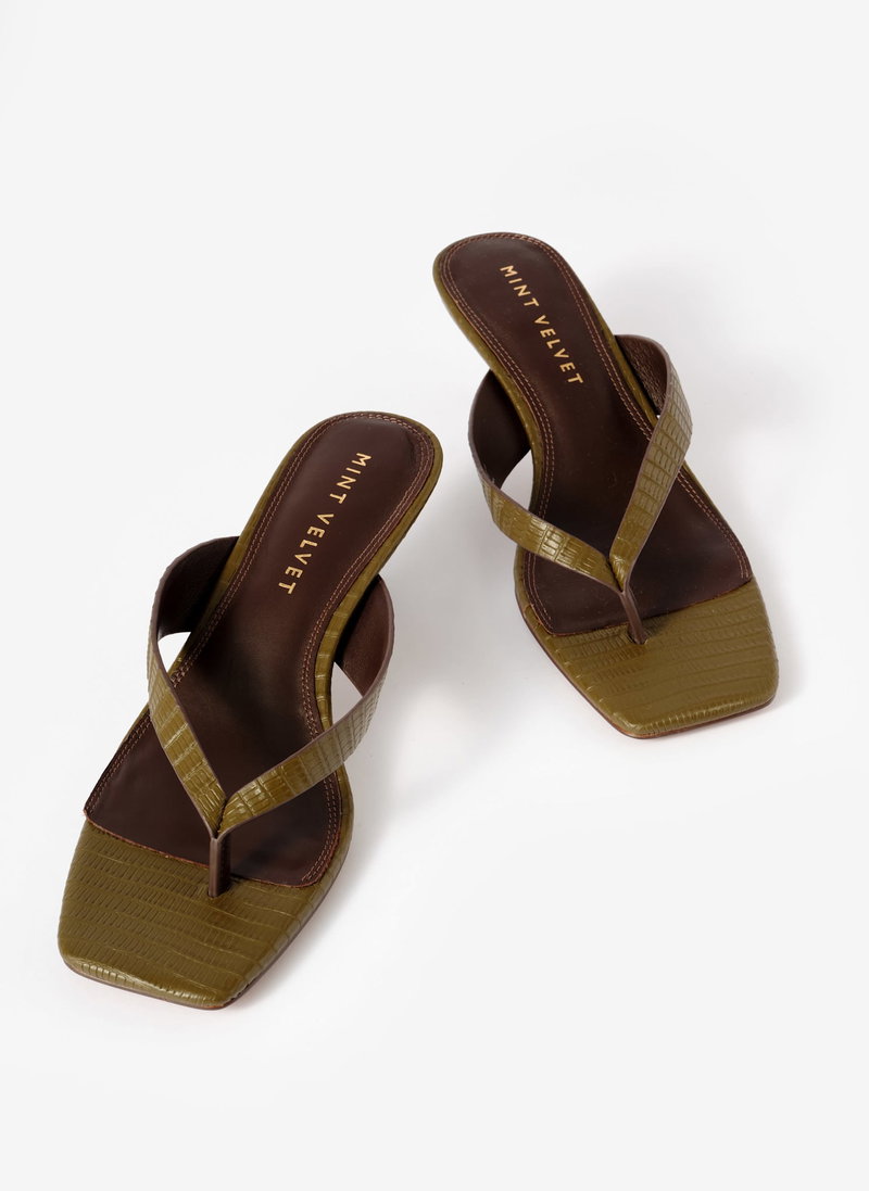 Khaki flip flop sandals with a low-height heel.
