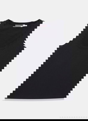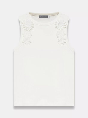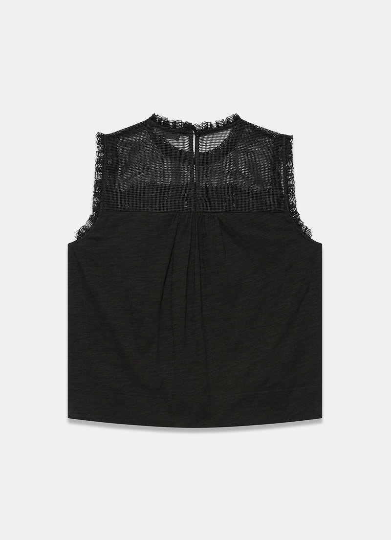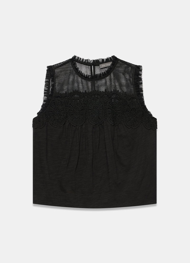 Black sleeveless mesh top featuring a crew neckline, appliqué crochet detail with a button fastening through the back.