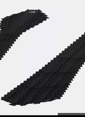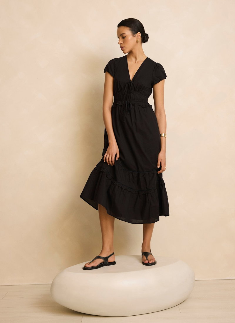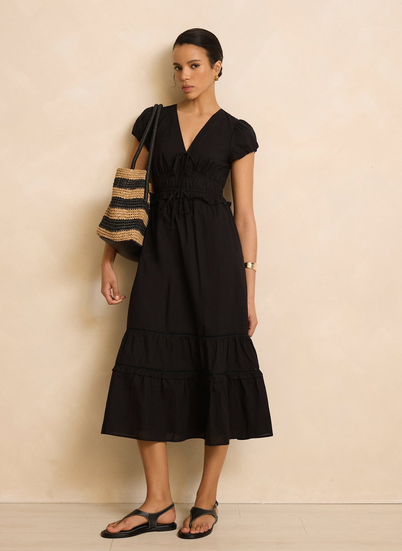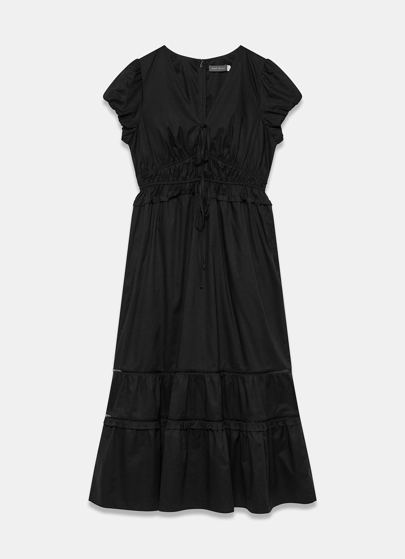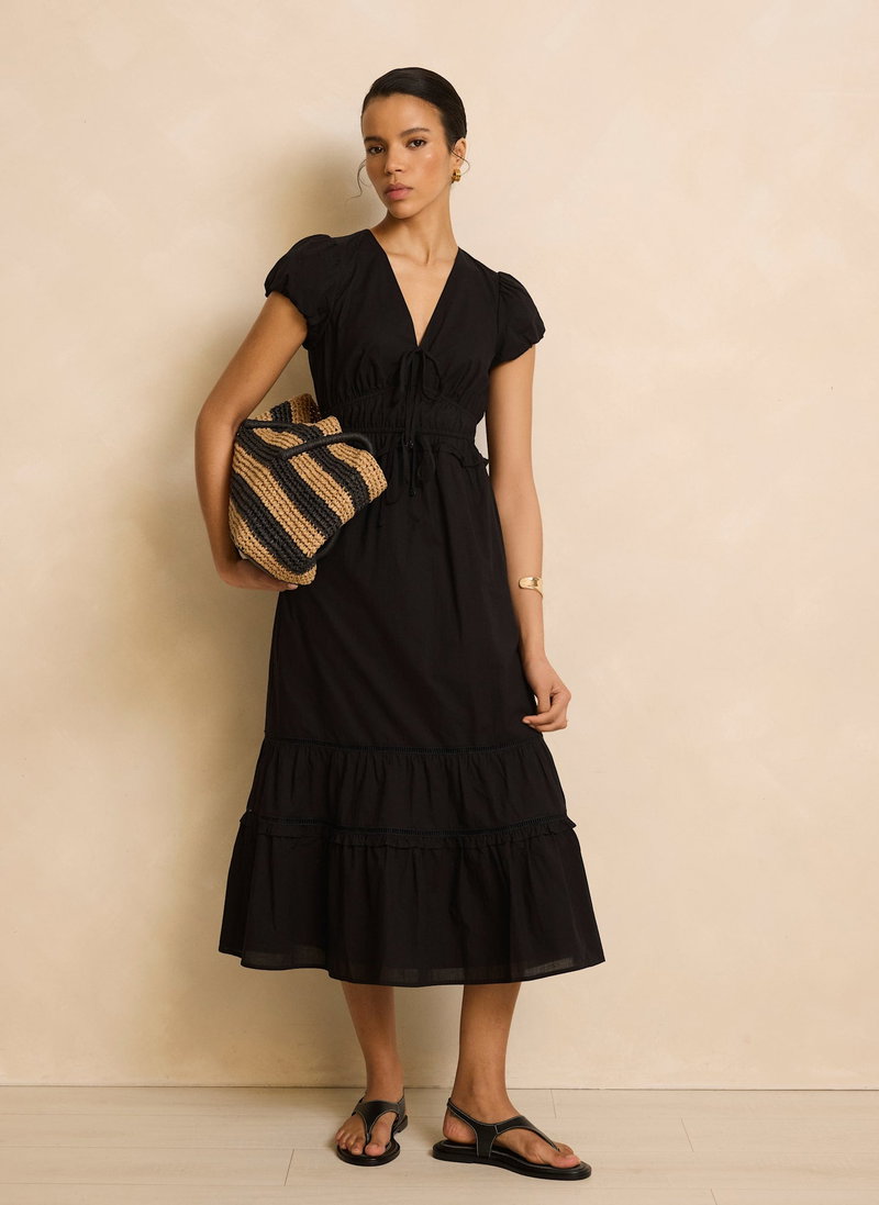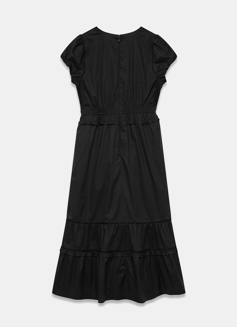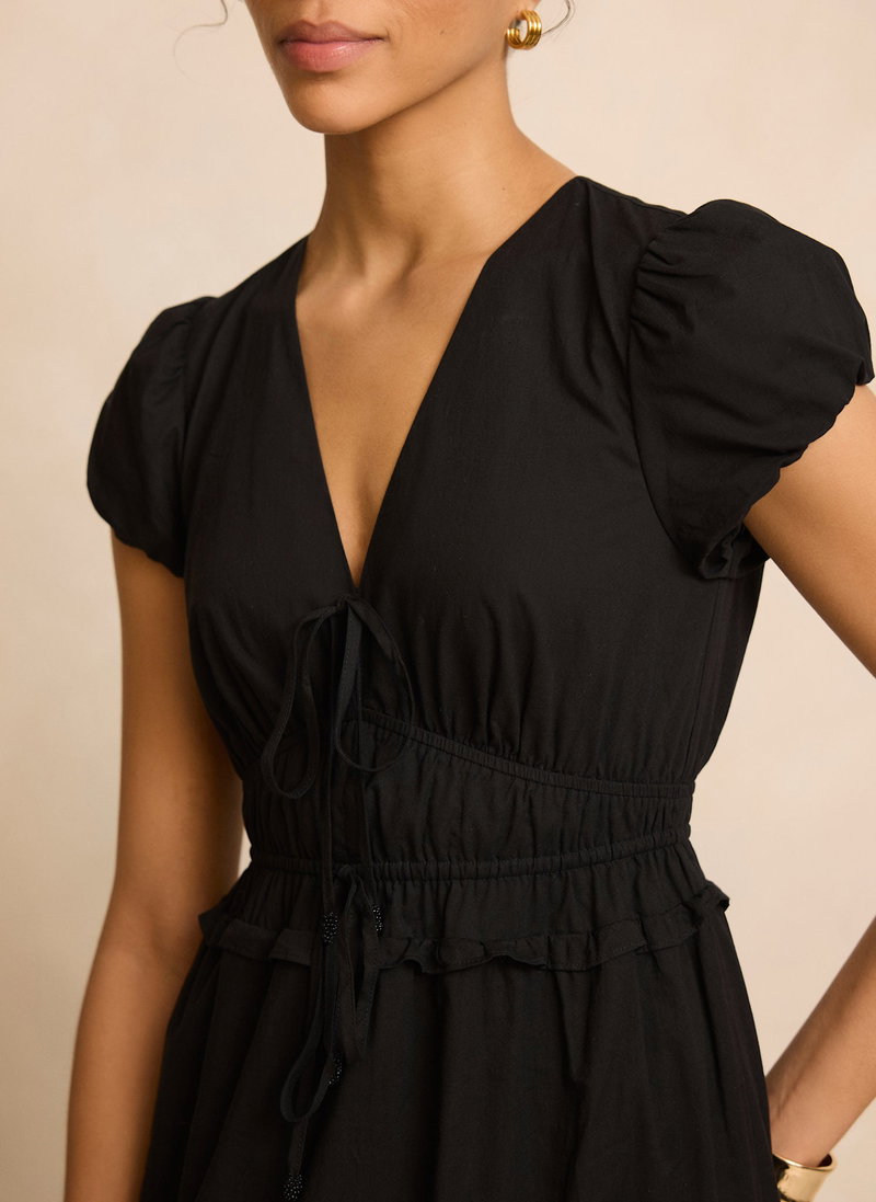 Black cotton dress in a midi silhouette featuring a V-neckline, tie fastenings, short puff sleeves, gathered waistband, open stitch trim, tiered hemline with a zip fastening through the back.