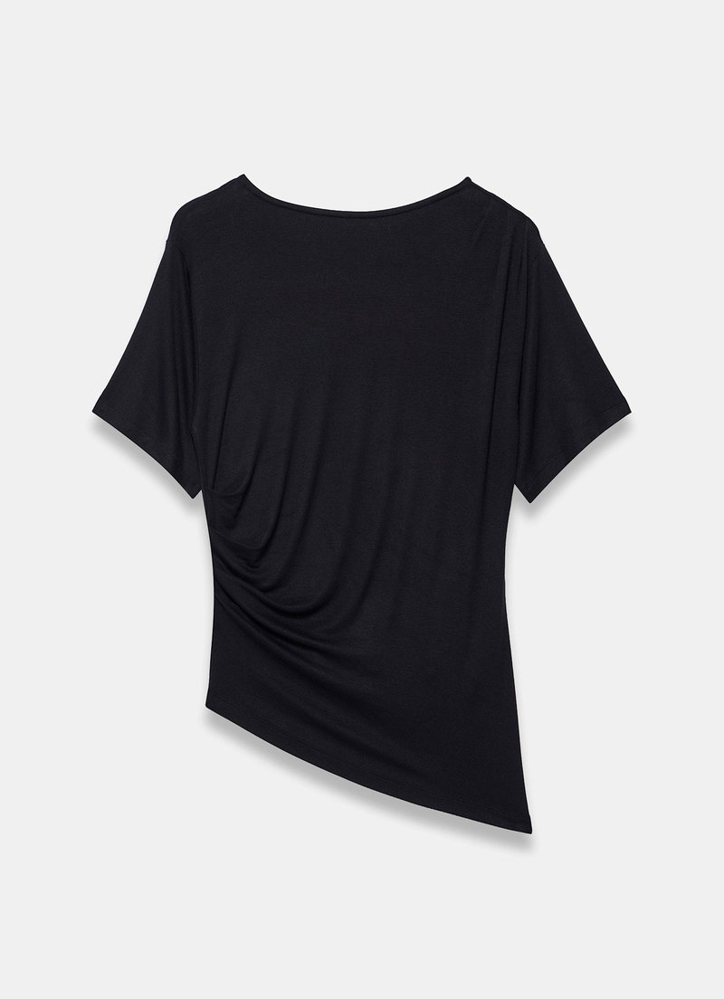 Black top featuring a slash neckline, short sleeves, draped detailing with an asymetric hemline.