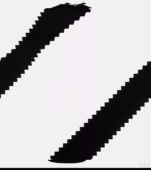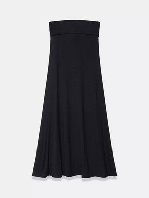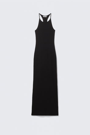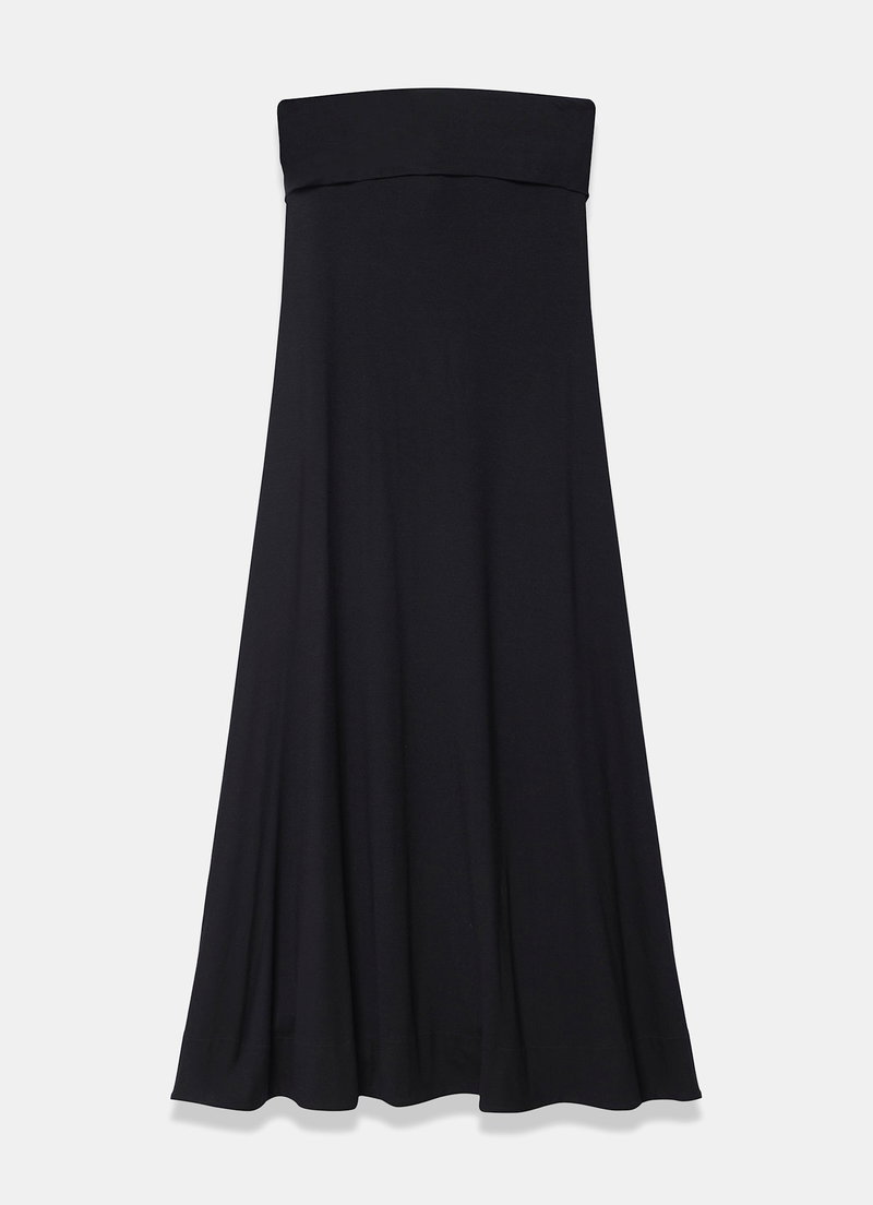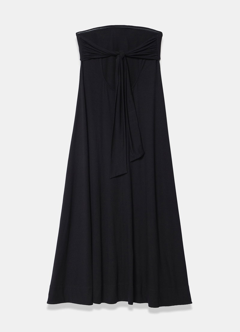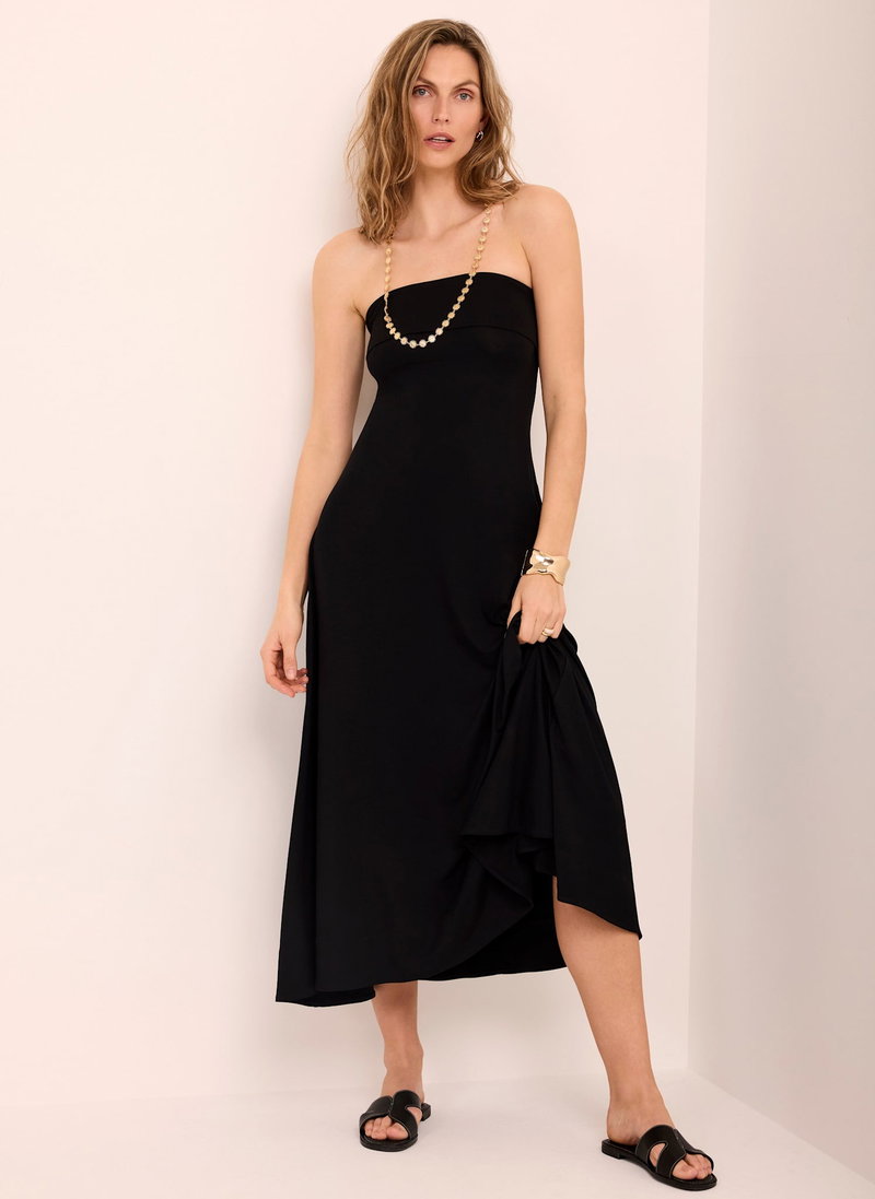 Black dress in a maxi silhouette featuring a fold over bandeau neckline and tie fastening through the back.