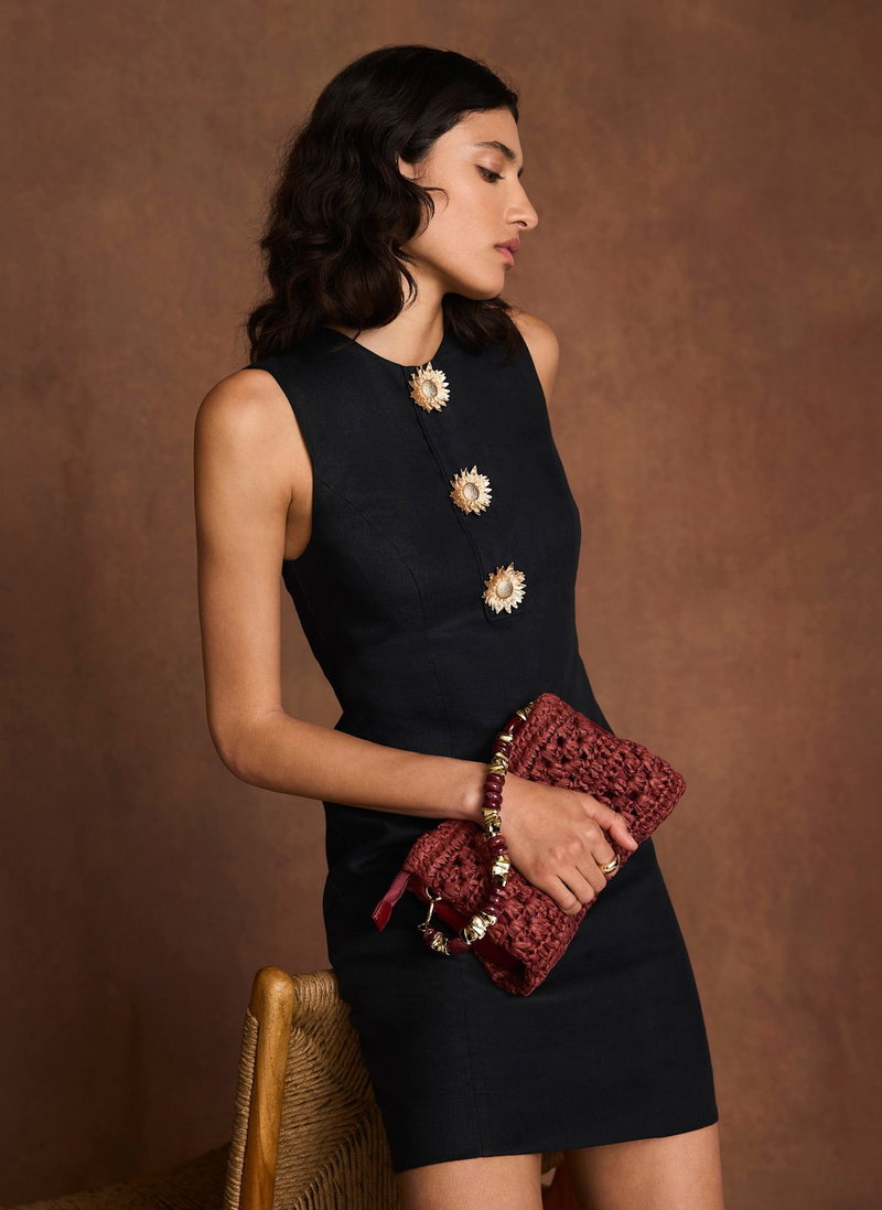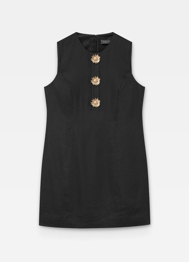 Black sleeveless dress in a mini silhouette, featuring a crew neckline, gold-tone statement sunray buttons with a zip fastening through the back.