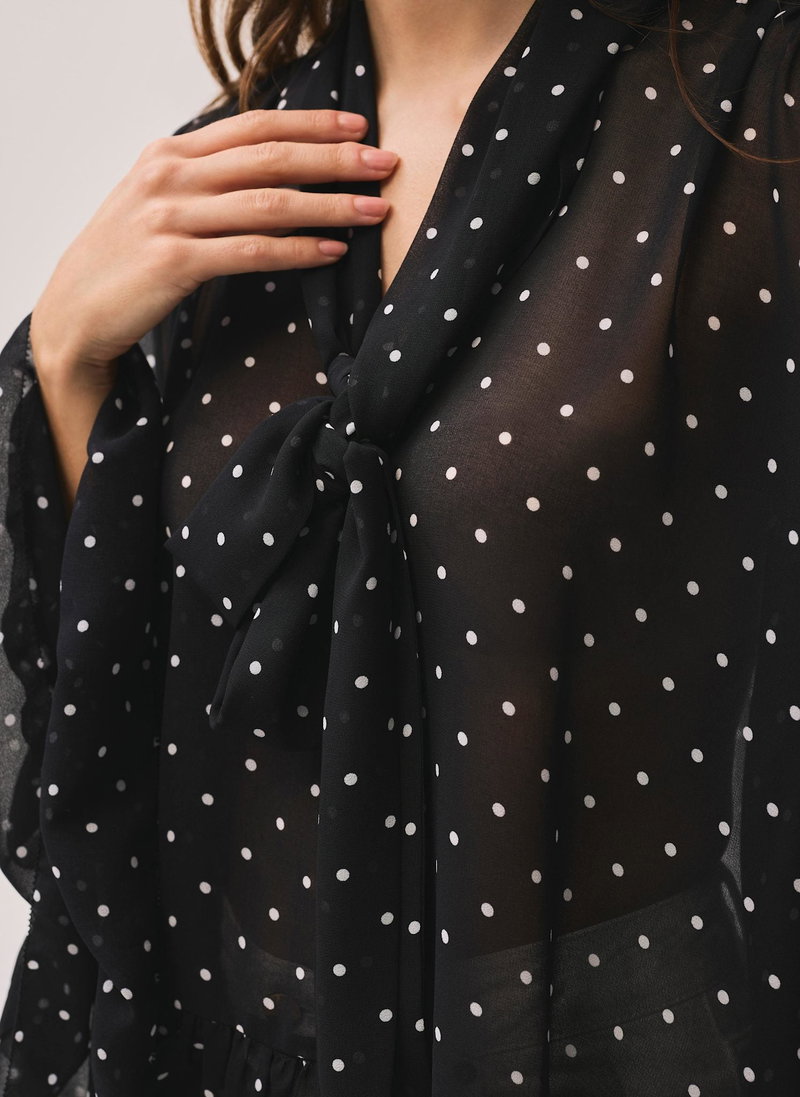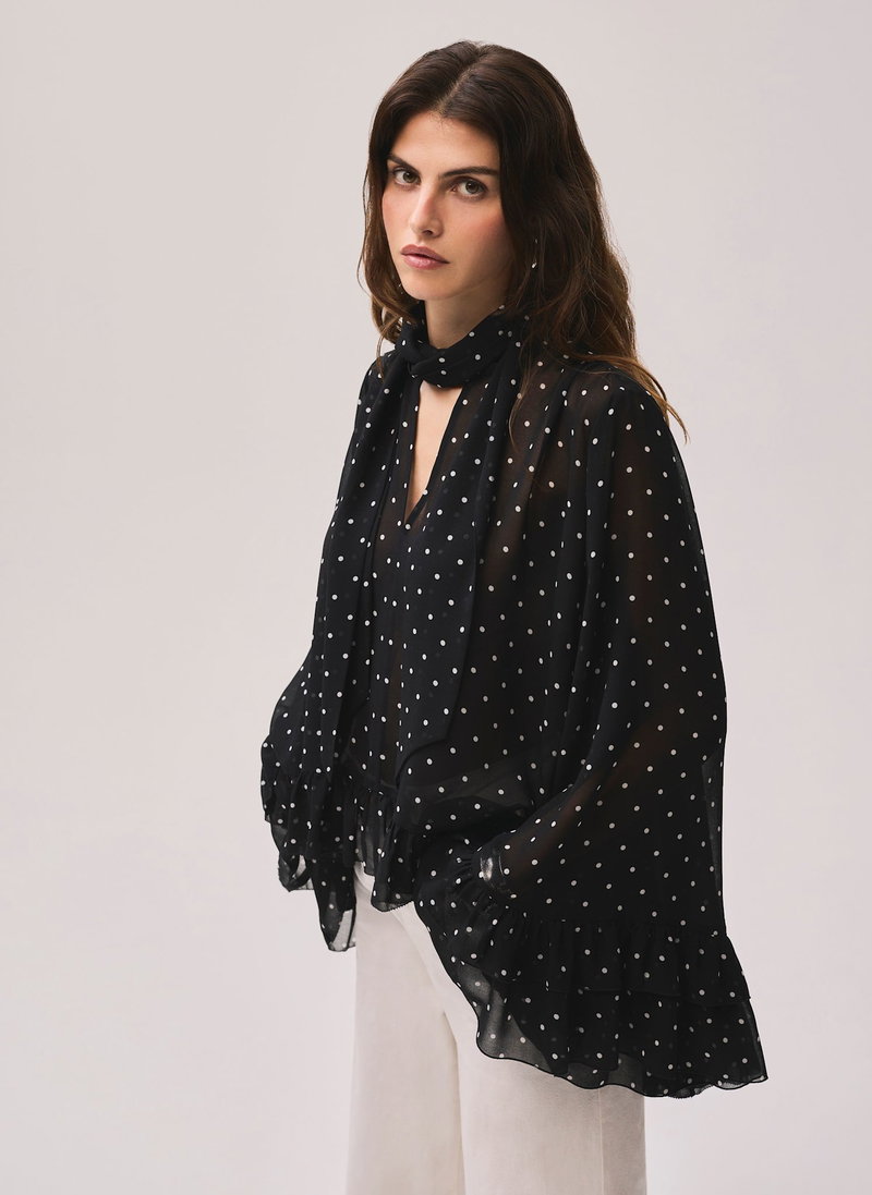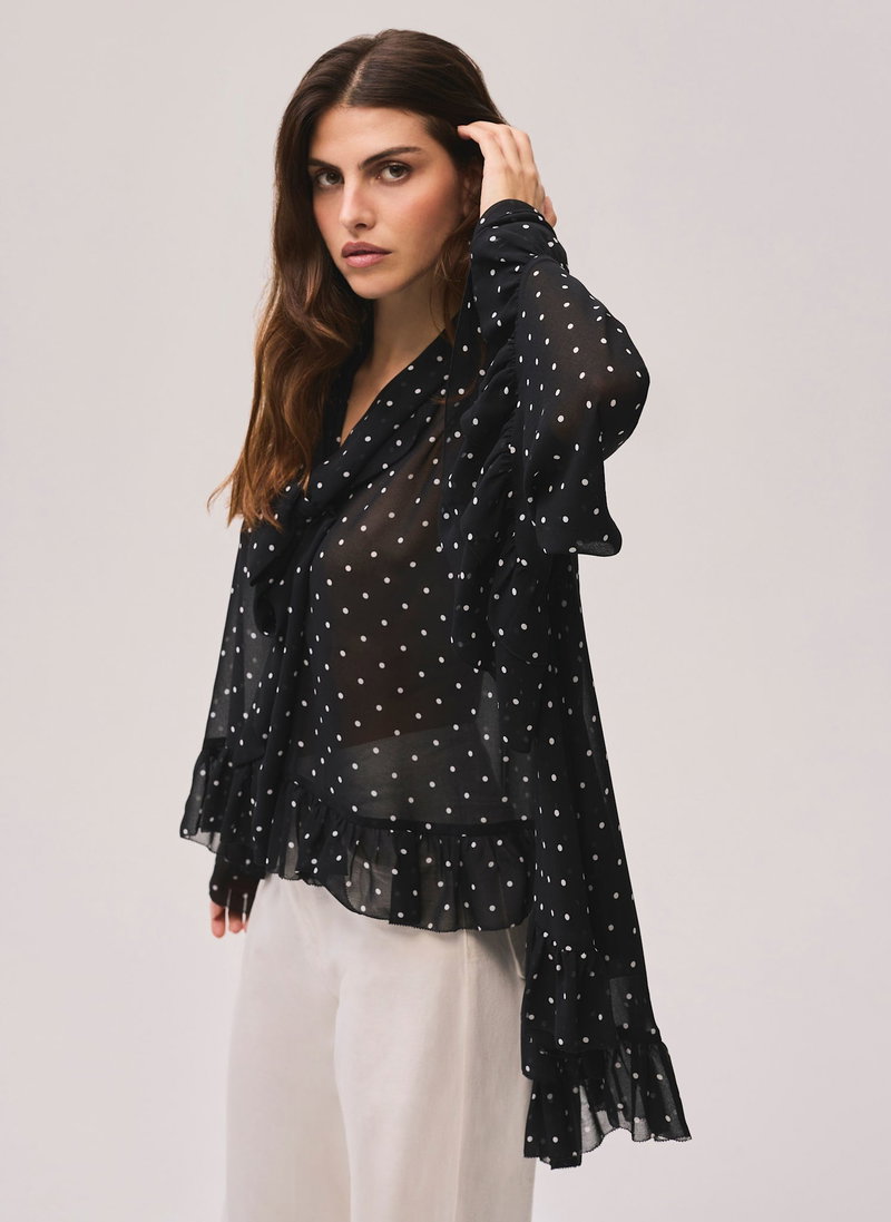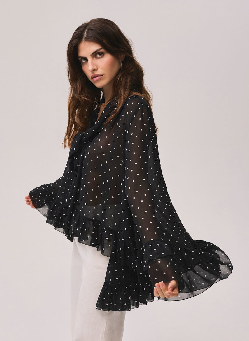 Black polka dot print blouse featuring a pussy bow neckline, long ruffle trim fluted sleeves, drop back hemline with a tie fastening through the front.