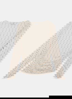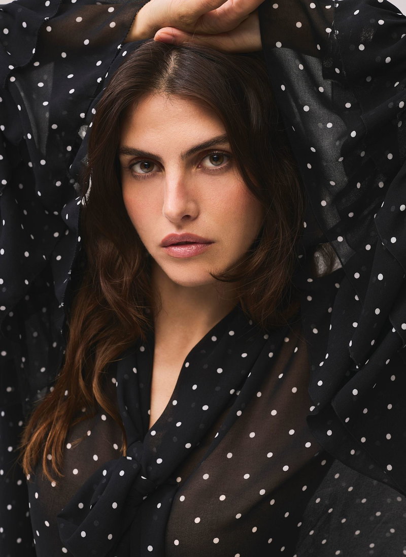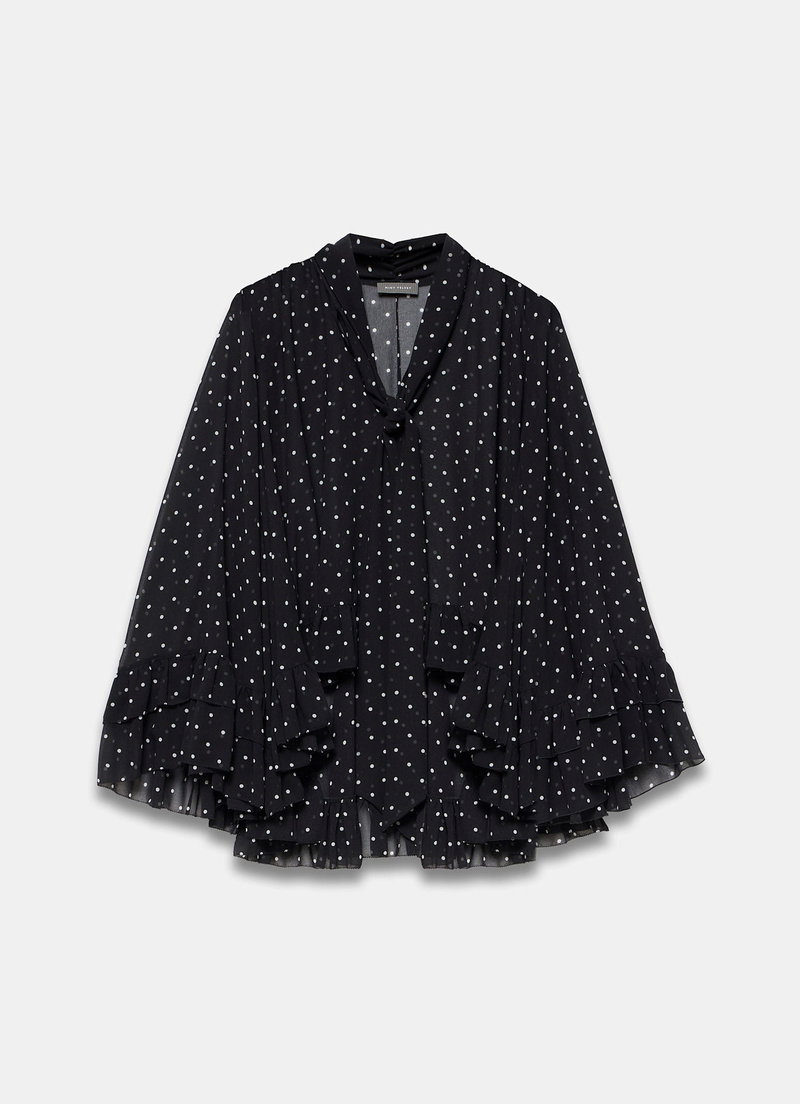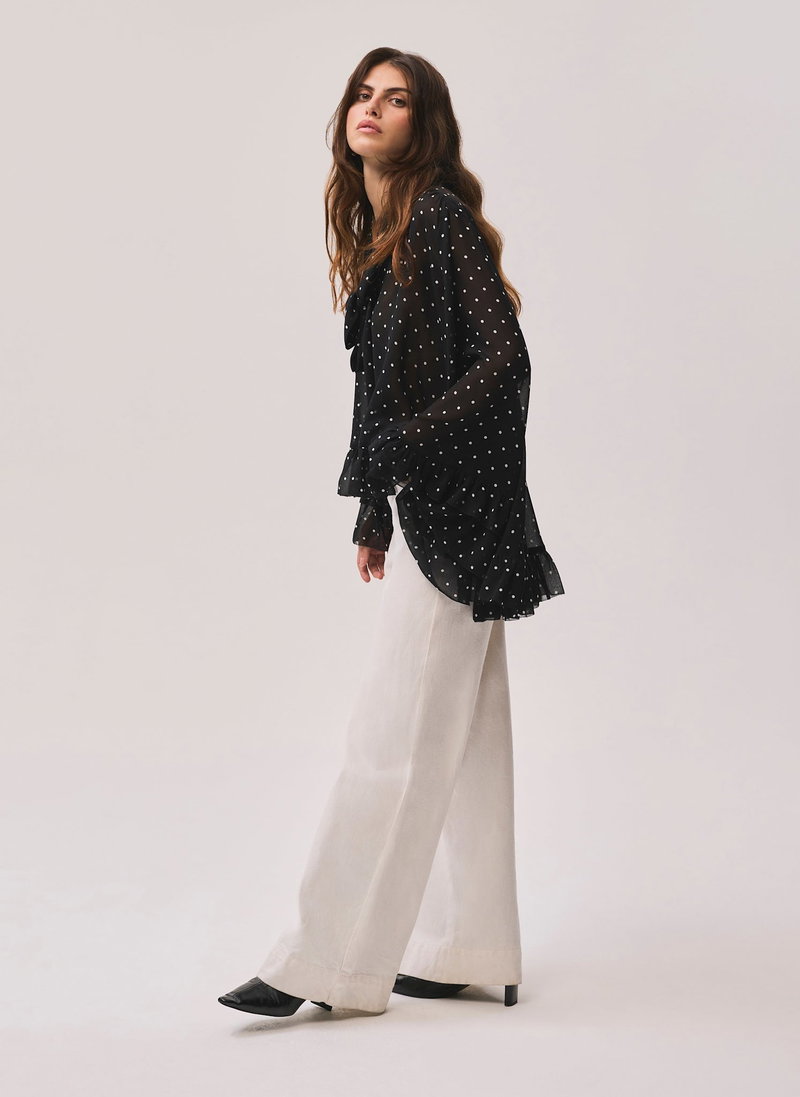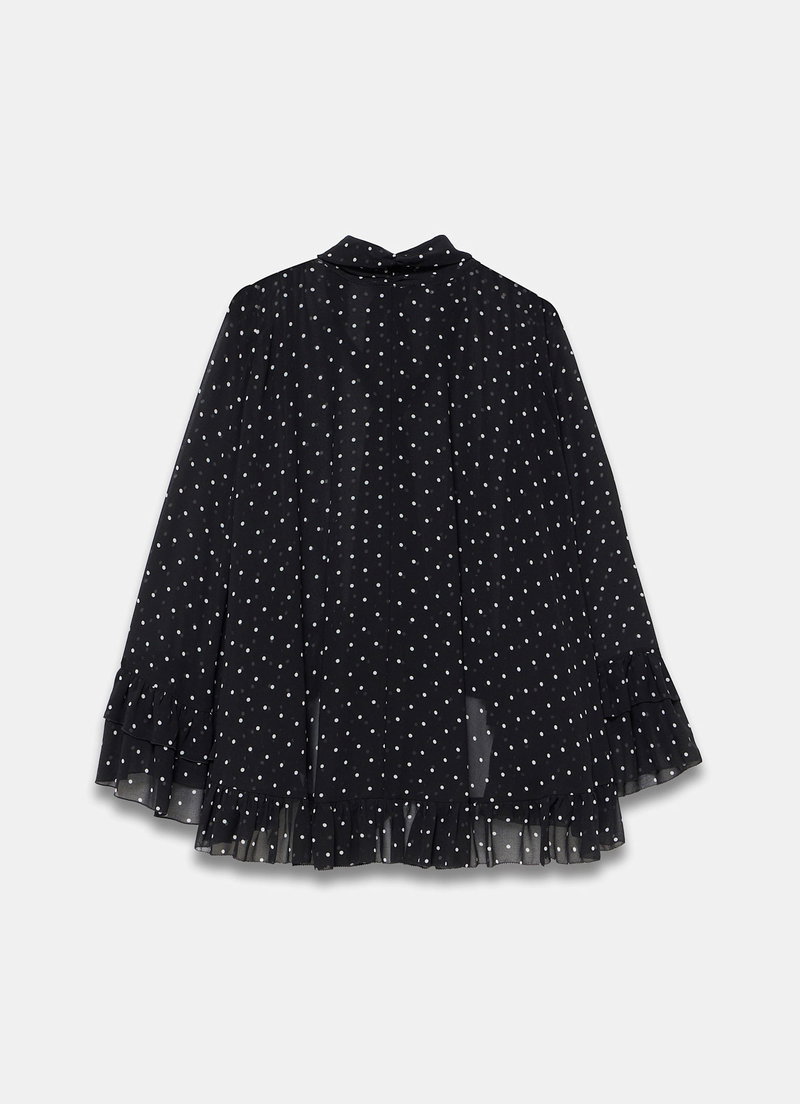 Black polka dot print blouse featuring a pussy bow neckline, long ruffle trim fluted sleeves, drop back hemline with a tie fastening through the front.