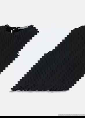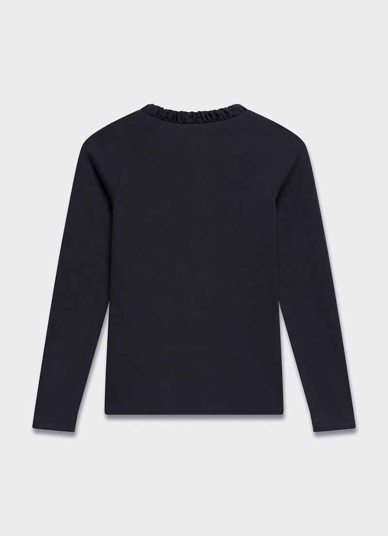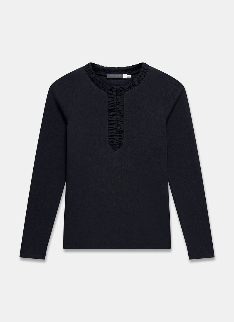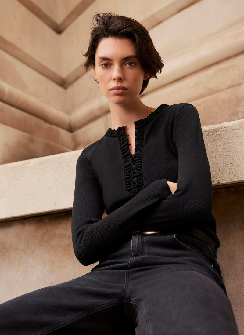 Black top featuring a crew neckline, long sleeves, ruched trim with a button fastening thorough the front.