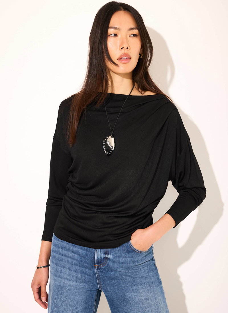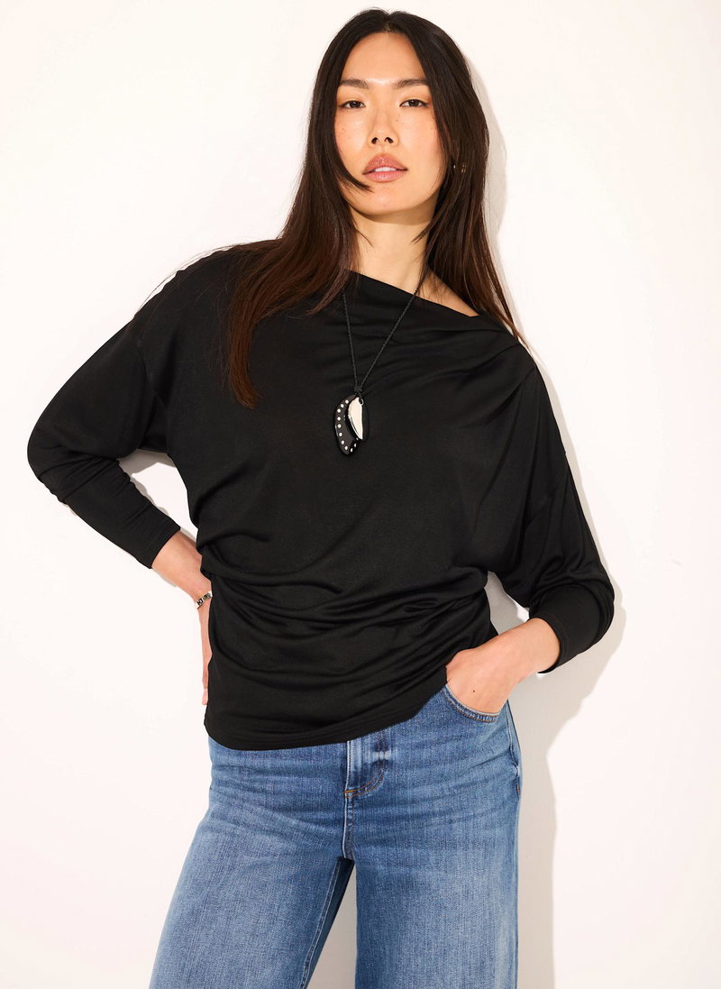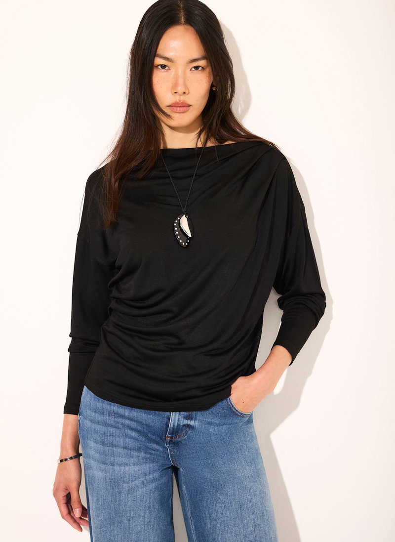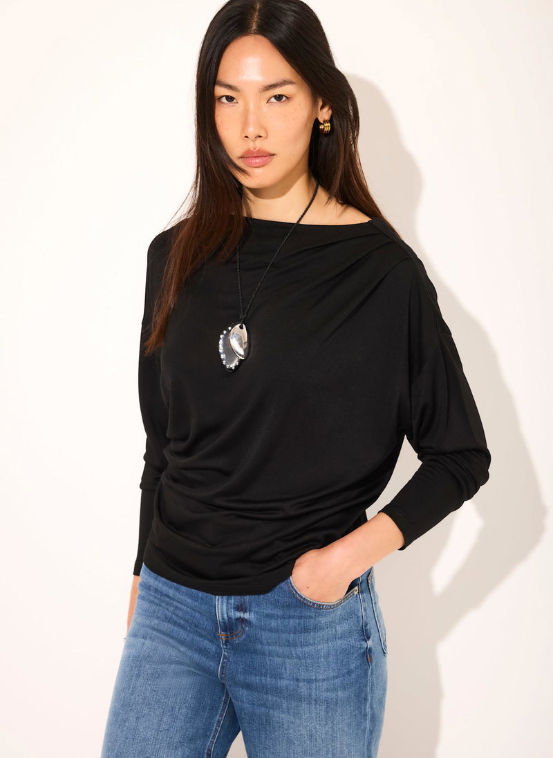 Black top featuring a slash neckline, ruched detailing and long sleeves.
