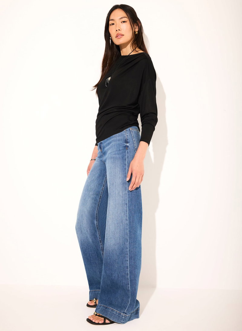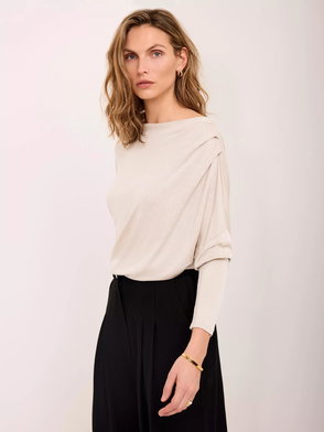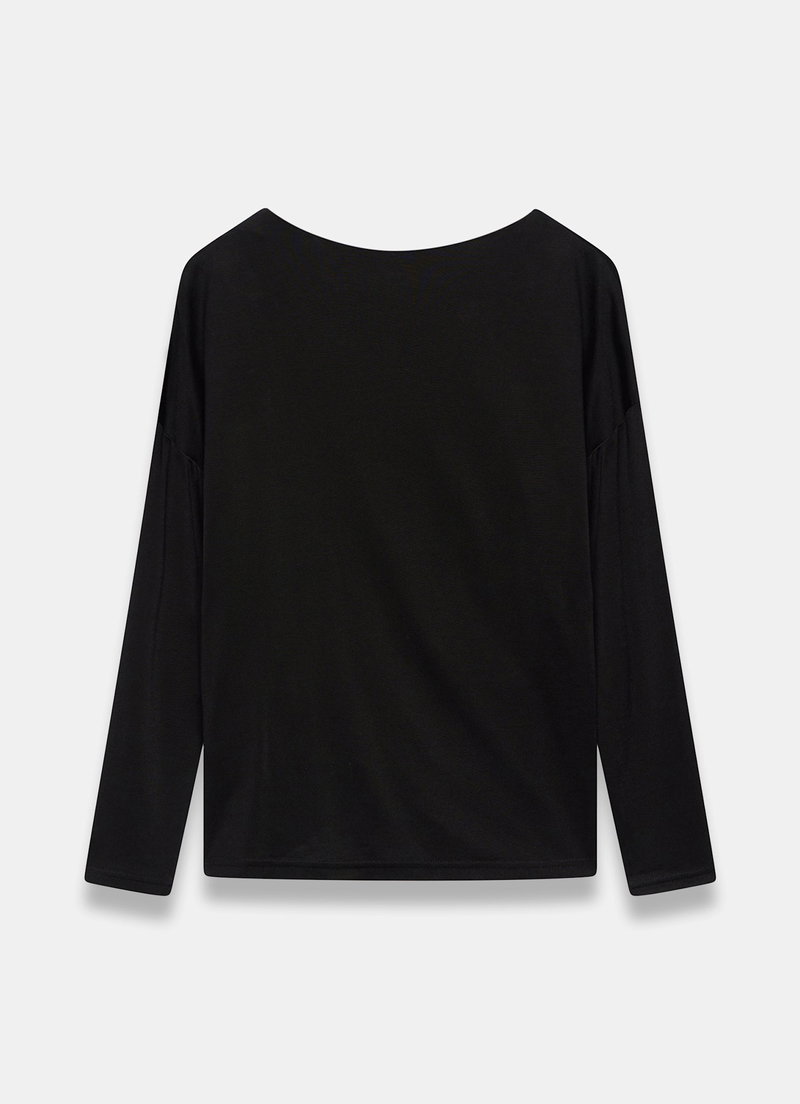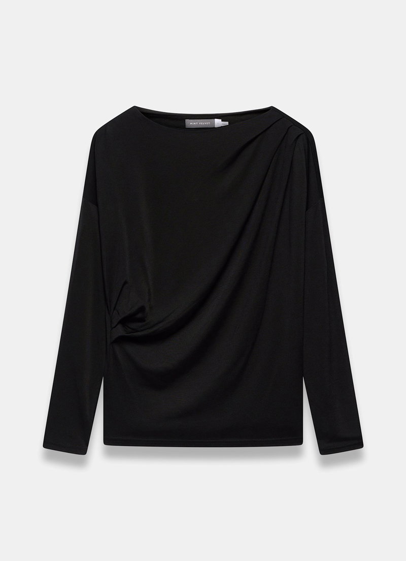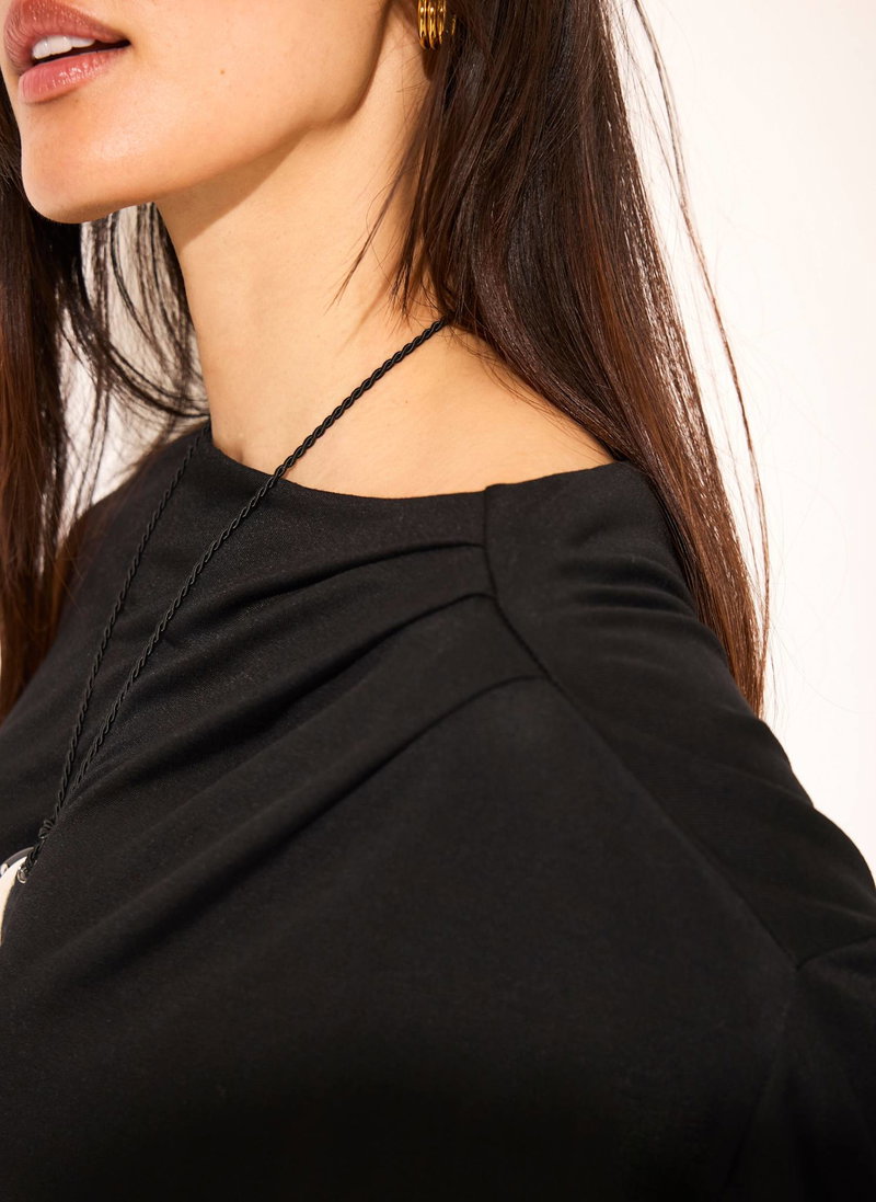 Black top featuring a slash neckline, ruched detailing and long sleeves.