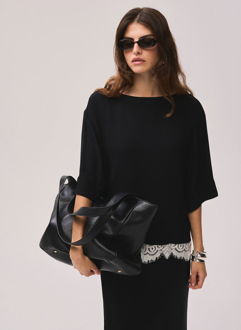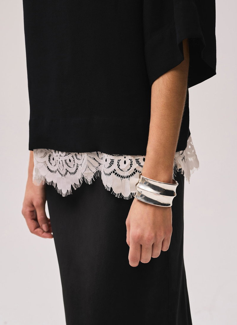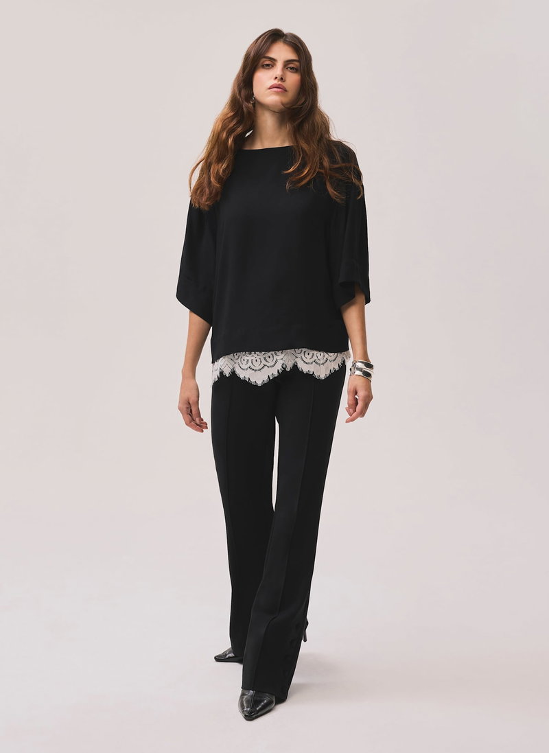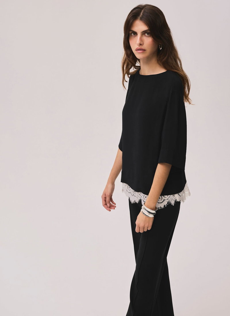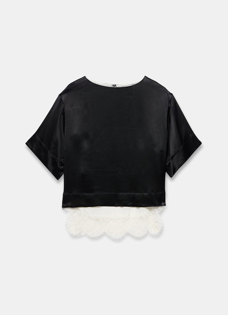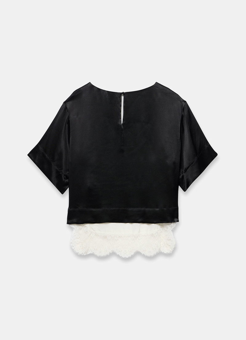 Black satin top featuring a crew neckline, short sleeves and contrast layered lace trim with a button fastening through the back.