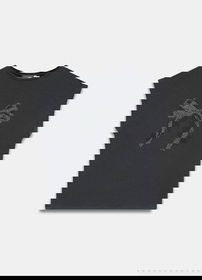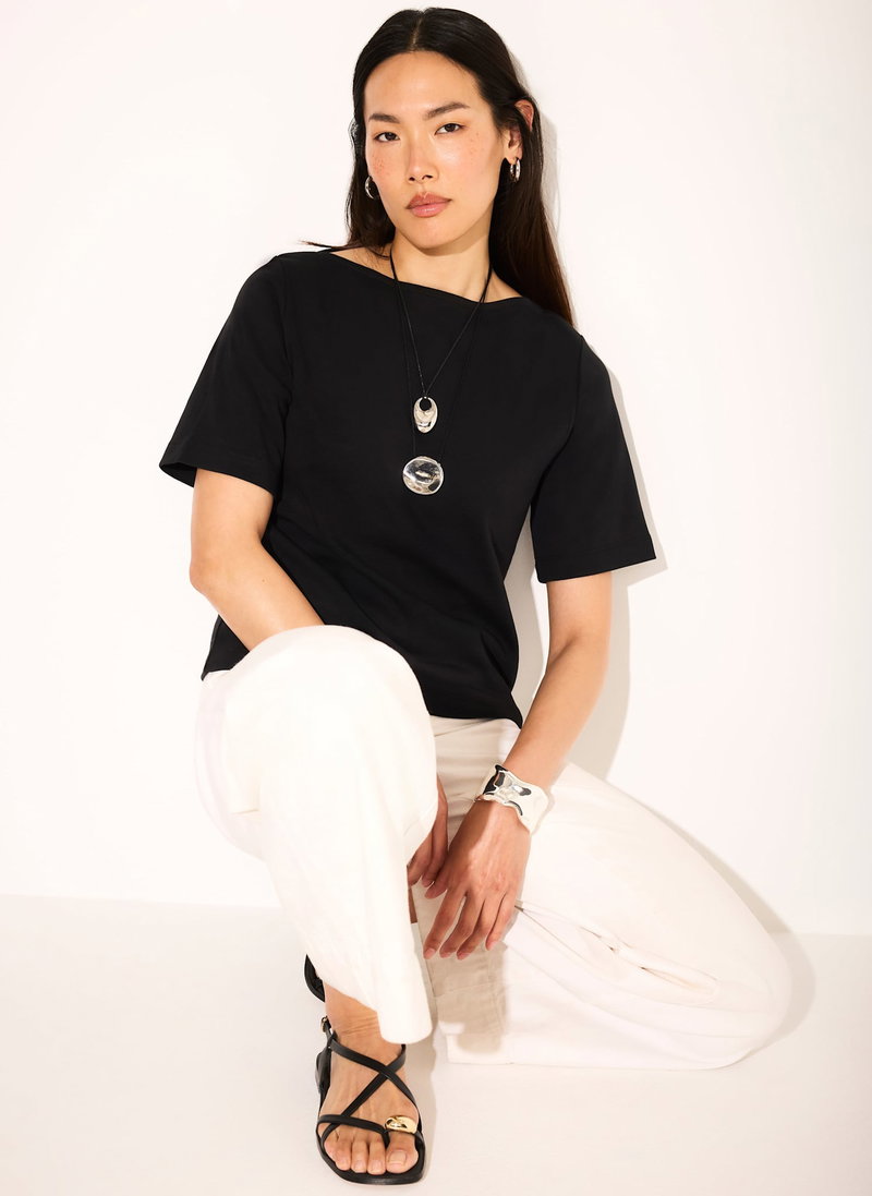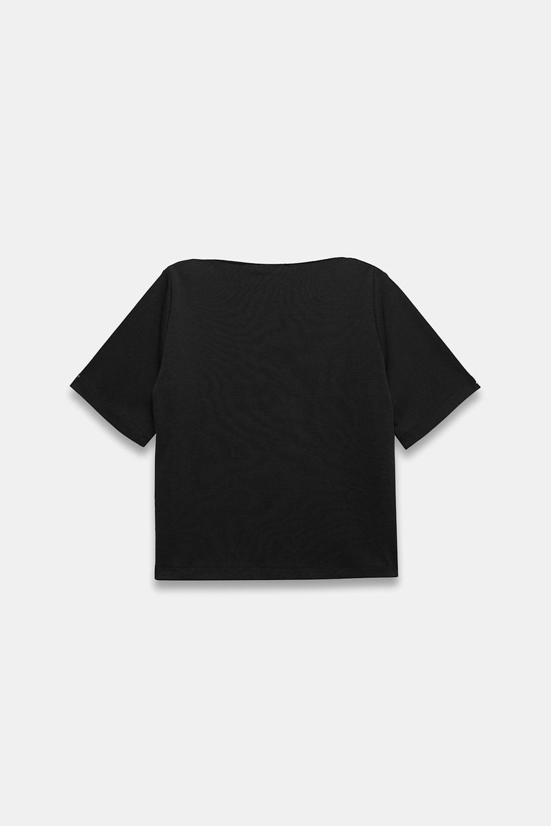 Black t-shirt with a slash neckline and short sleeves.