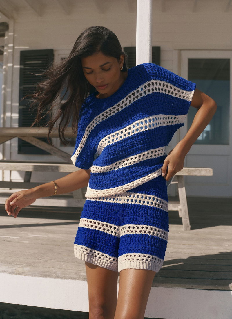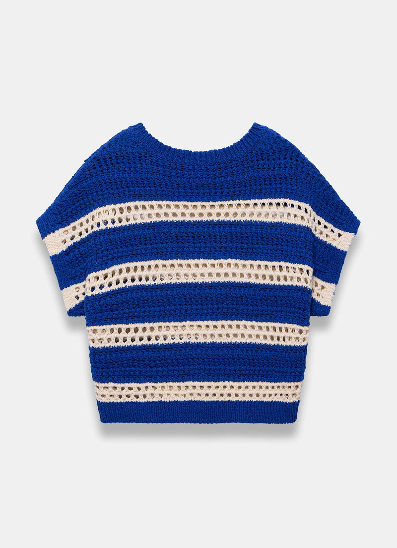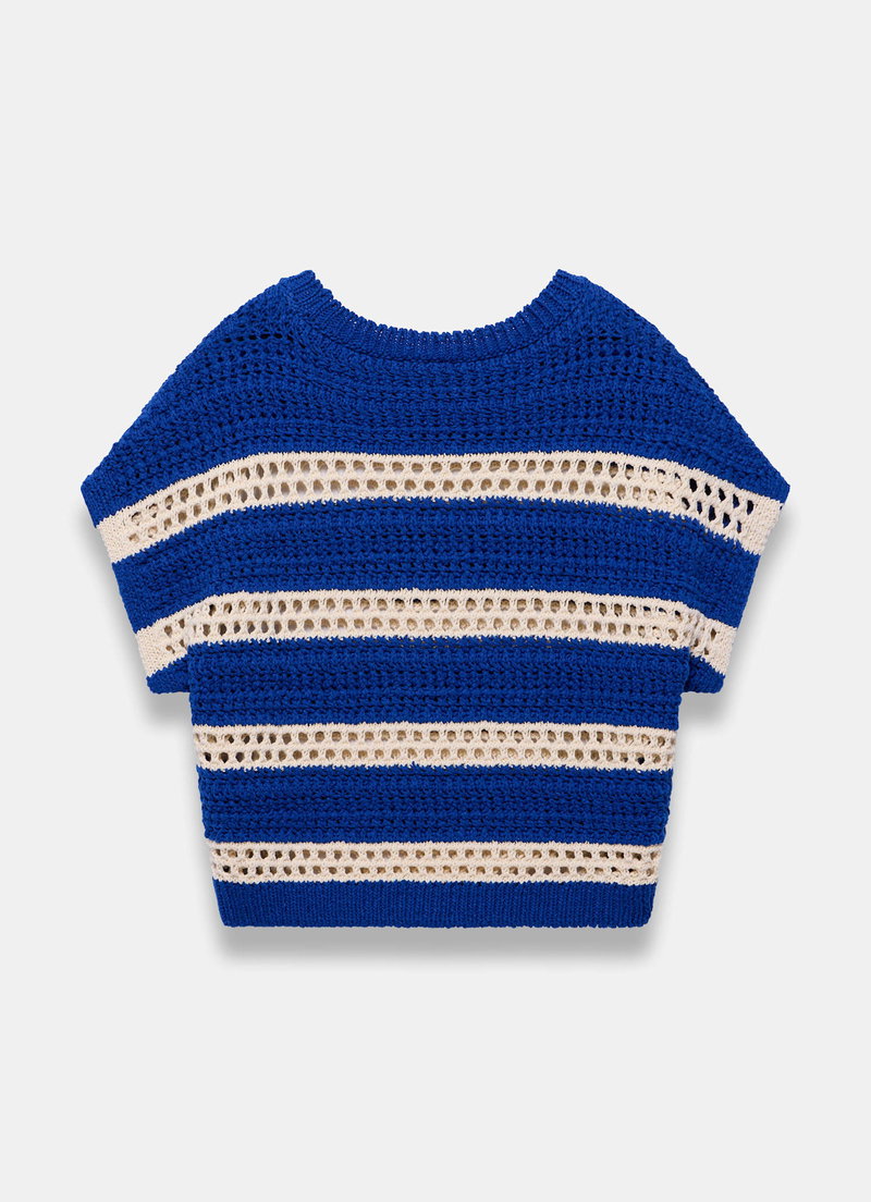 Blue tone striped open stitched top featuring a crew neckline and short sleeves.