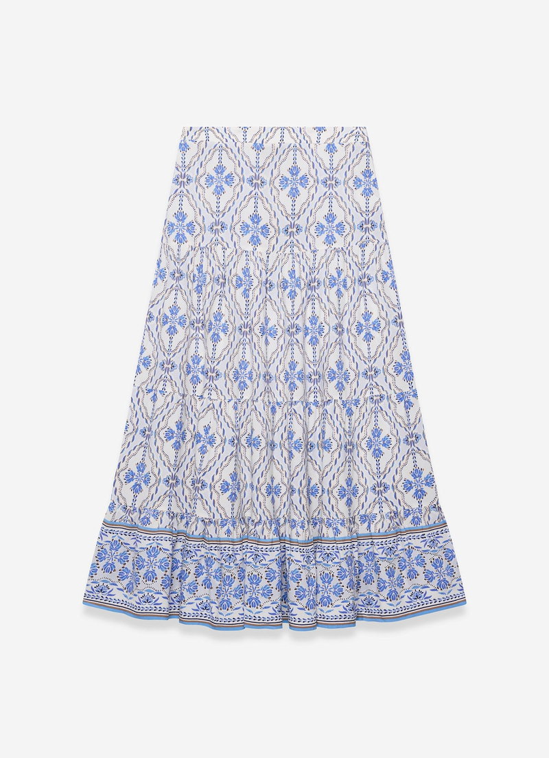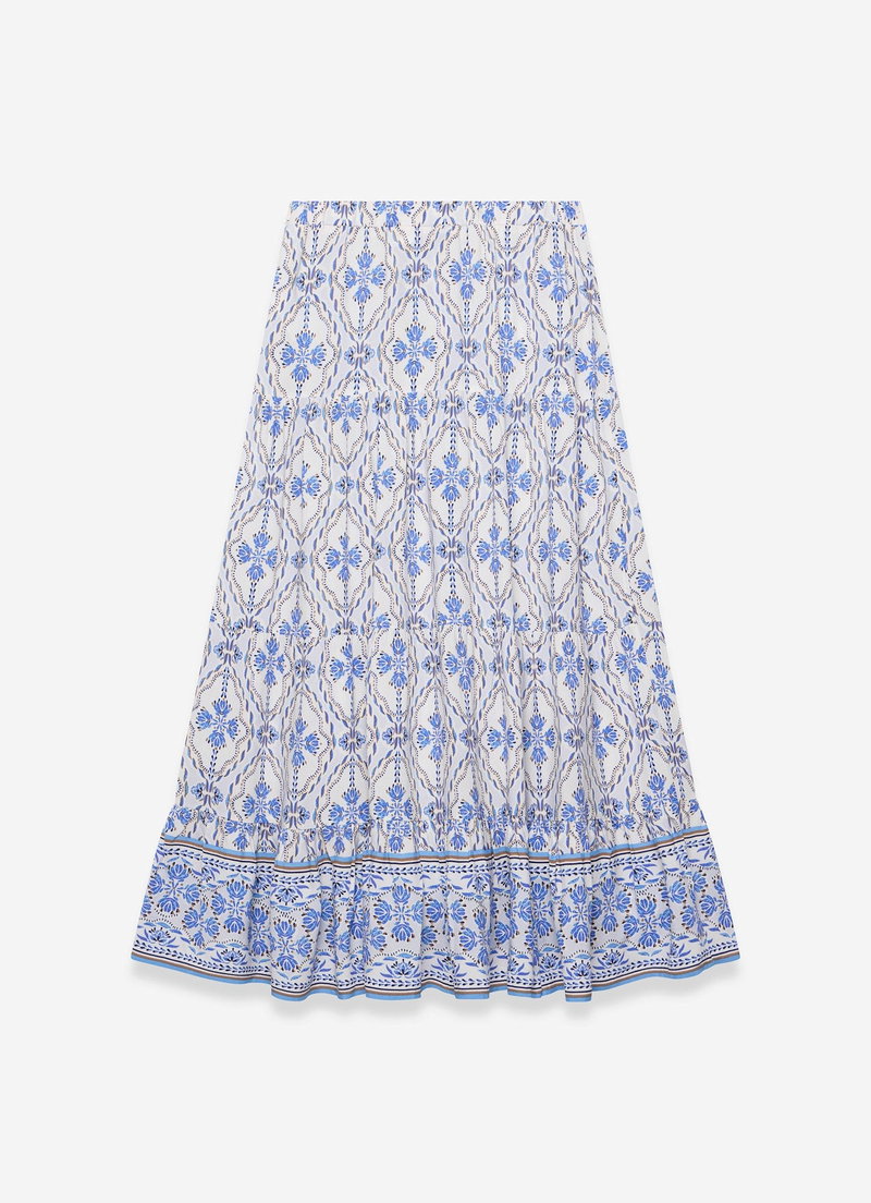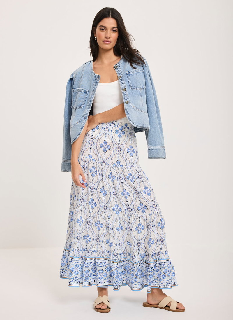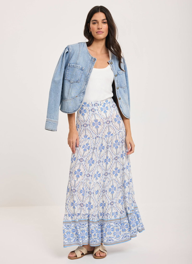 Blue floral print skirt in a maxi silhouette featuring a tiered hemline, border print and zip fastening through the side.