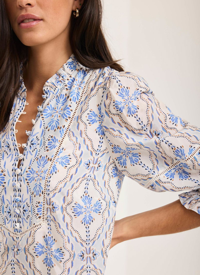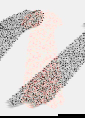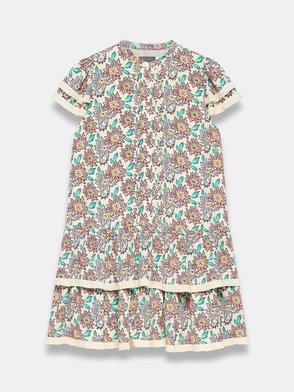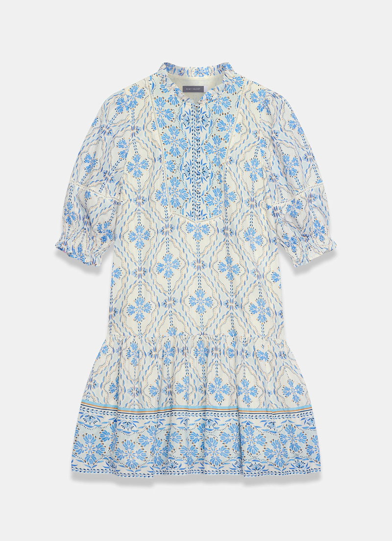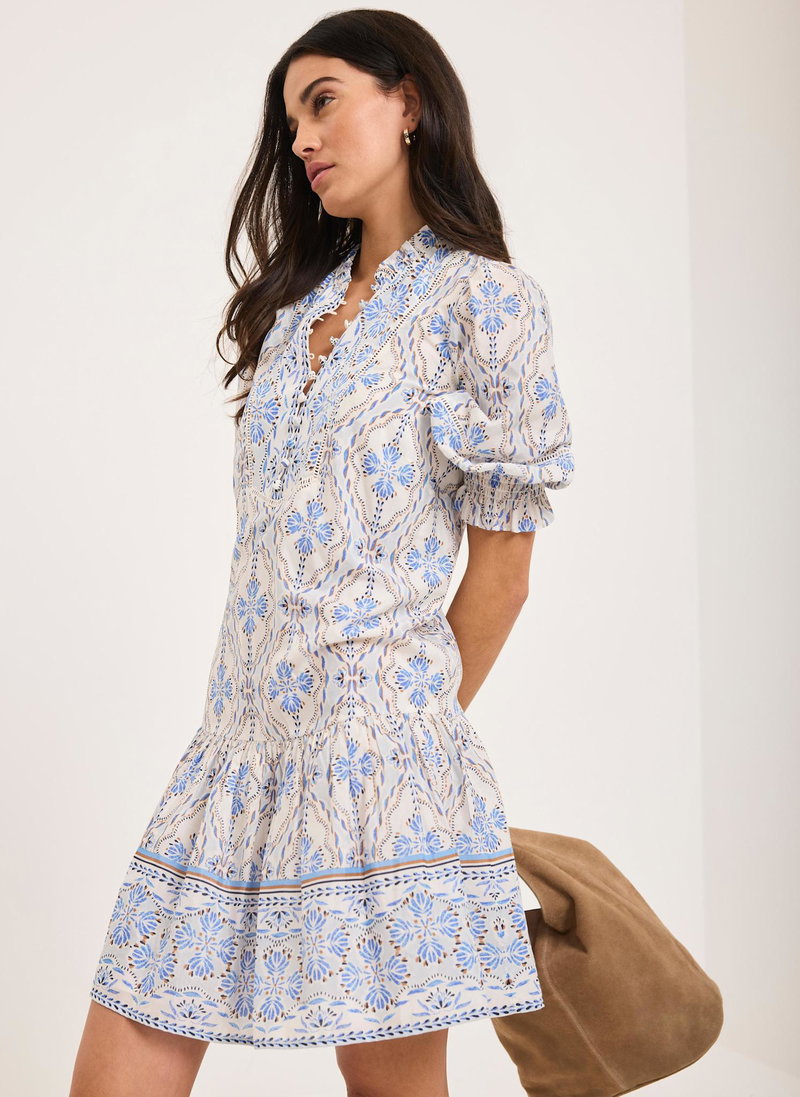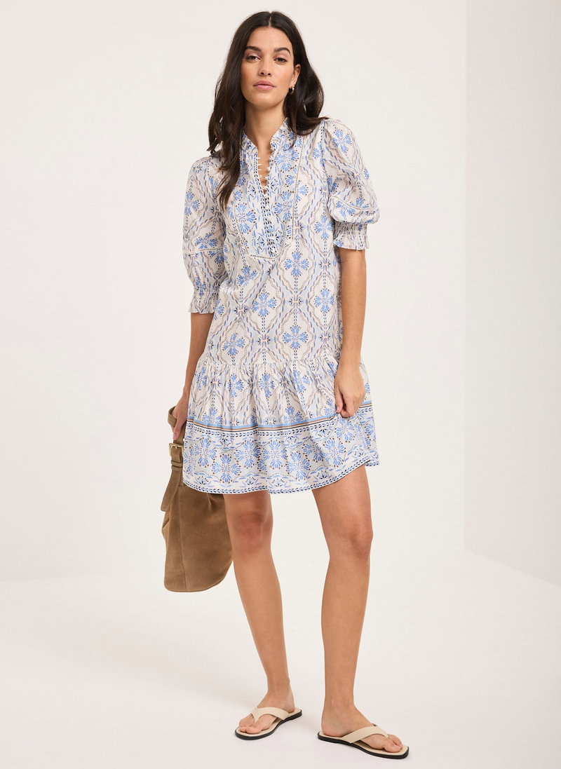 Blue tone floral print dress in a mini silhouette featuring a crew neckline, short elasticated sleeves, dropped waistband, border print hemline with a button fastening through the front.