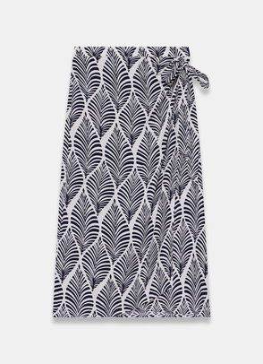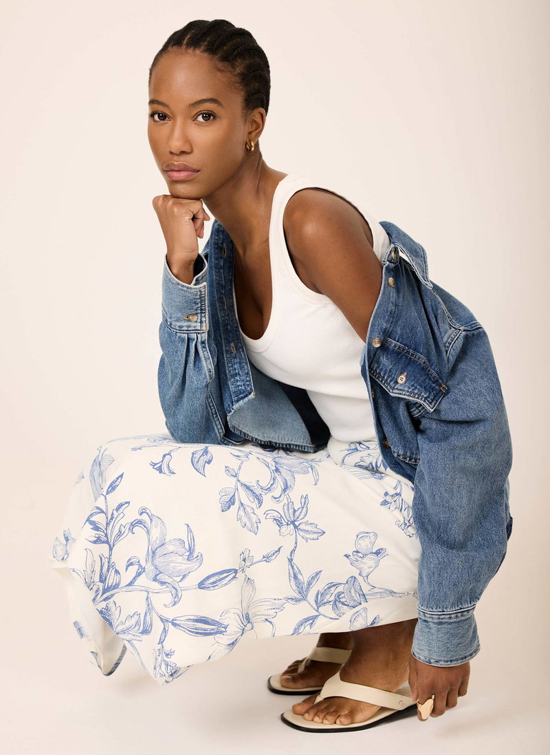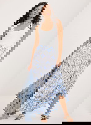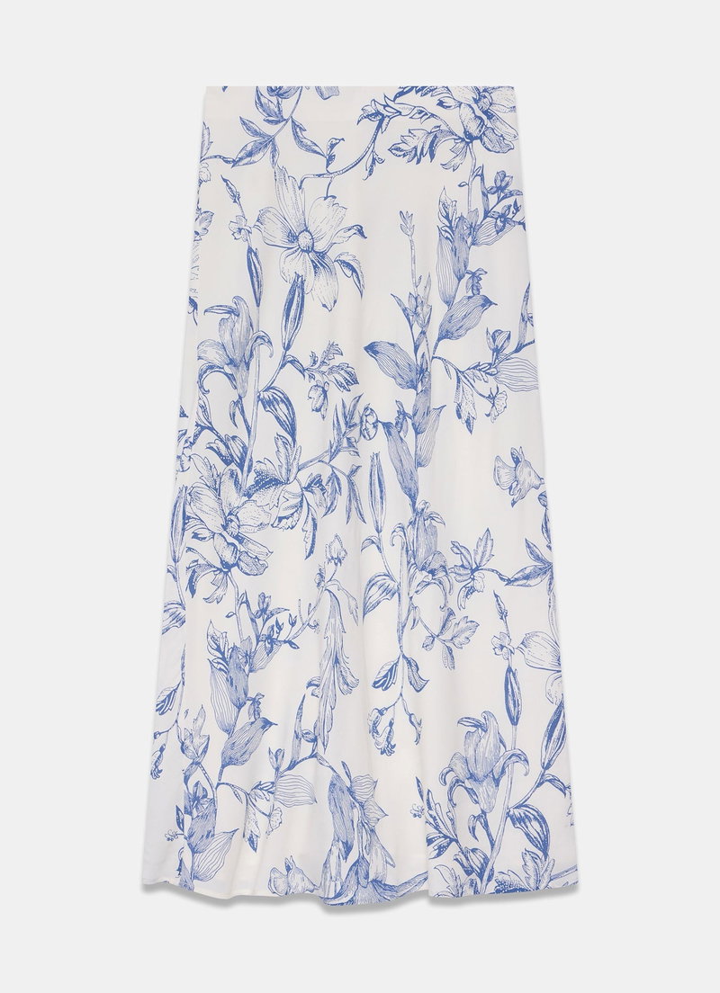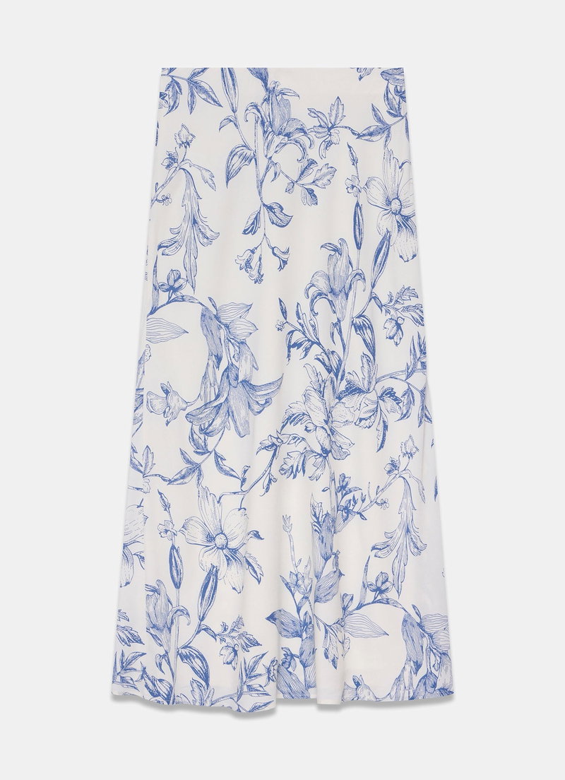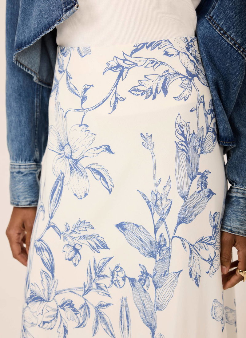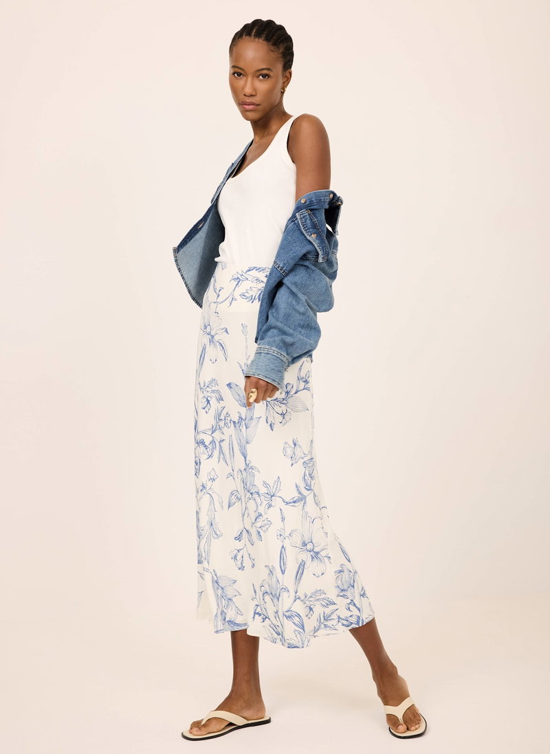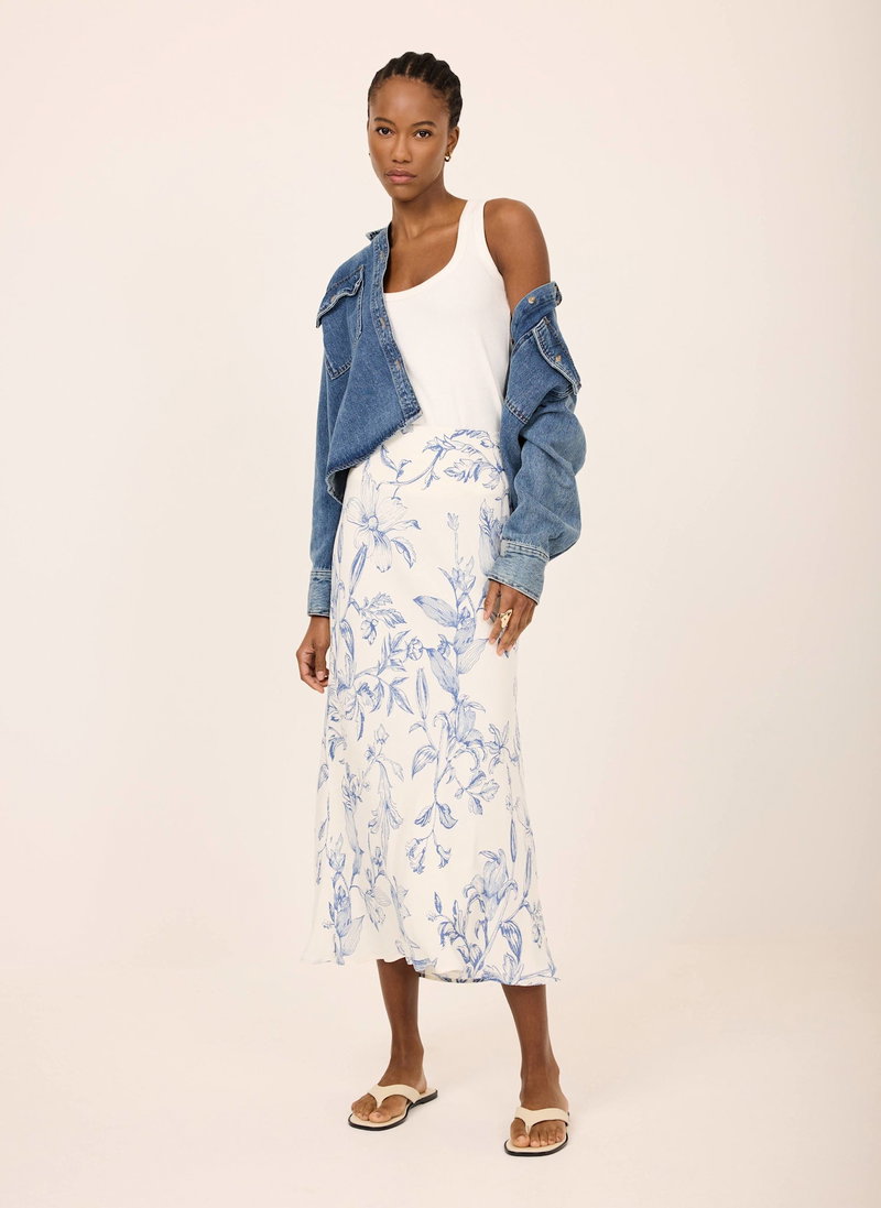 White slip skirt with blue floral print in a midi silhouette featuring an elasticated waistband and bias cut hemline.