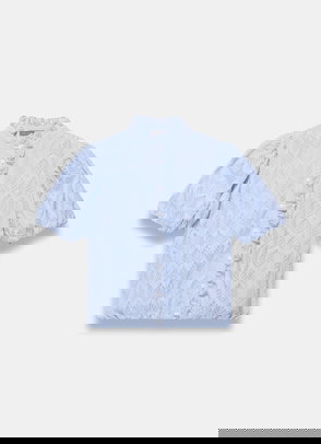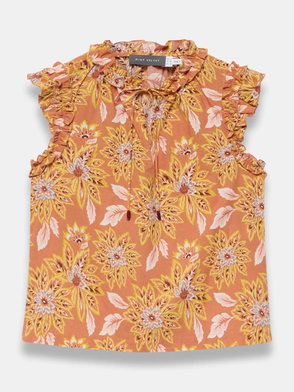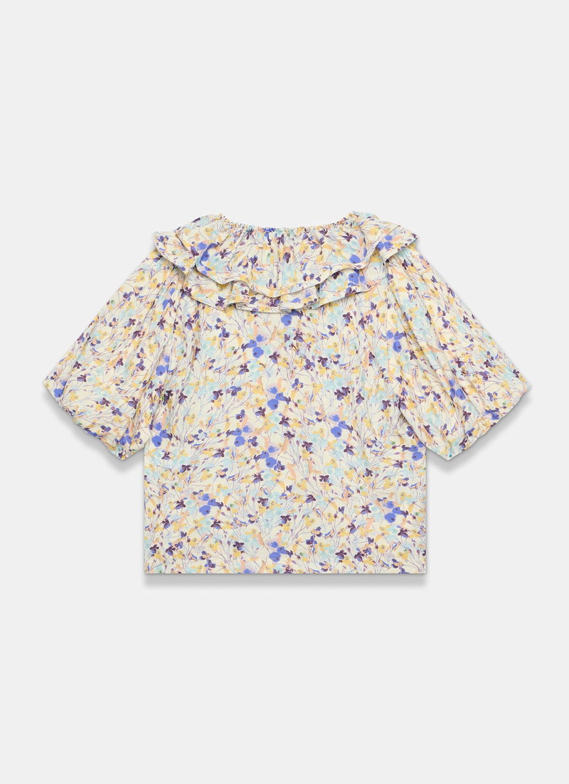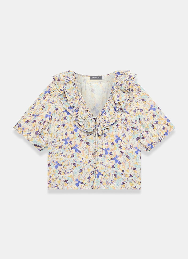 Blue floral print blouse featuring a ruffle-trim V-neckline, short puff sleeves with a button and tie fastening through the front.