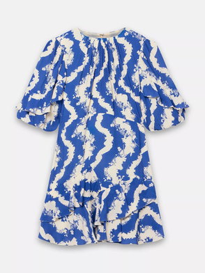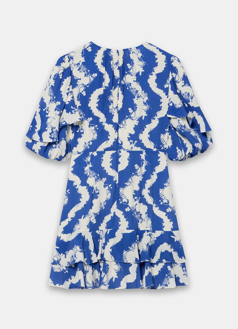 Blue print dress in a mini silhouette featuring a crew neckline, gathered detail, short ruffle sleeves, ruffle hemline with a zip fastening through the back.