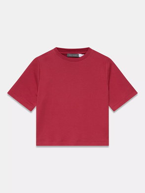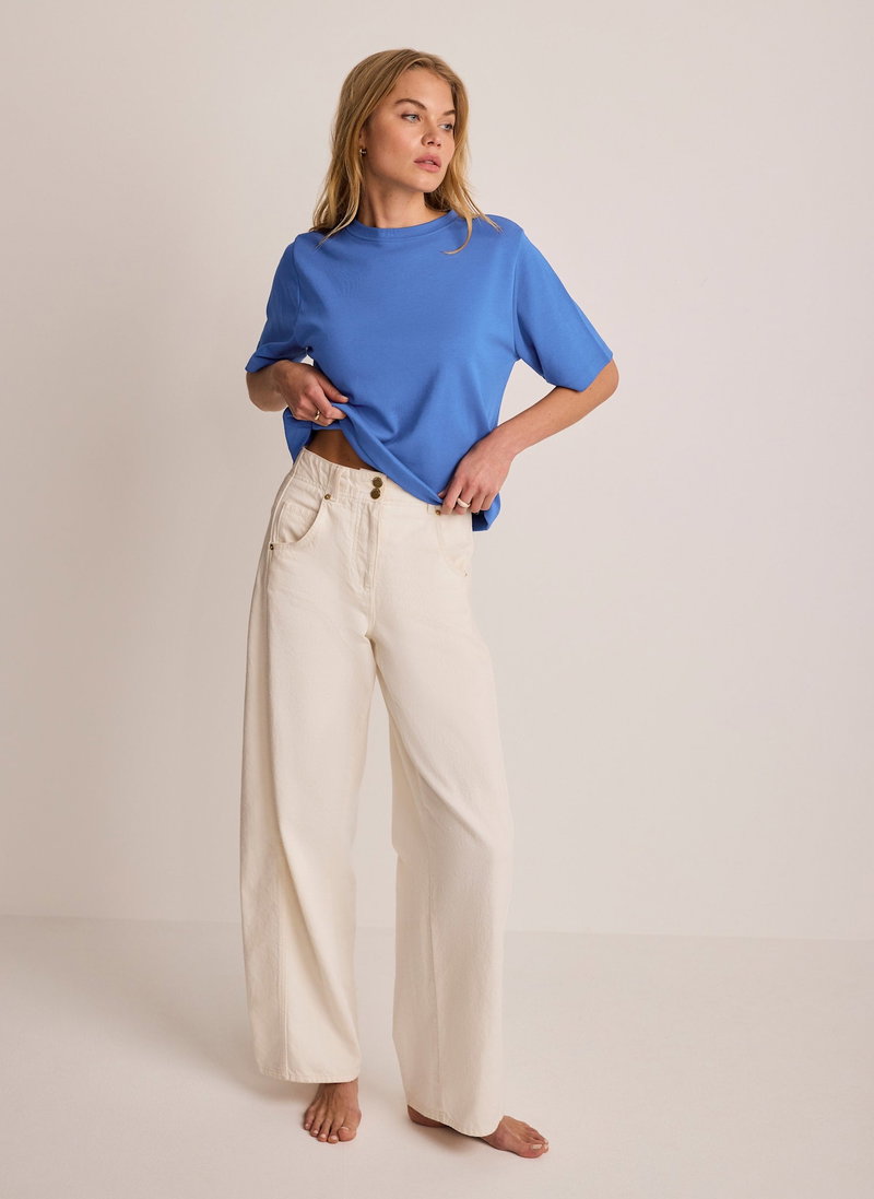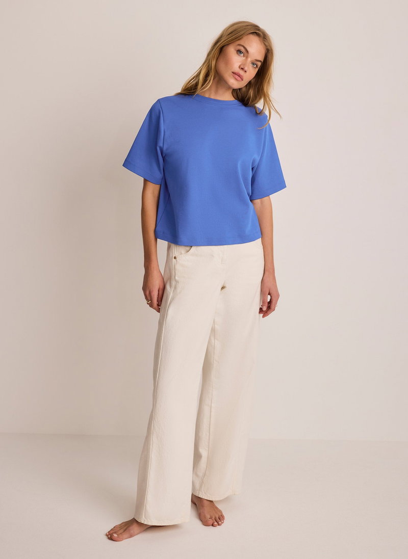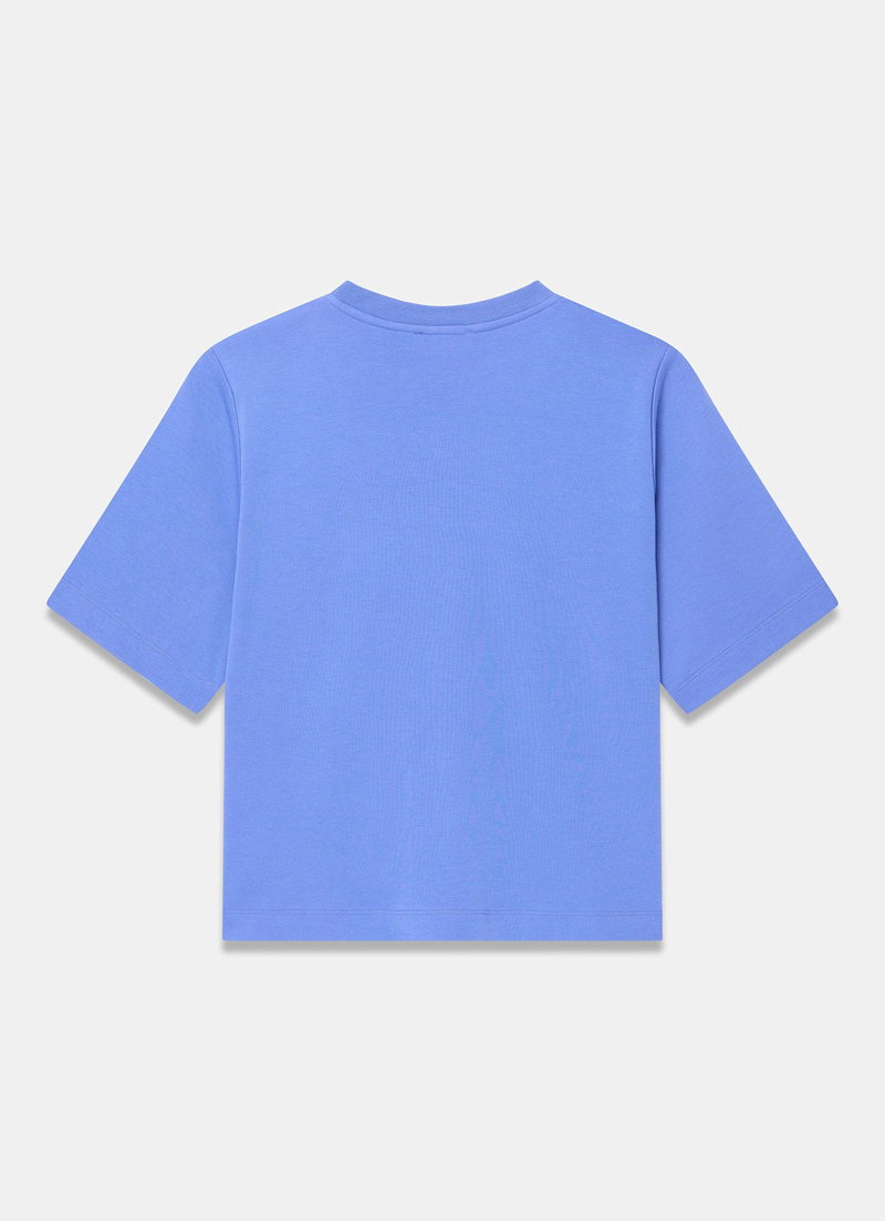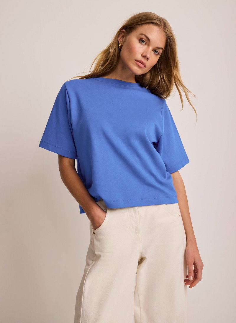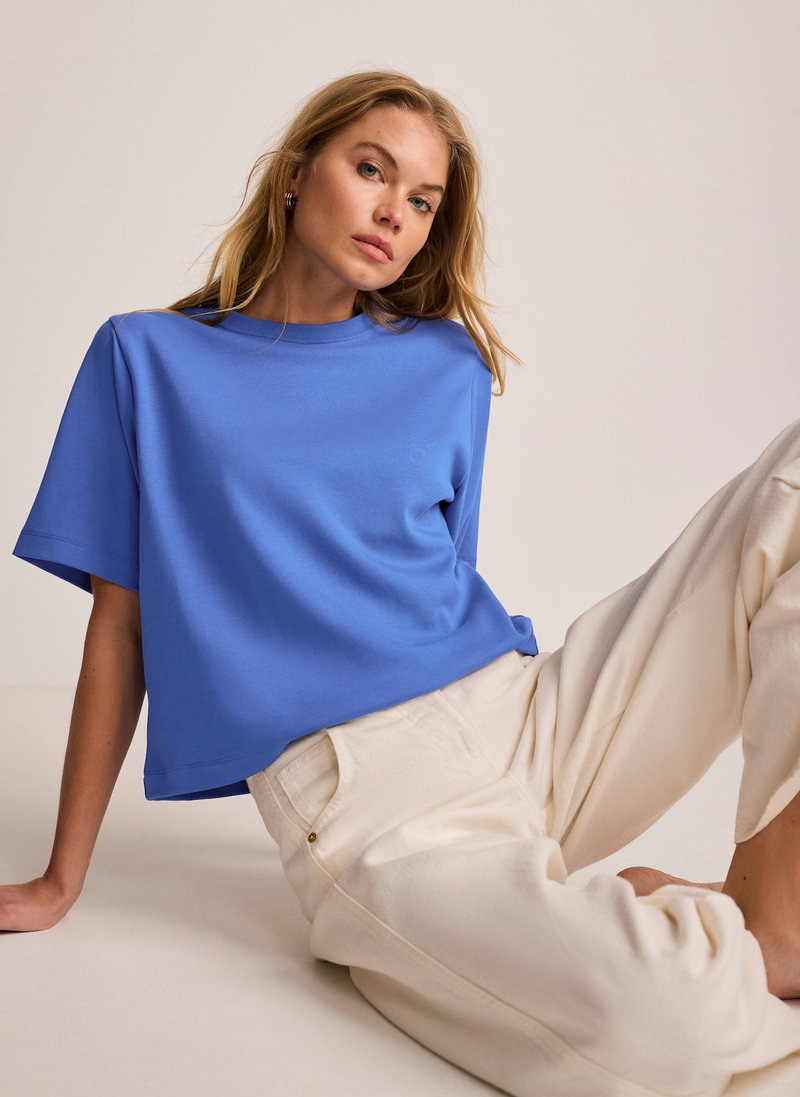 • Blue cotton T-shirt in a boxy silhouette with a crew neckline and short sleeves.