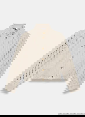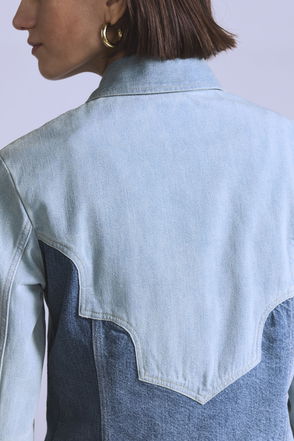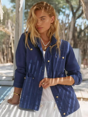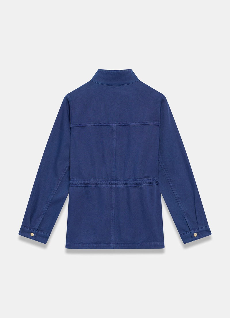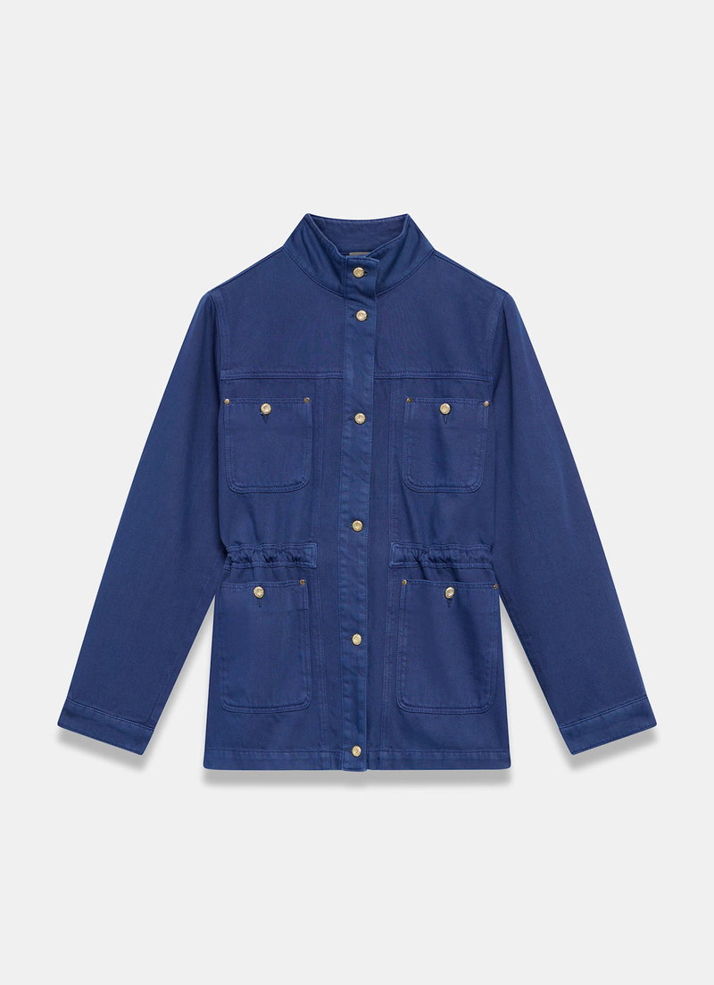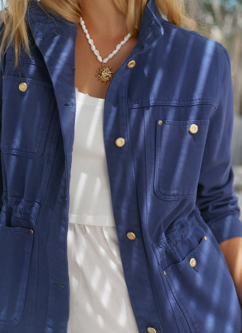 Blue utility shacket featuring a high neckline, long sleeves, front patch pockets and a gold-tone button fastening through the front.