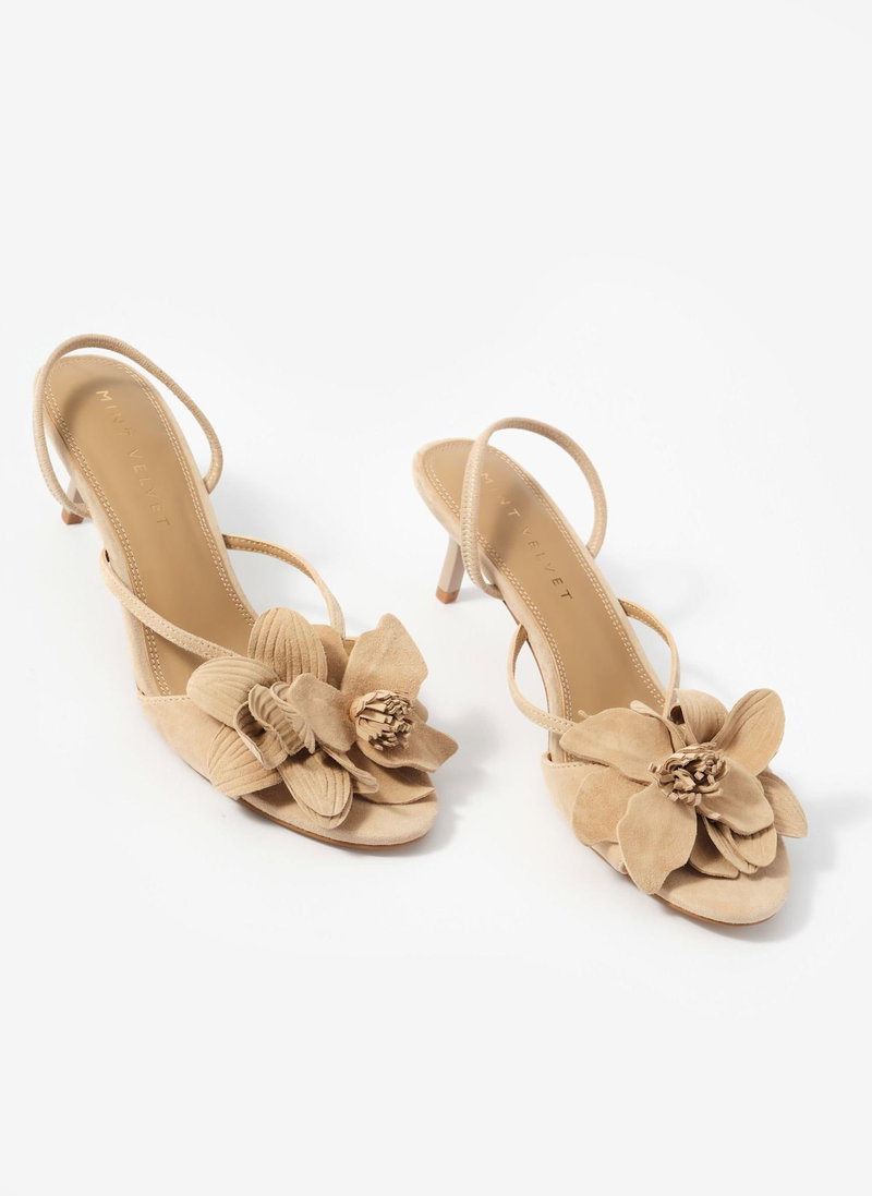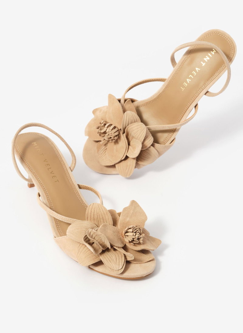 Neutral low heels suede sandals featuring 3D suede flower detailing and an elasticated back strap.