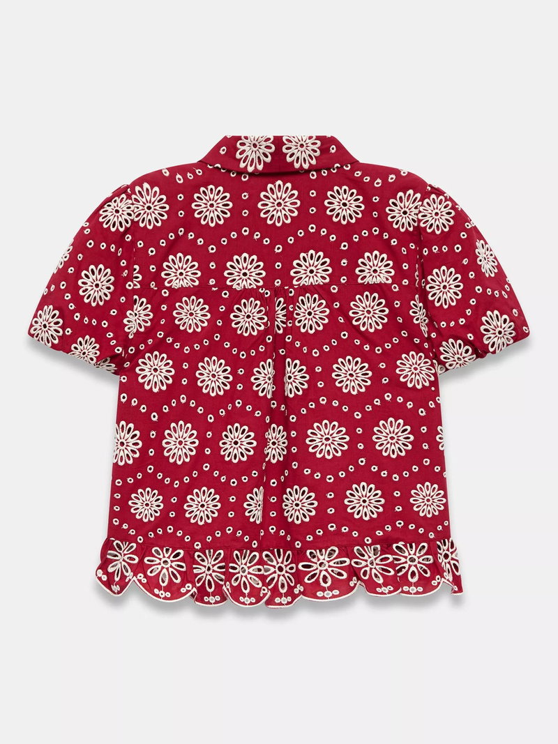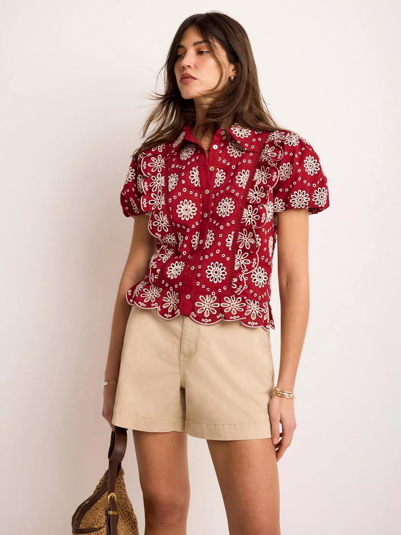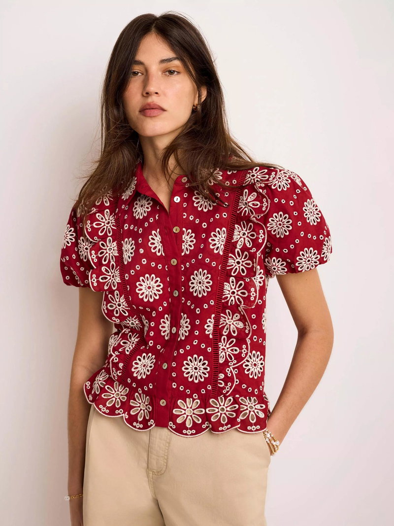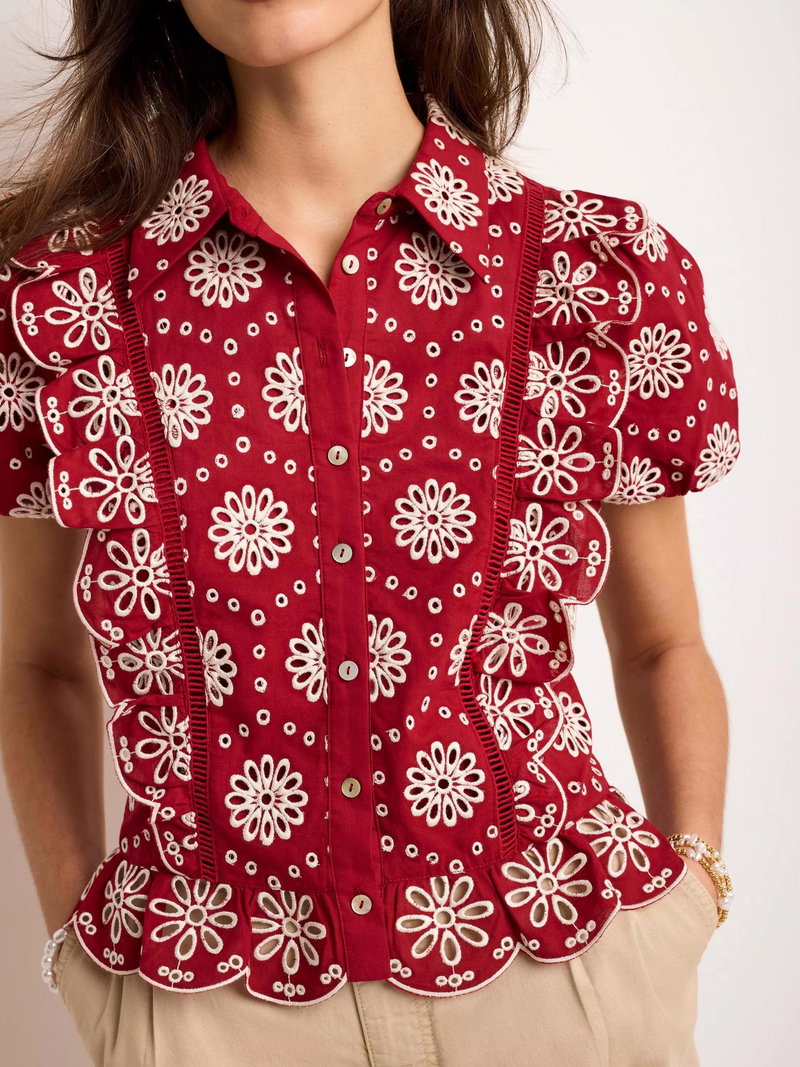 A broderie shirt featuring a classic collar, open stitch detail, ruffle trim, short puff sleeves, scallop hemline with a button fastening through the front.