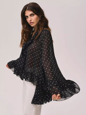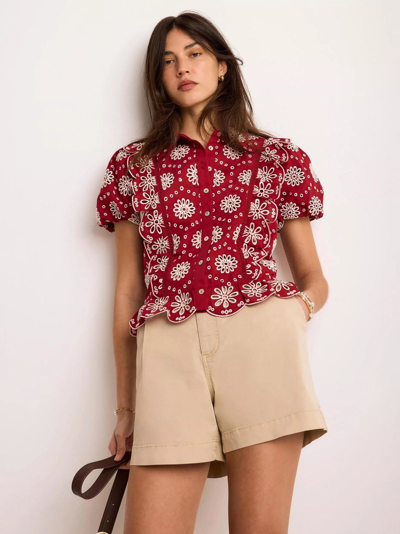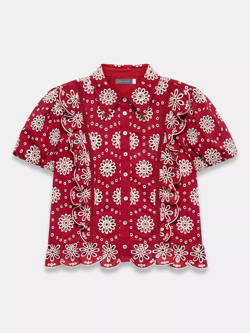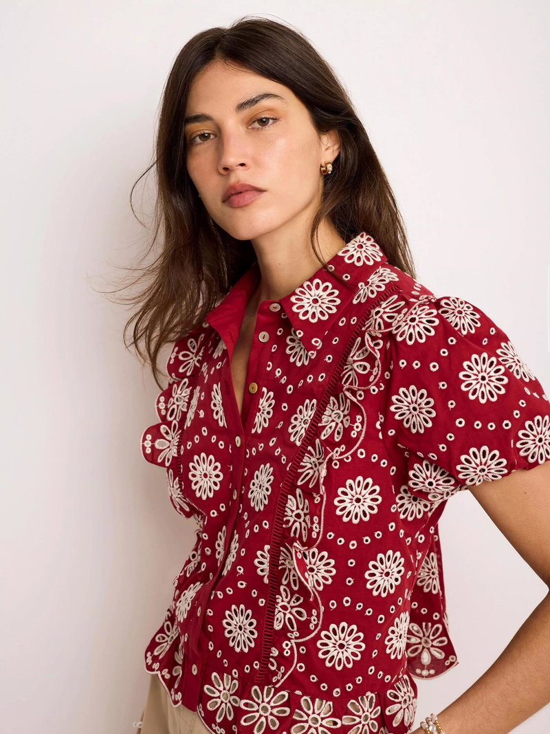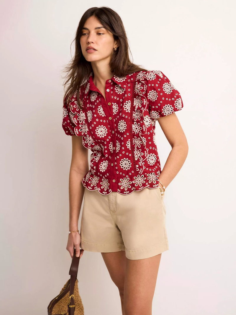 A broderie shirt featuring a classic collar, open stitch detail, ruffle trim, short puff sleeves, scallop hemline with a button fastening through the front.