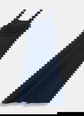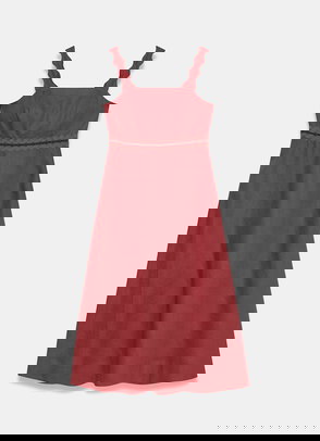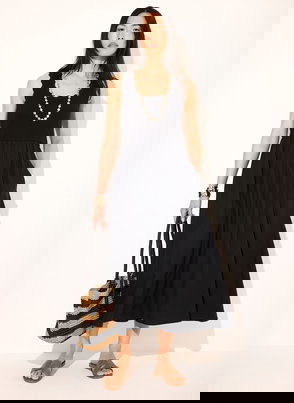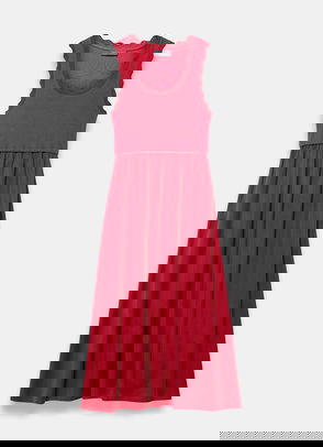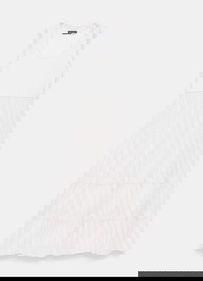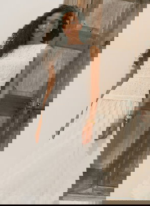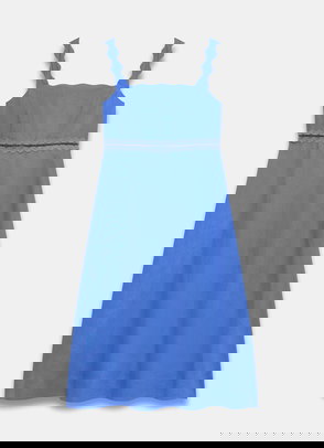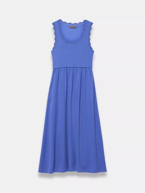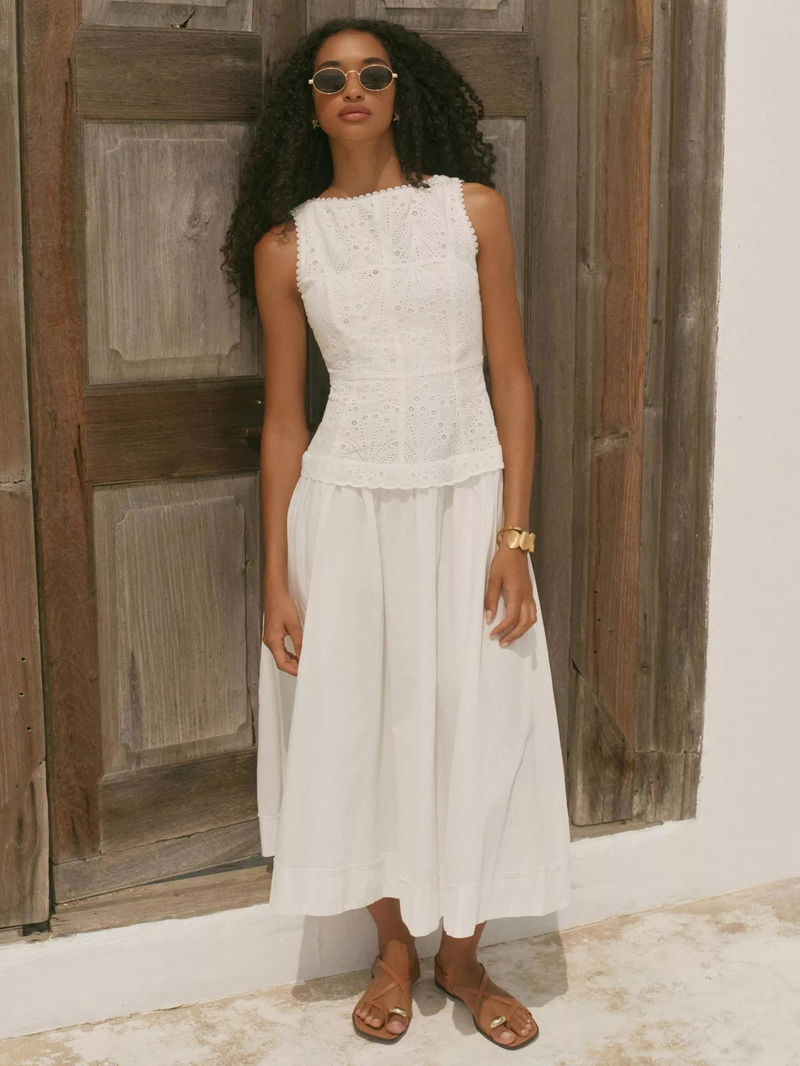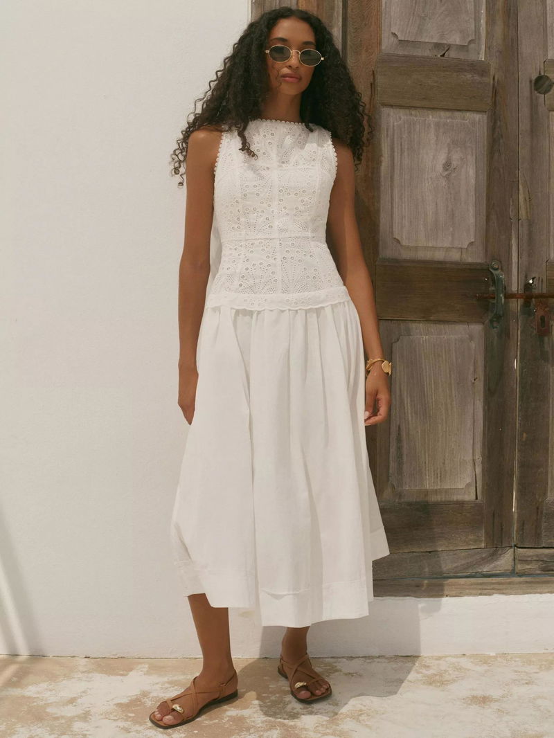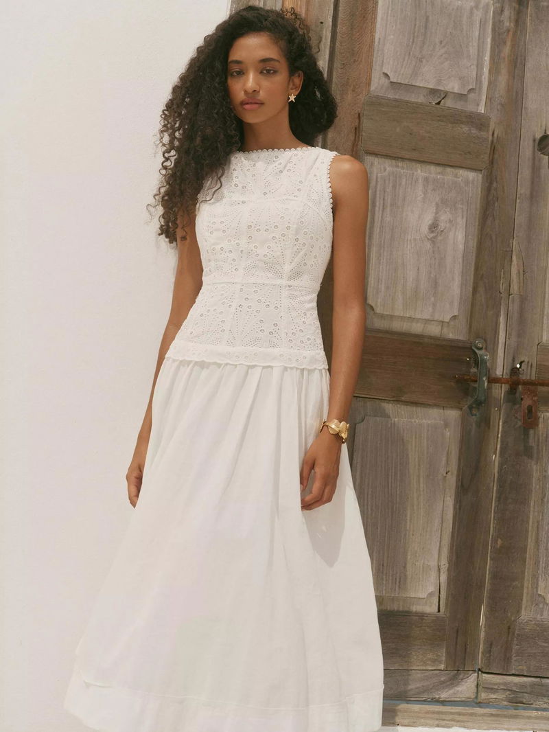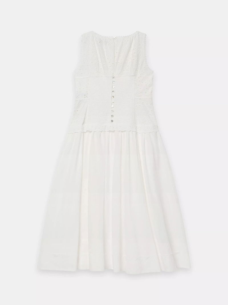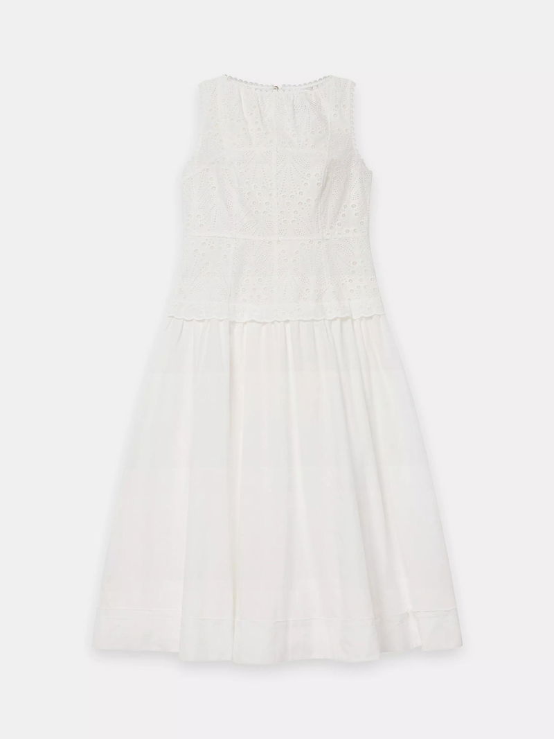 A broderié sleeveless dress featuring a crew neckline, dropped waistband, scallop trim, shirred back with a button fastening through the back.