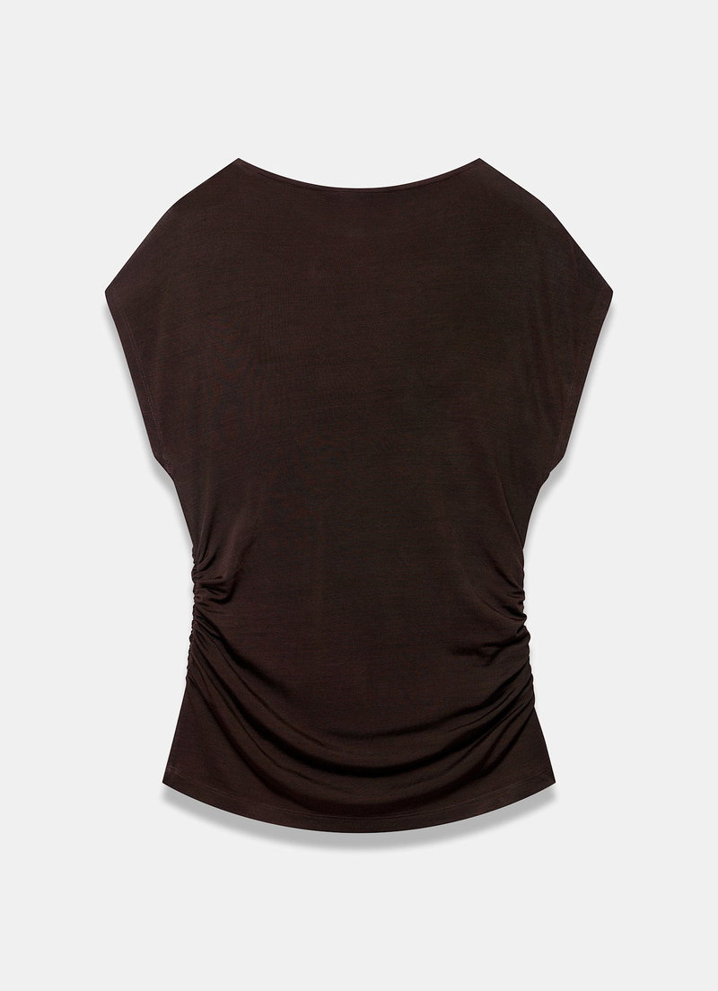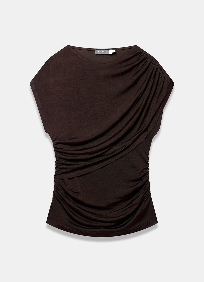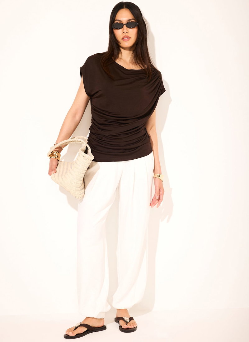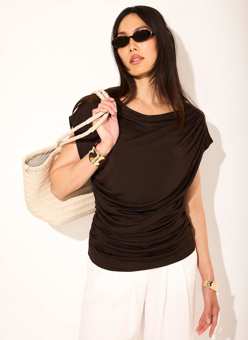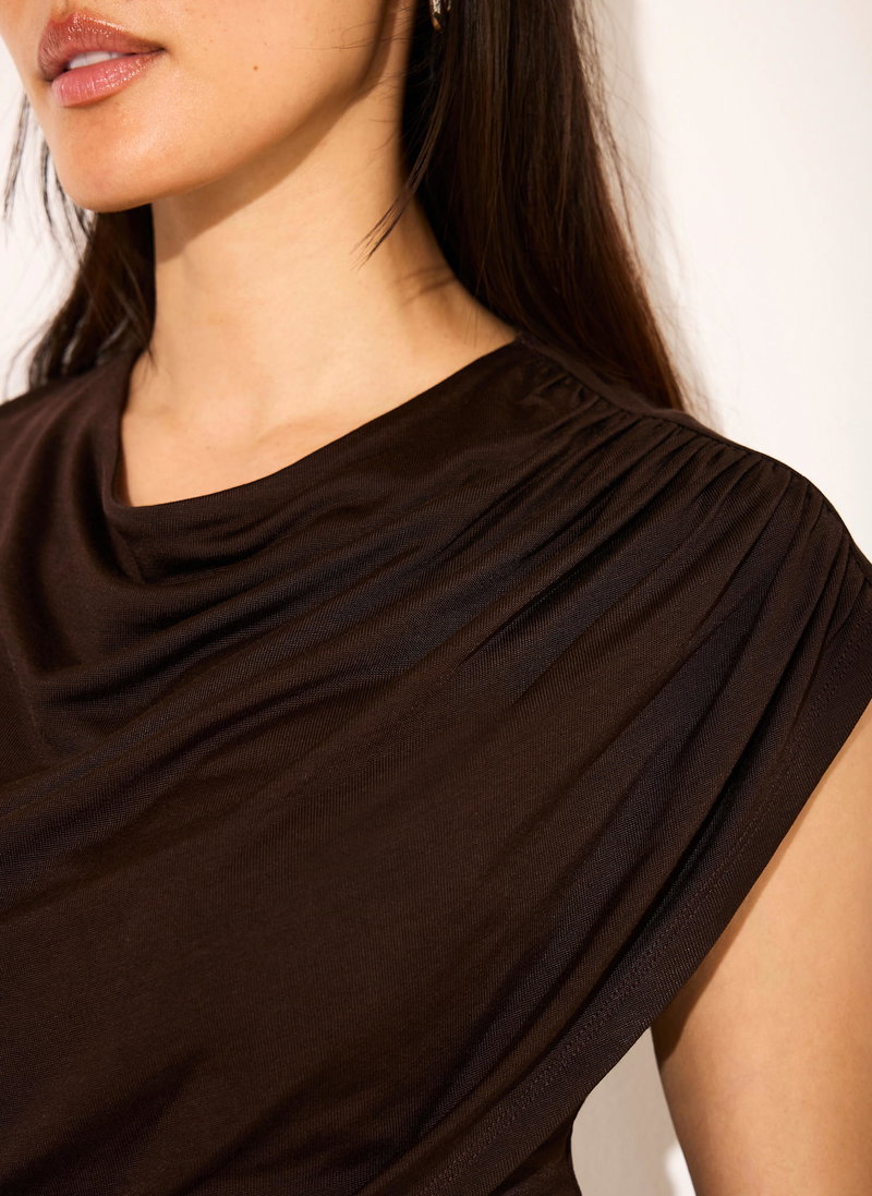 Brown top featuring a slash neckline, short sleeves and layered draped detailing.