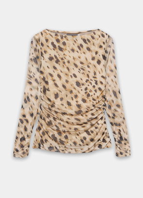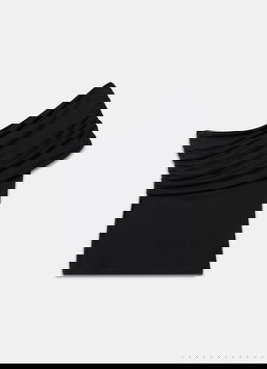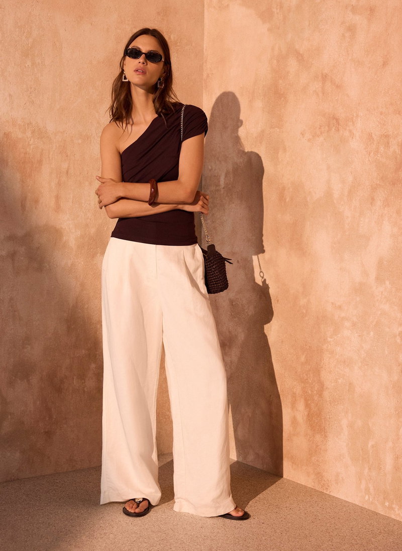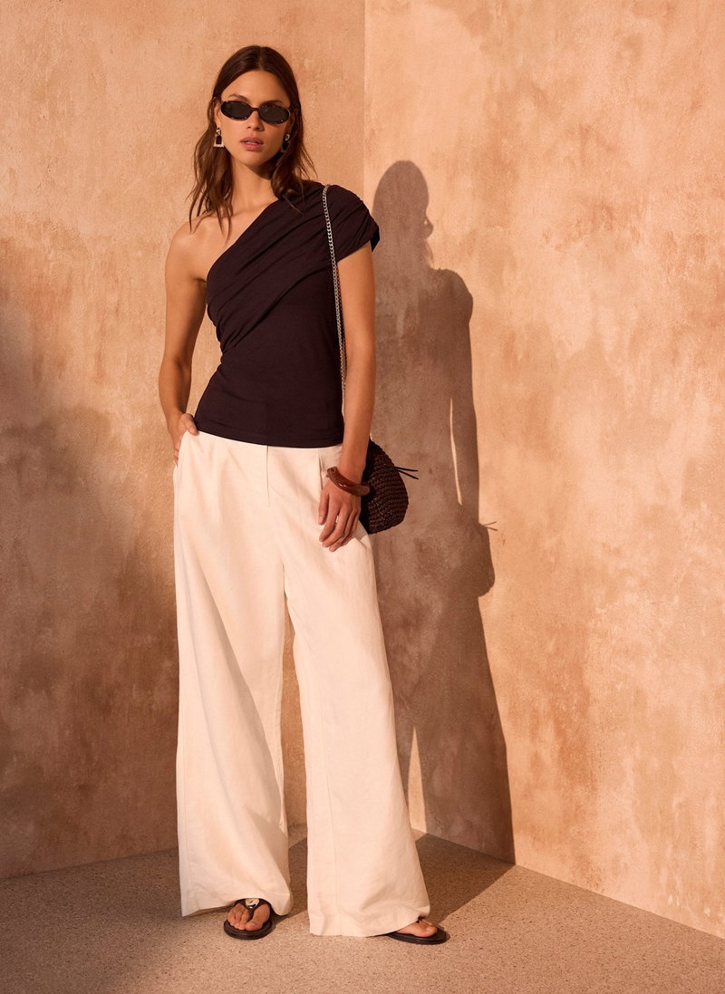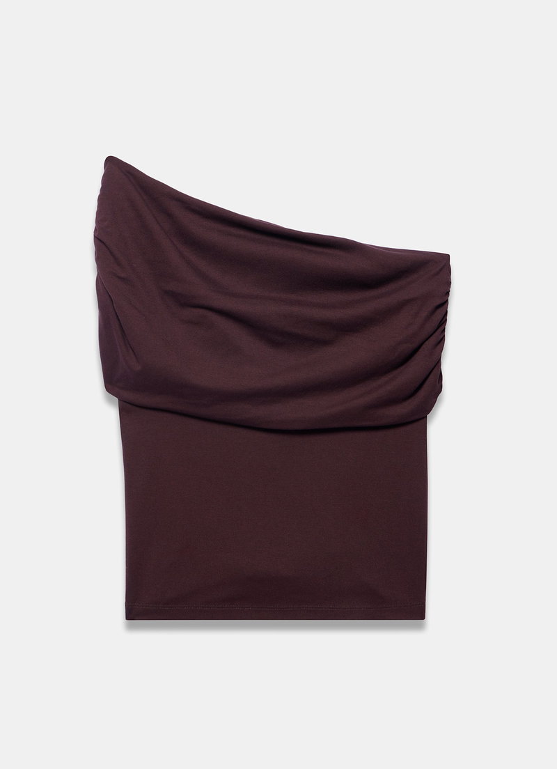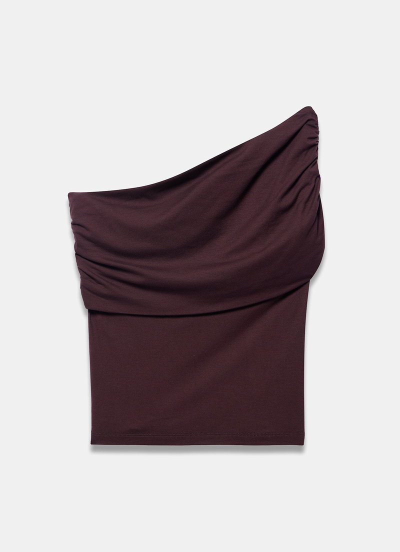 Brown one shoulder top featuring an asymmetric neckline with draped detailing.