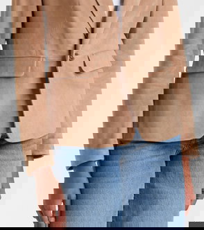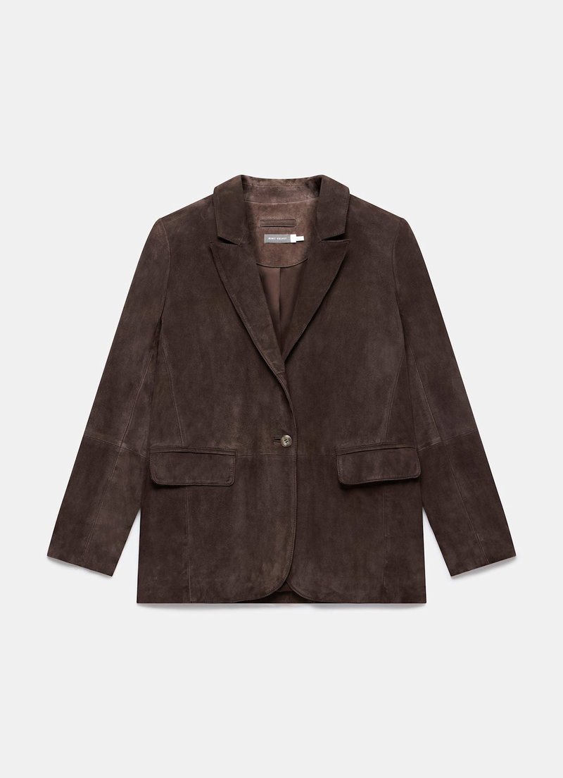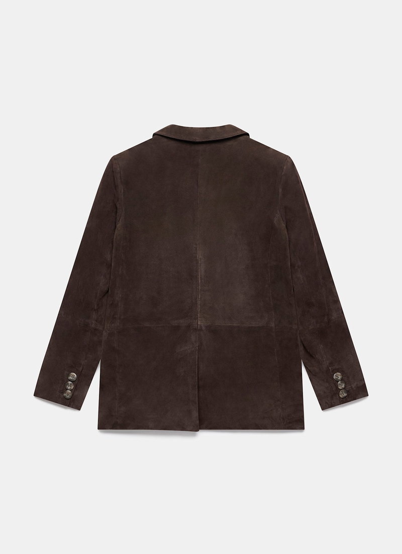 Brown tone suede, single breasted blazer featuring peaked lapels, long sleeves, flap pockets, buttoned cuffs, rear vent with a button fastening through the front. Fully lined.