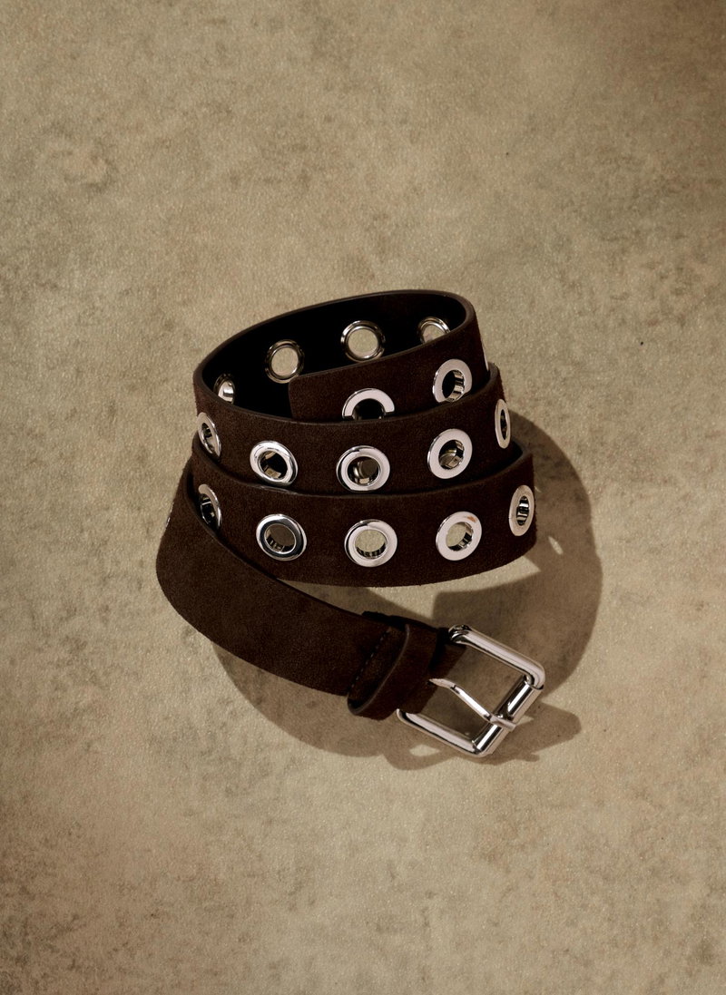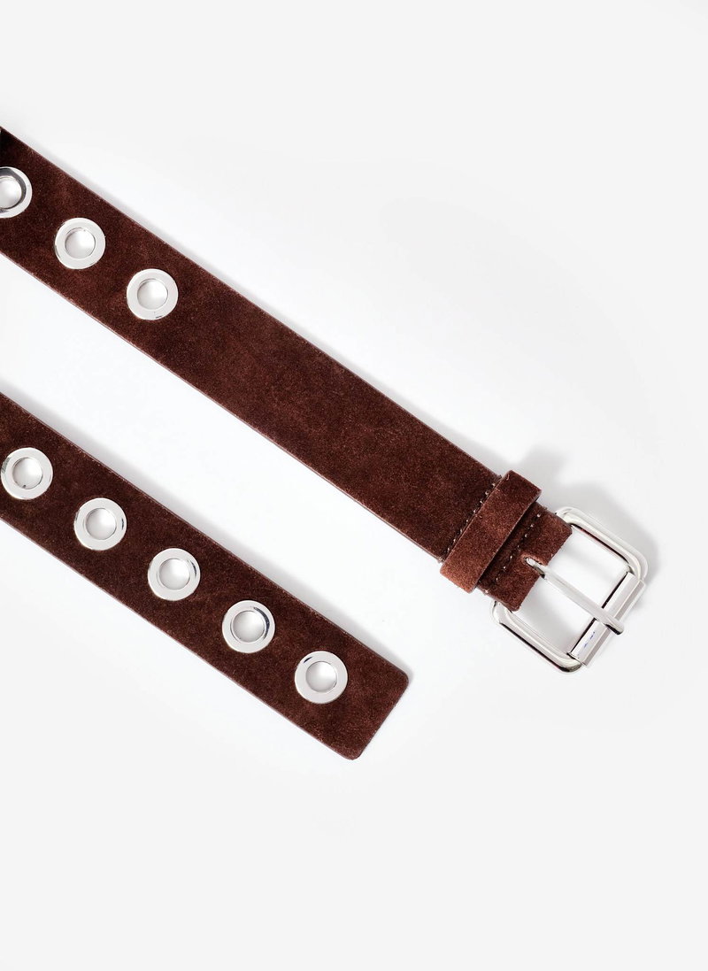 Brown suede belt featuring eyelet detailing and a silver-tone buckle fastening.