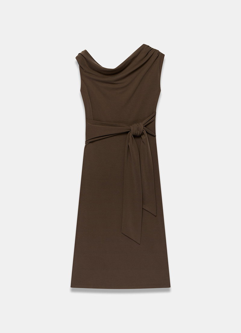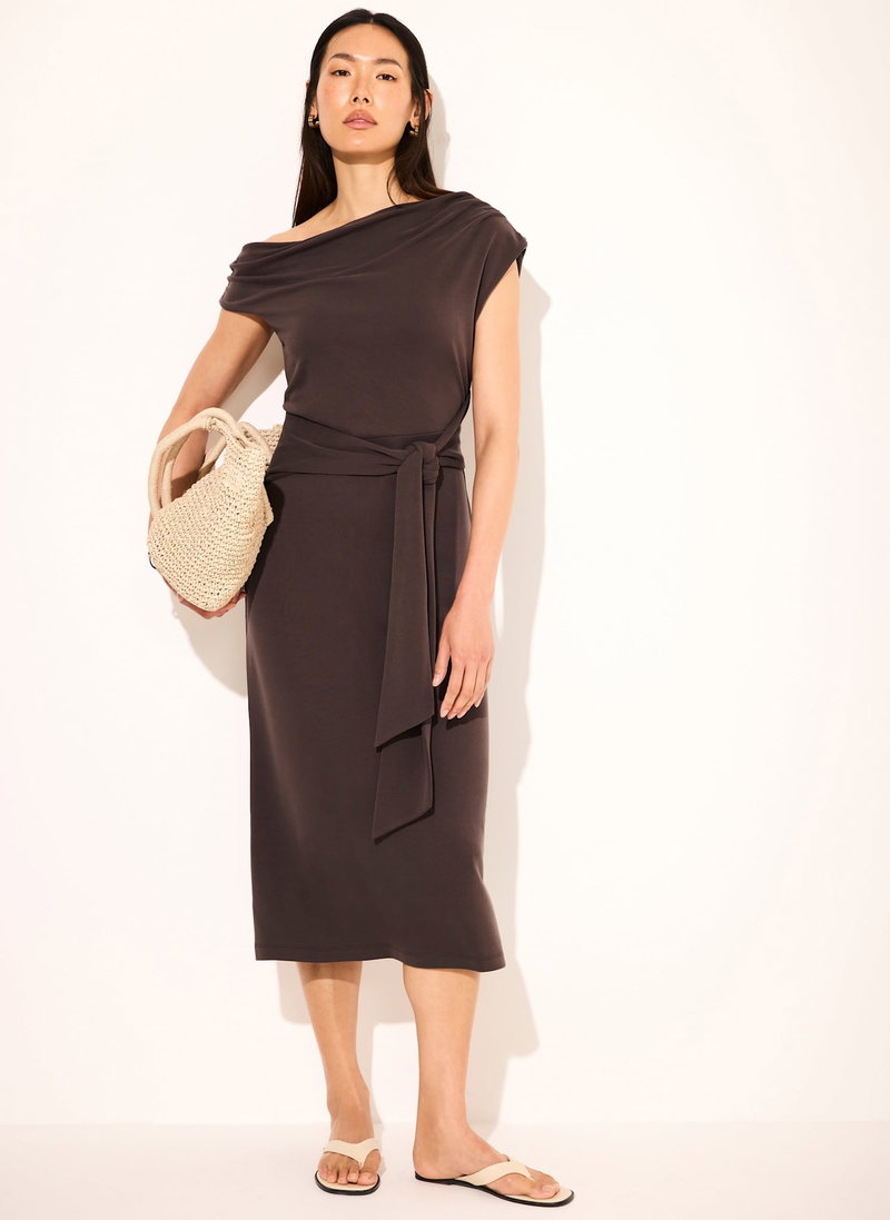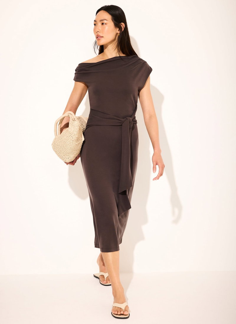 Brown jersey off-the-shoulder dress in a midi silhouette featuring, tie sash waistband and rear split.
