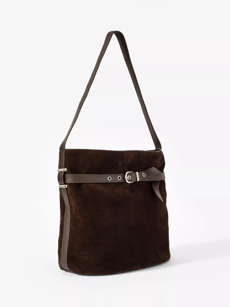 A suede bucket bag featuring a shoulder strap and metallic tone buckle strap detailing.
